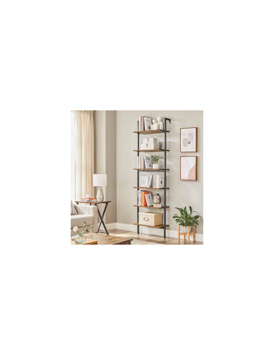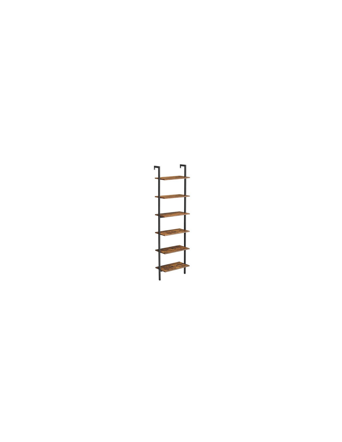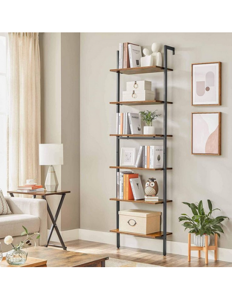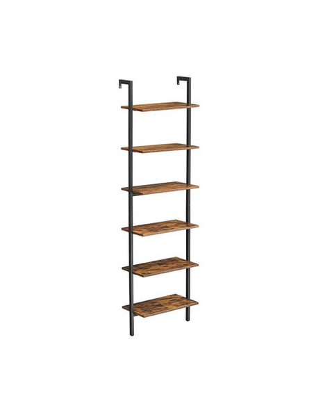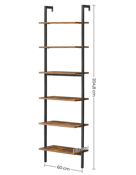 Reol udført i et design af sortlakeret metal og brun møbelplade. Reolen måler 204,8 cm i højden og 60 x 30 cm i bredde og dybde.