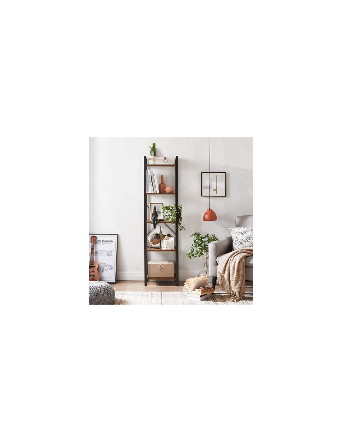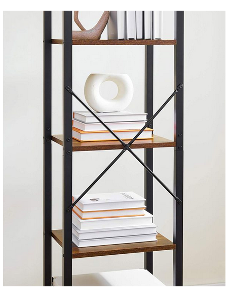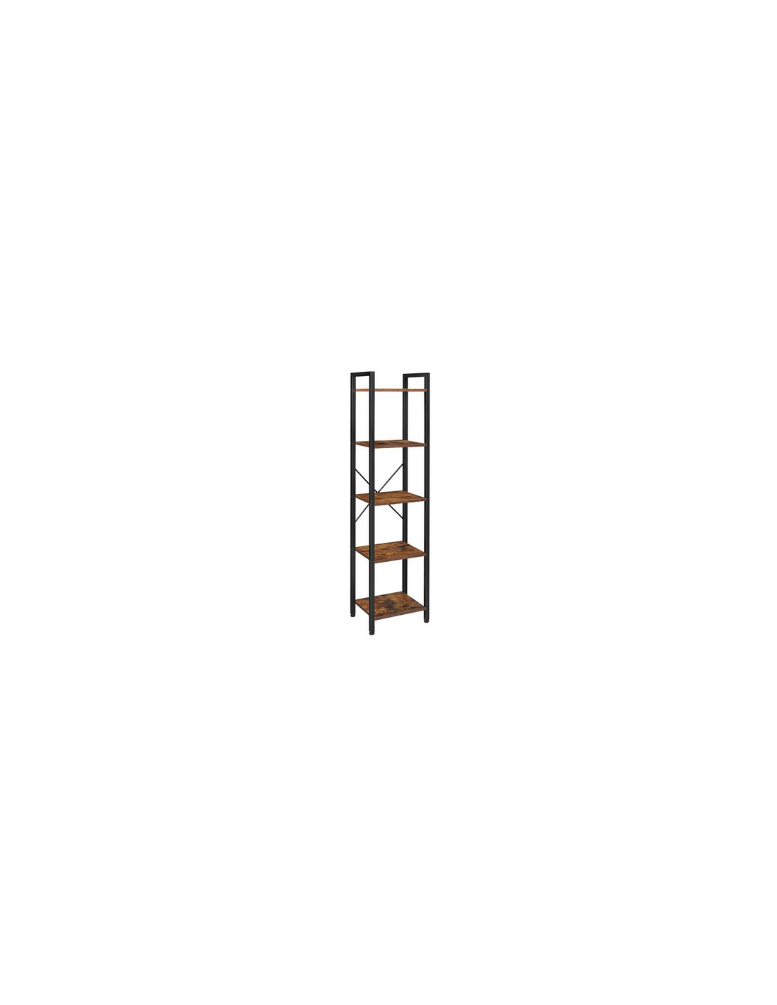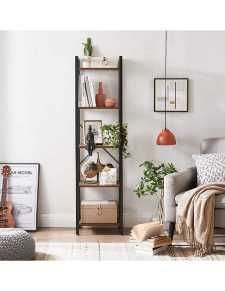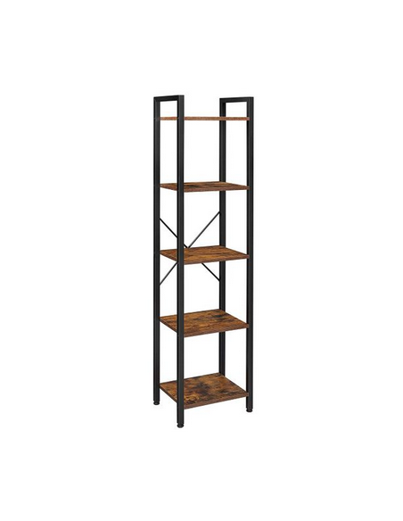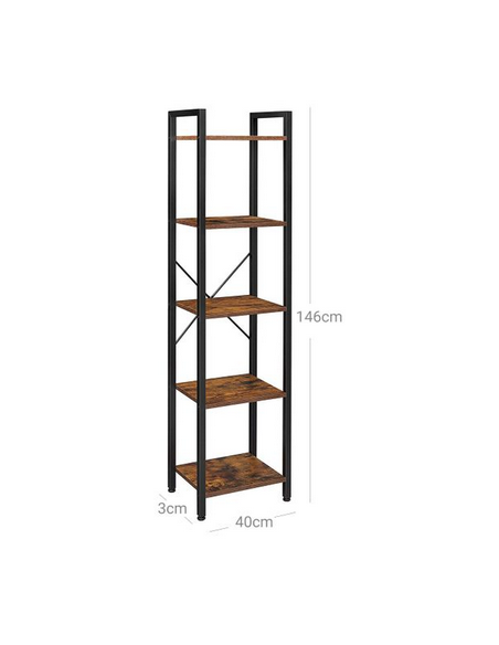 Reol udført i et design af sortlakeret metal og brun møbelplade. Reolen måler 146 cm i højden og 40 x 30 cm i bredde og dybde.