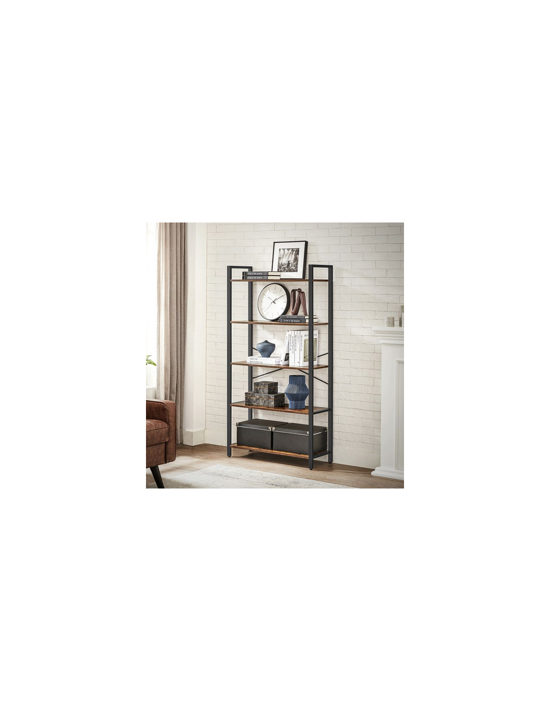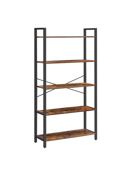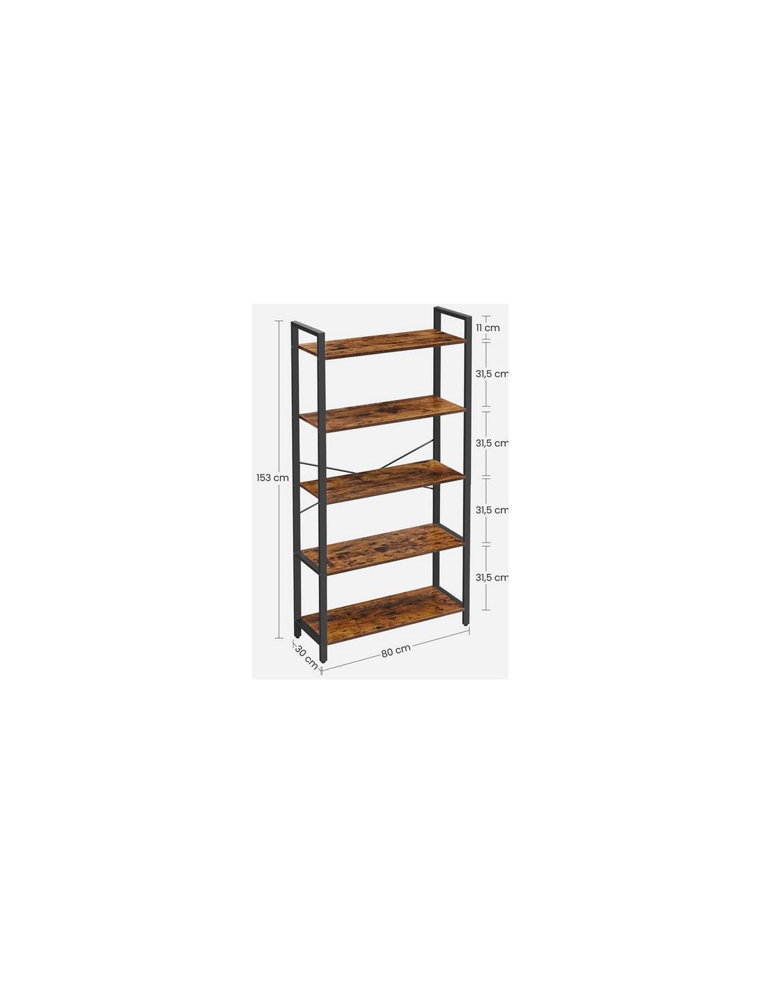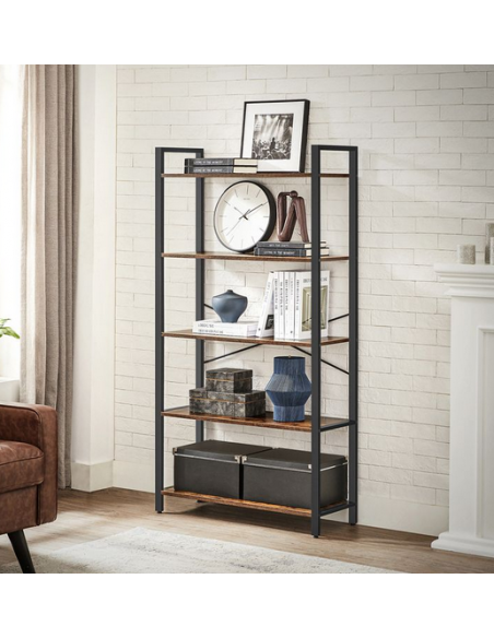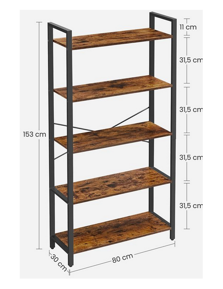 Reol udført i et design af sortlakeret metal og brun møbelplade. Reolen måler 153 cm i højden og 80 x 30 cm i bredde og dybde.