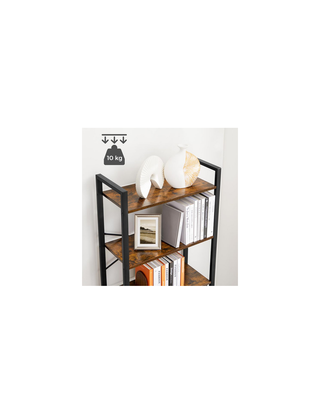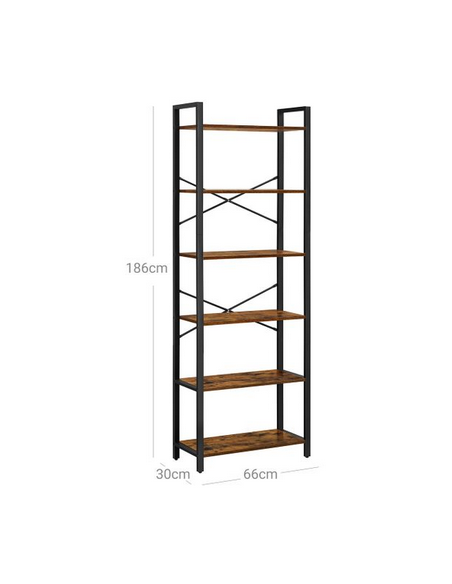 Reol udført i et design af sortlakeret metal og brun møbelplade. Reolen måler 186 cm i højden og 66 x 30 cm i bredde og dybde.