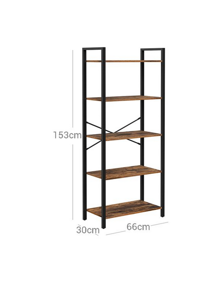 Reol udført i et design af sortlakeret metal og brun møbelplade. Reolen måler 153 cm i højden og 66 x 30 cm i bredde og dybde.