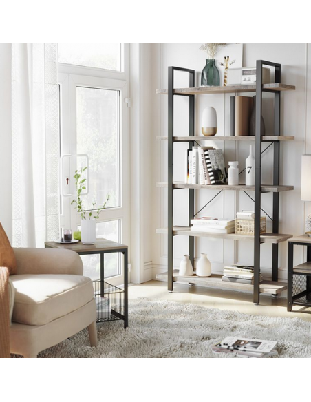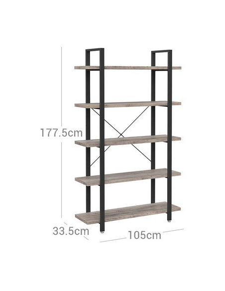 Bogreol udført i et design af sortlakeret metal og grå møbelplade. Reolen måler 177,5 cm i højden og 105 x 33,5 cm i bredde og dybde.