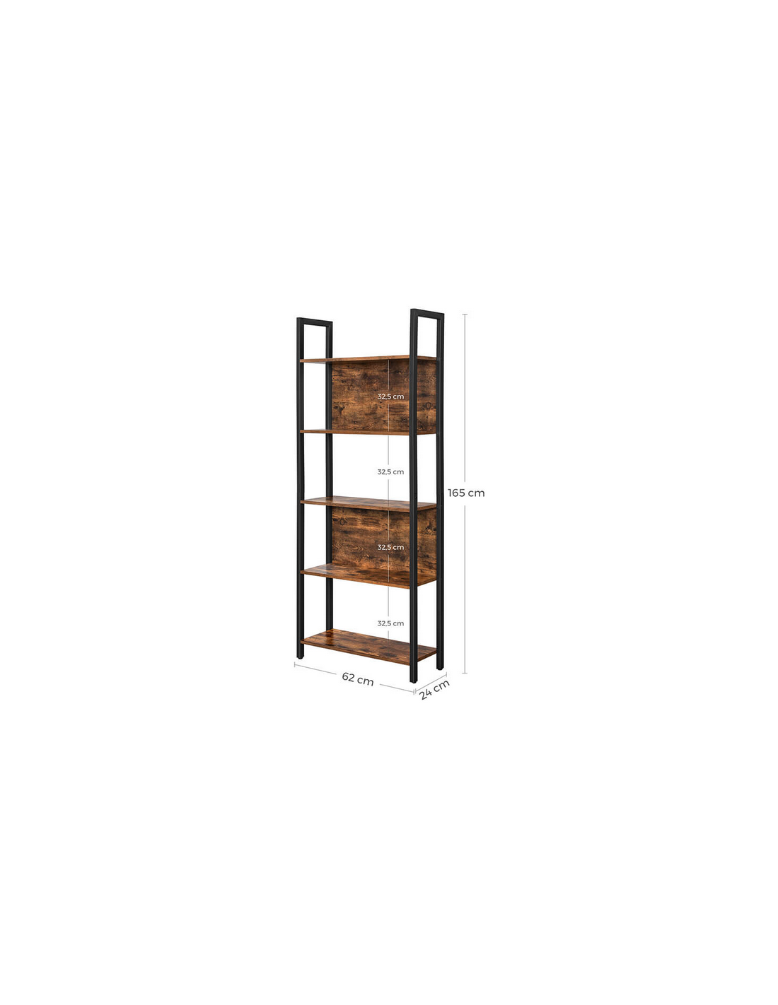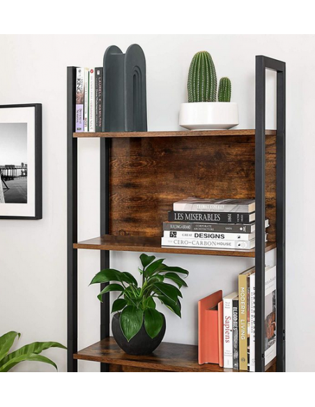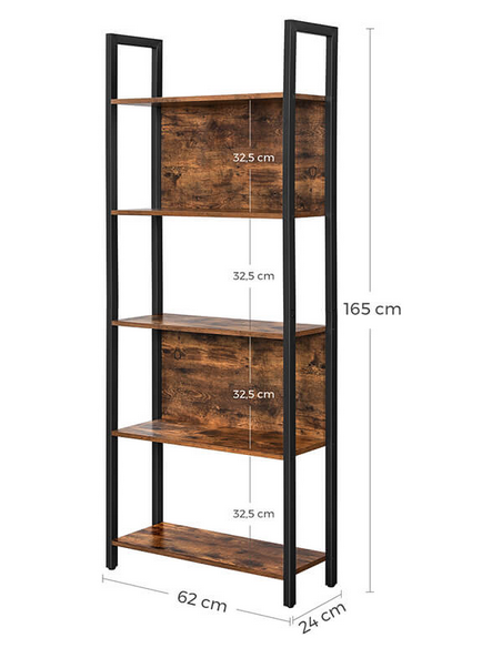 Bogreol udført i et design af sortlakeret metal og brun møbelplade. Reolen måler 165 cm i højden og 62 x 24 cm i bredde og dybde.
