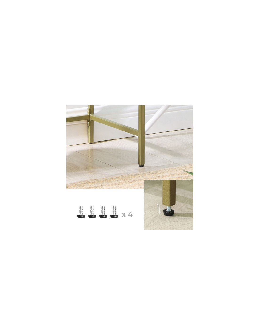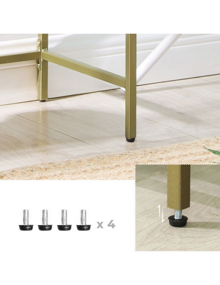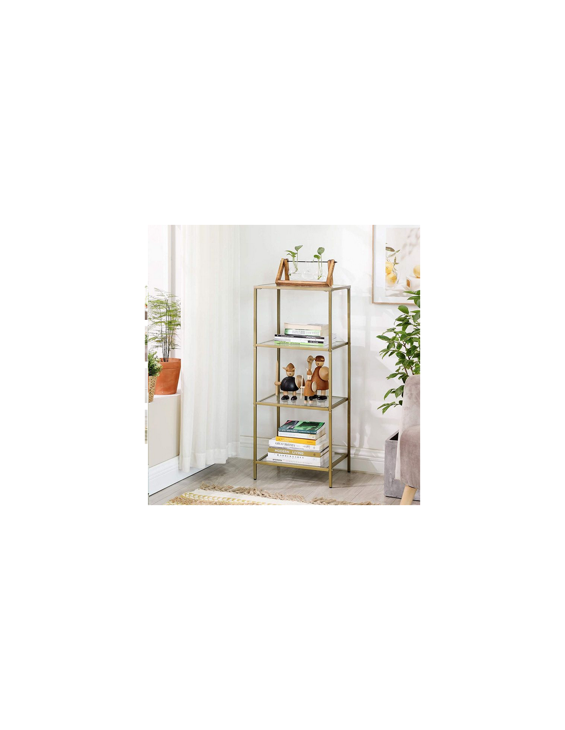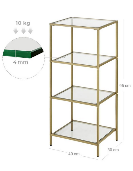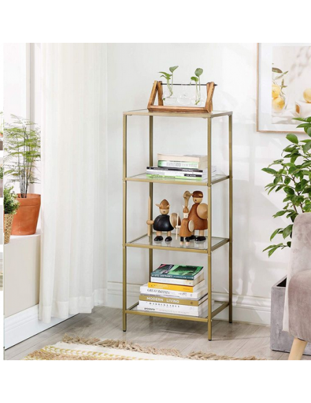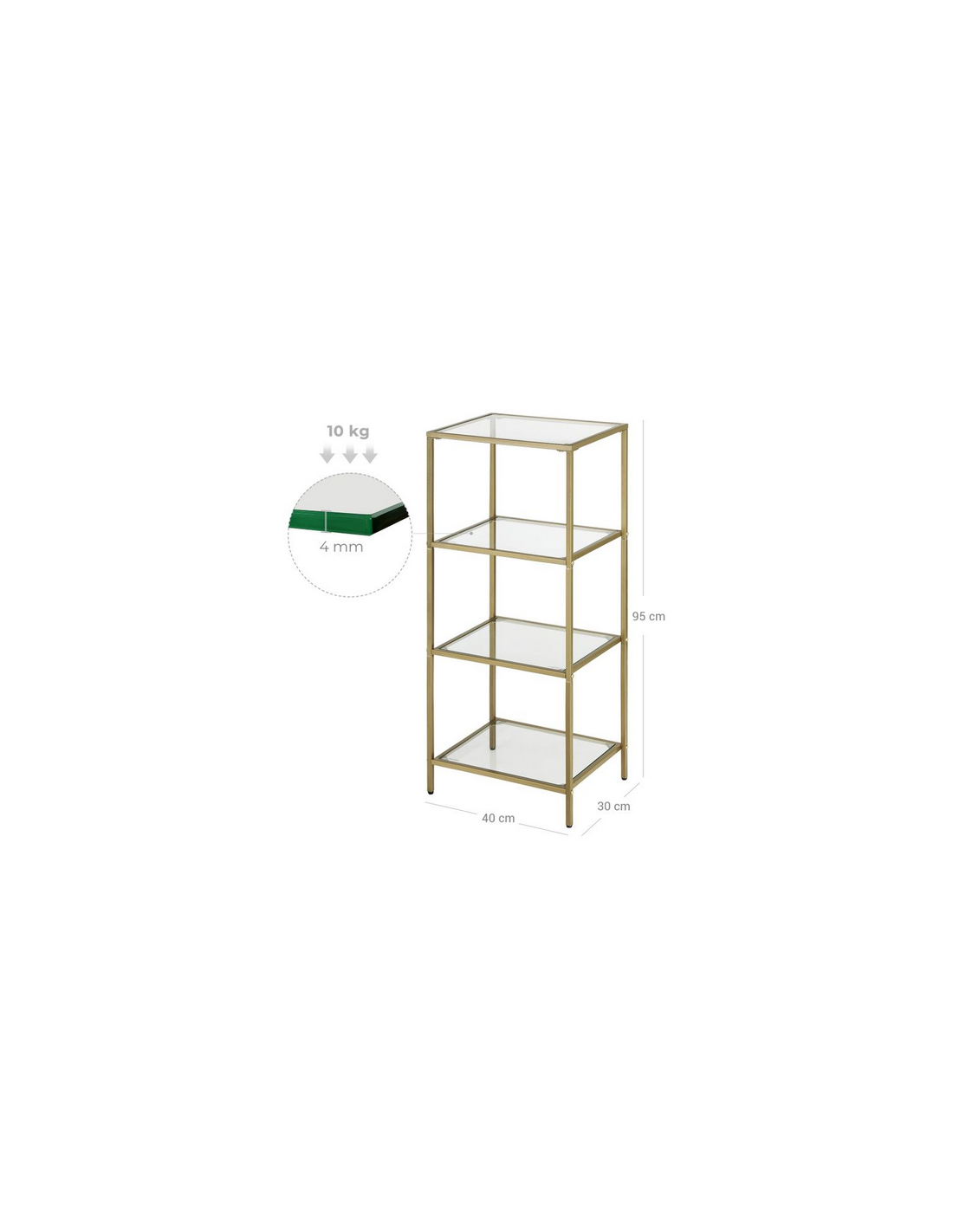 Reol udført i et design af guldfarvet metal og klart glas. Reolen måler 95 cm i højden og 40 x 30 cm i bredde og dybde.