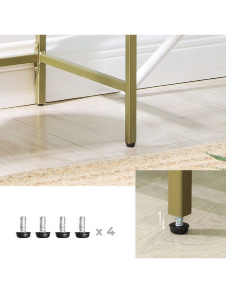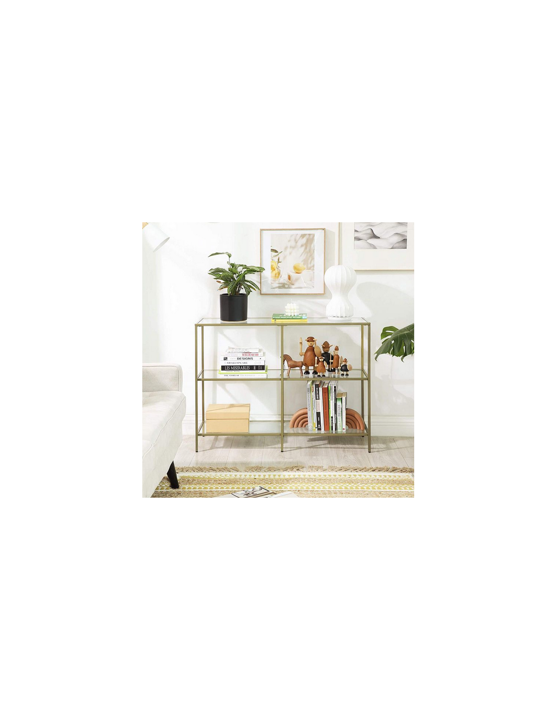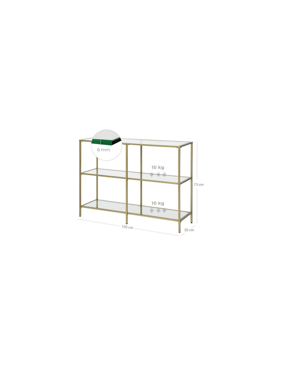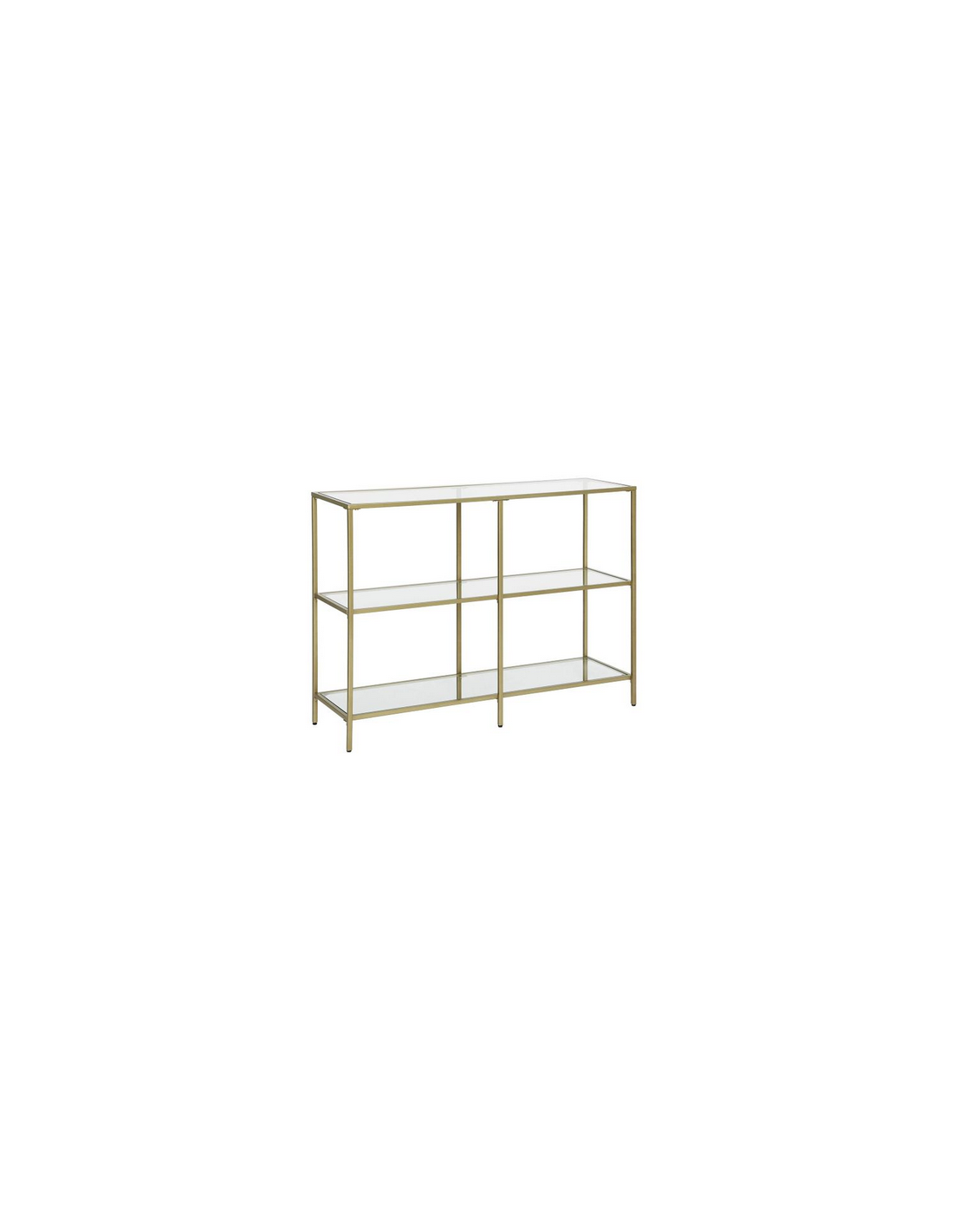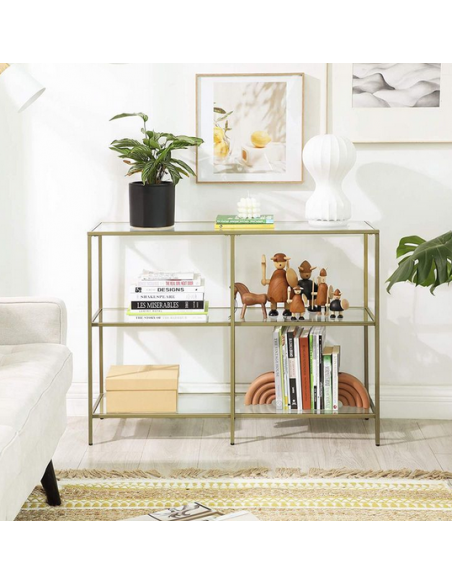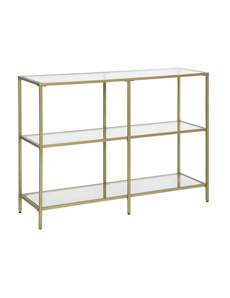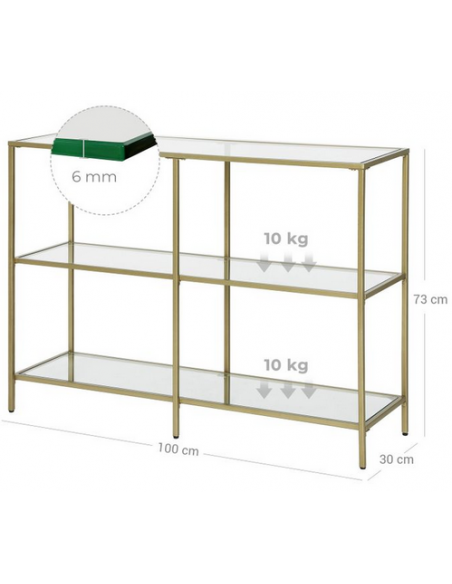Reol udført i et design af guldfarvet metal og klart glas. Reolen måler 73 cm i højden og 100 x 30 cm i bredde og dybde.