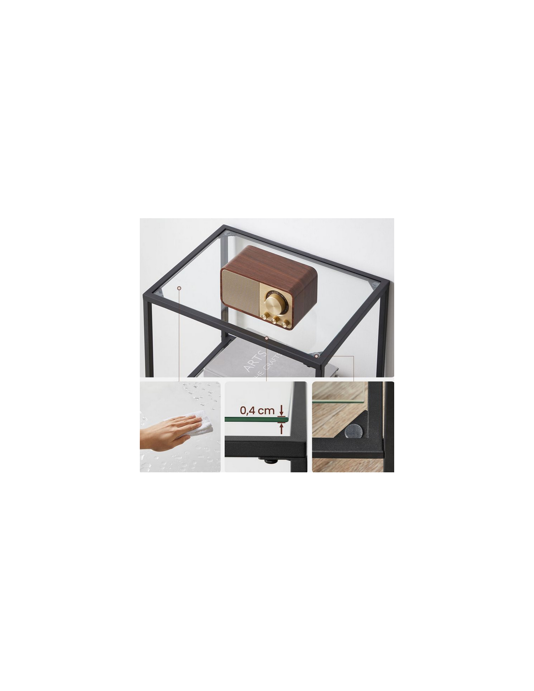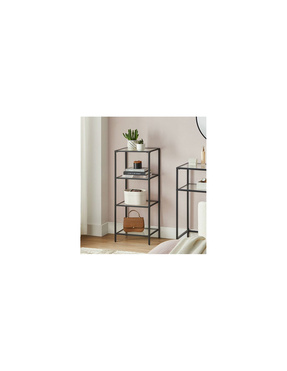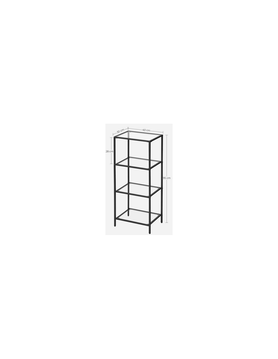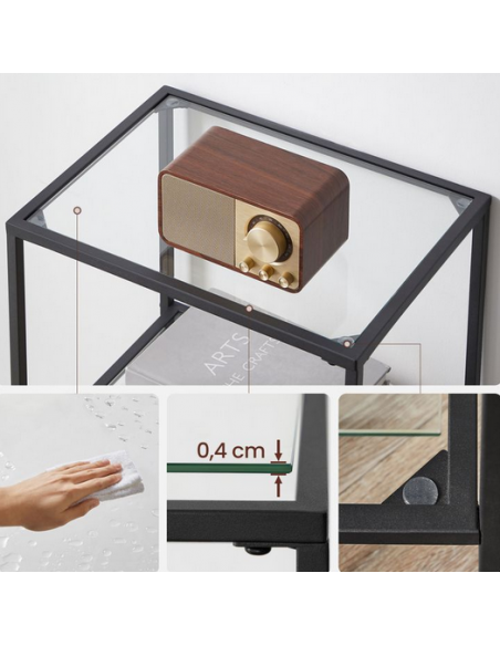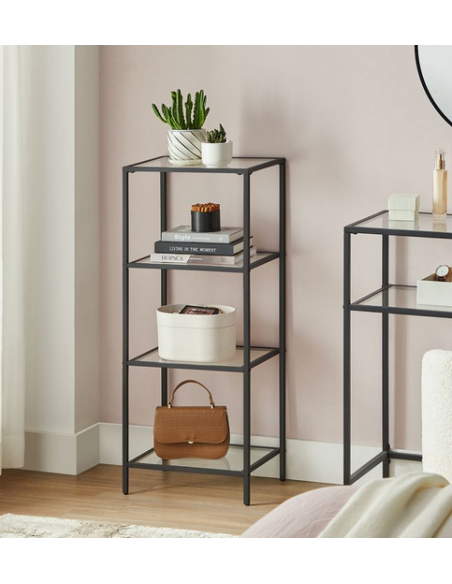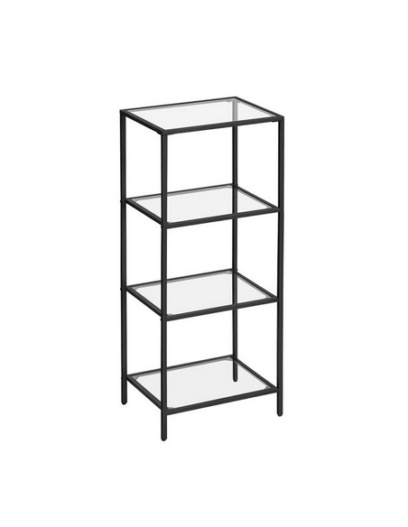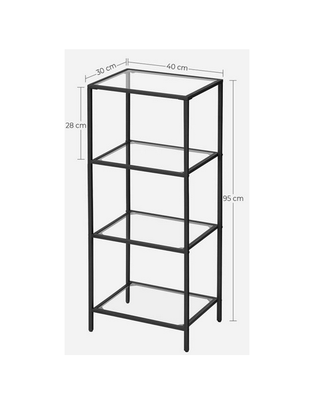 Reol udført i et design af sortlakeret metal og klart glas. Reolen måler 95 cm i højden og 40 x 30 cm i bredde og dybde.
