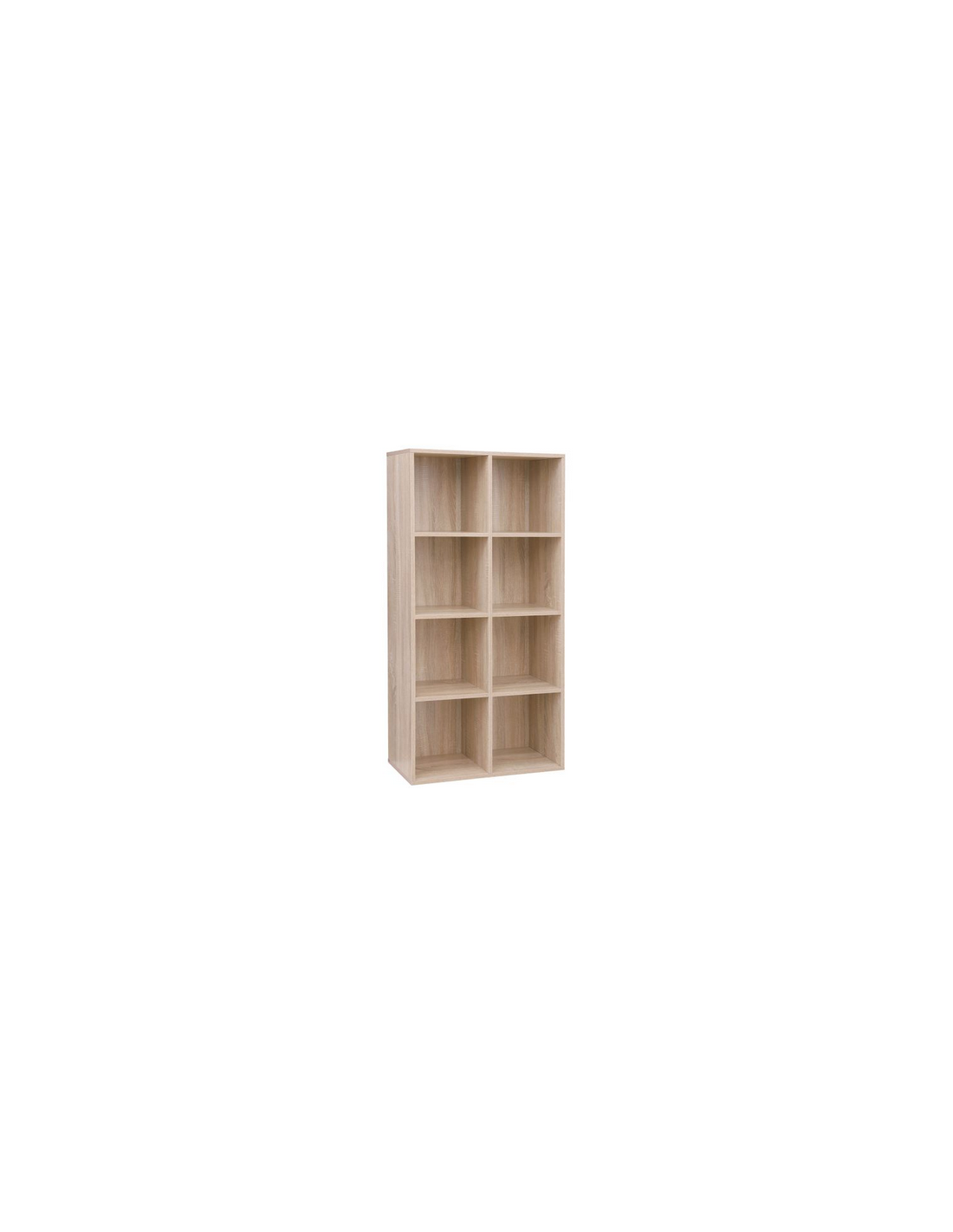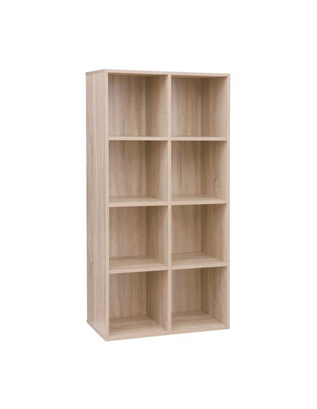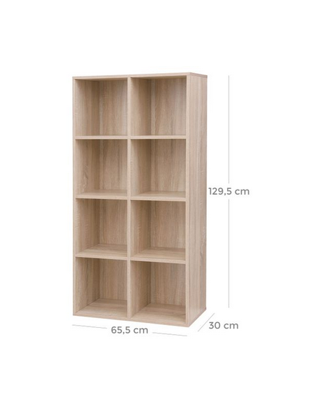 Reol udført i et design af naturfarvet møbelplade. Reolen måler 129,5 cm i højden og 65,5 x 30 cm i bredde og dybde.