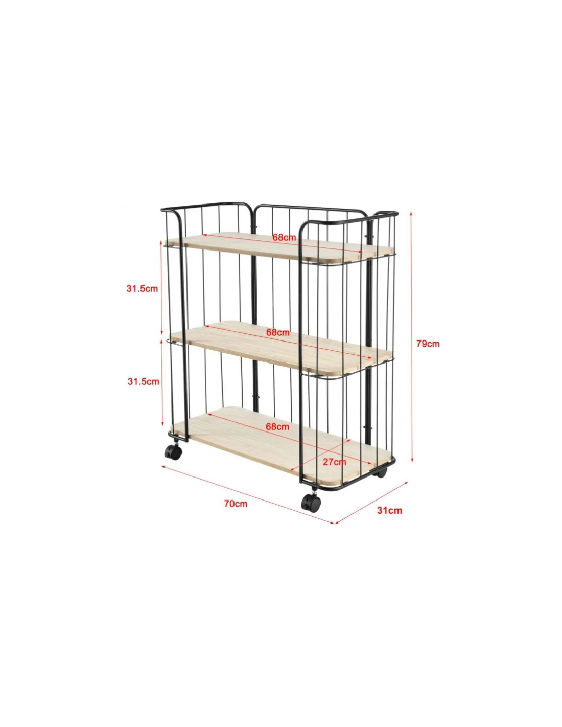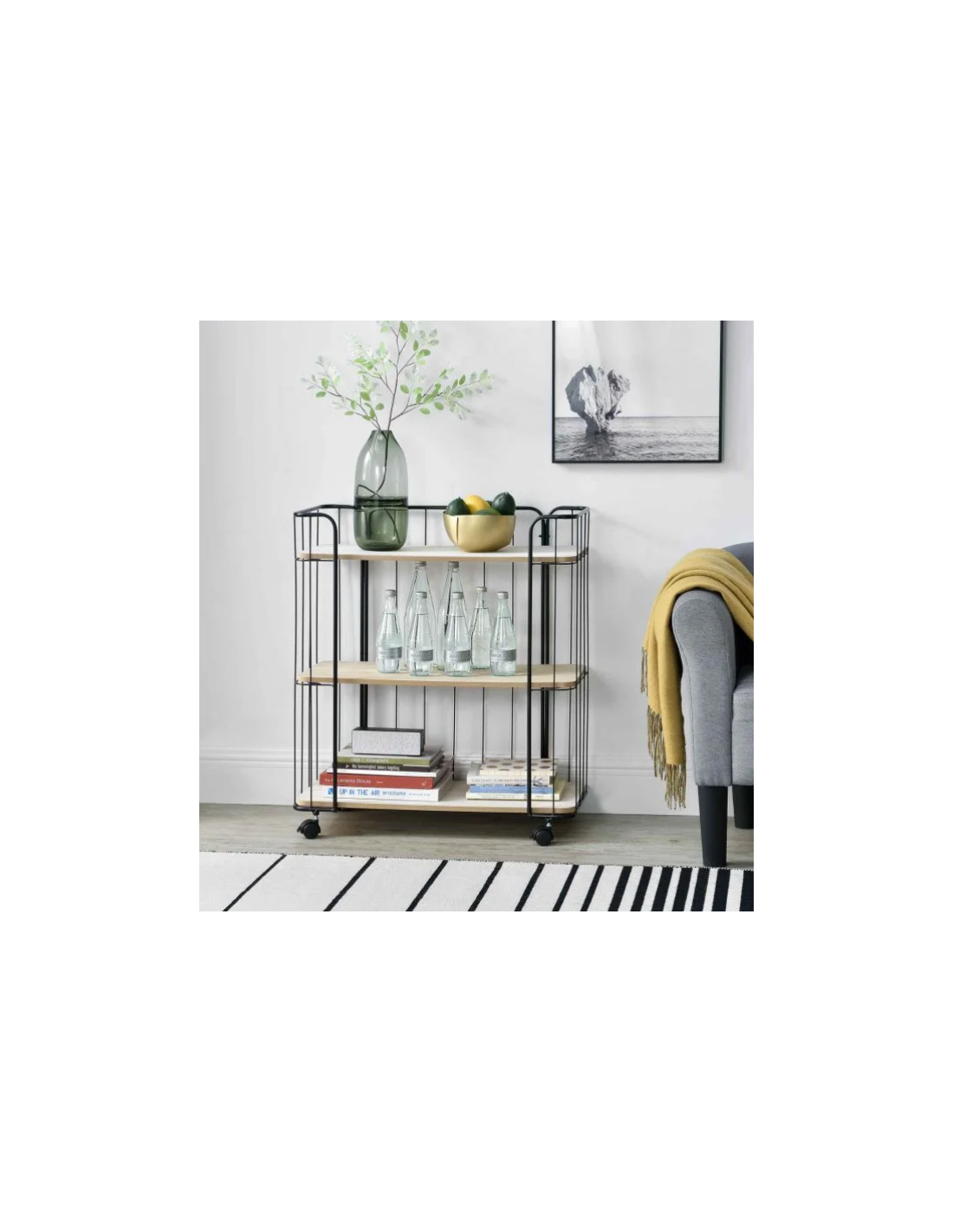 Reol på hjul, udført i et design af sortlakeret metal og naturfarvet mdf. Reolen måler 79 cm i højden og 70 x 31 cm i bredde og dybde.