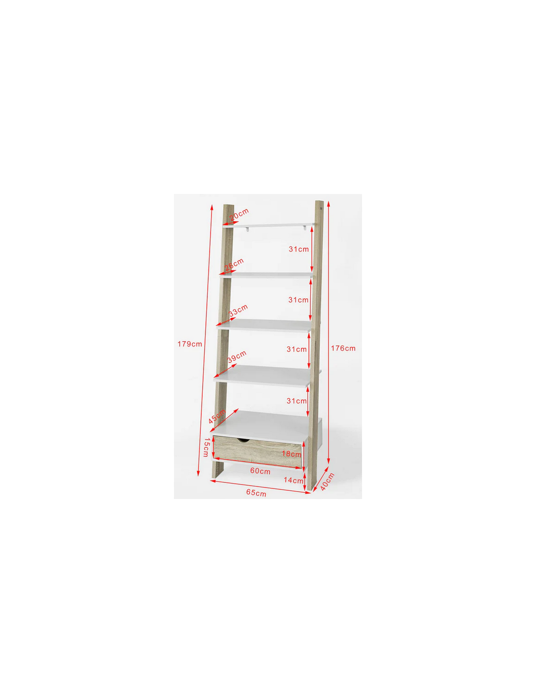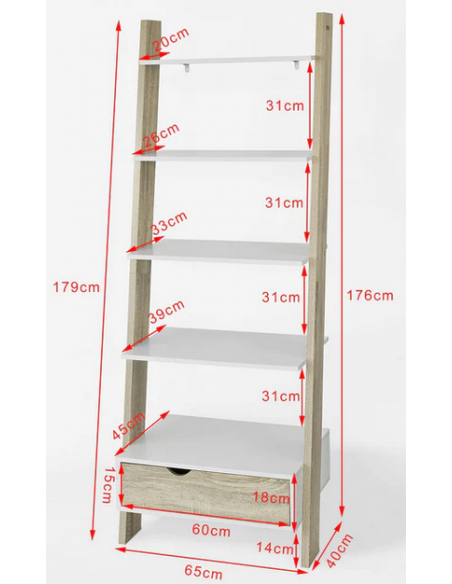 Reol udført i et design af mdf og møbelplade. Reolen måler 176 cm i højden og 65 x 45 cm i bredde og dybde.