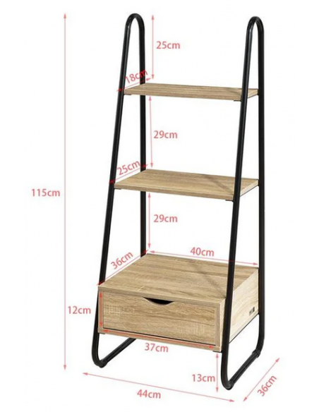 Reol udført i et design af metal og møbelplade. Reolen måler 115 cm i højden og 44 x 36 cm i bredde og dybde.