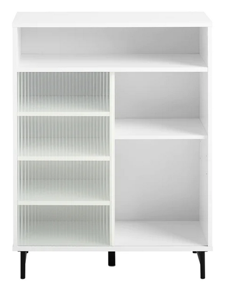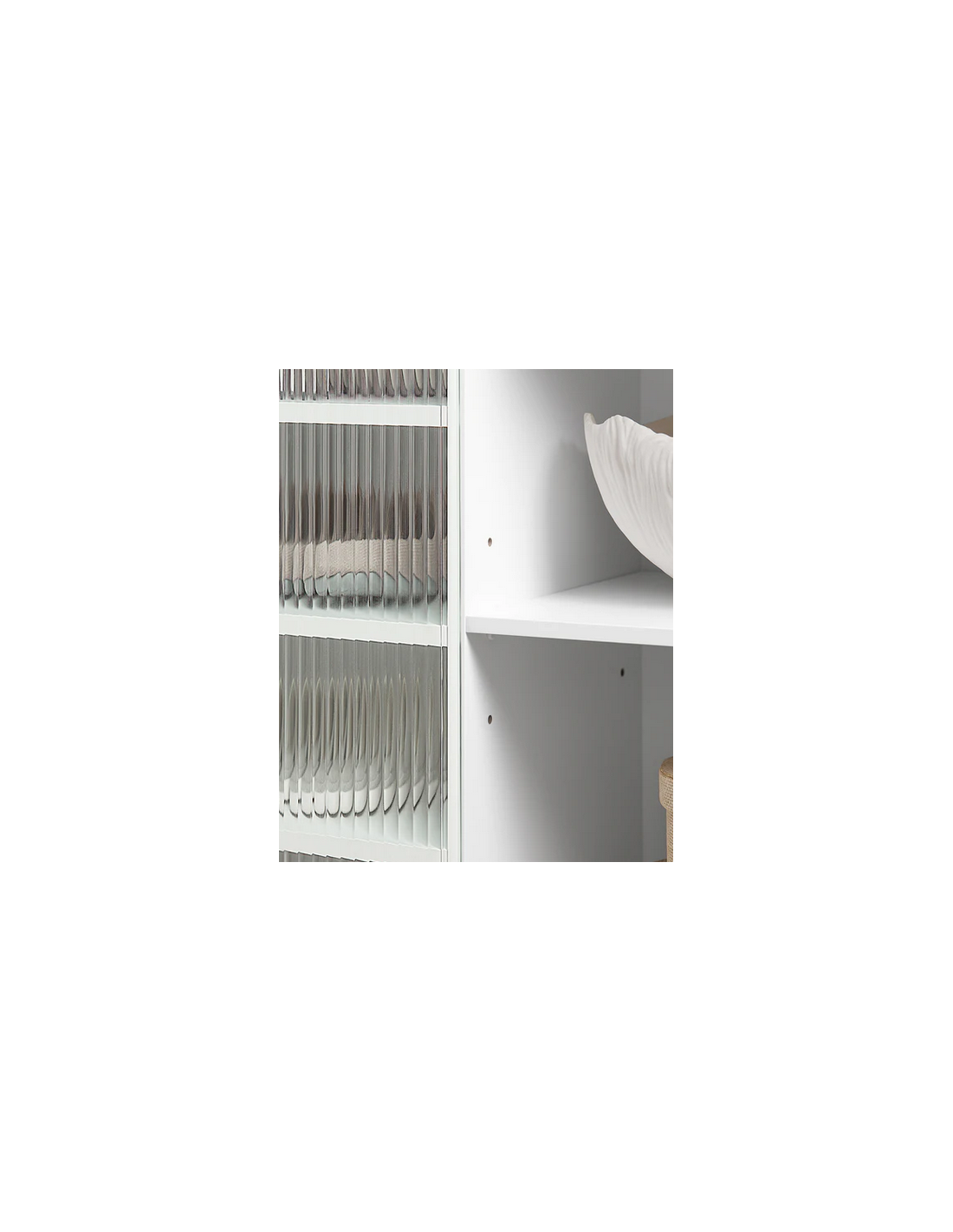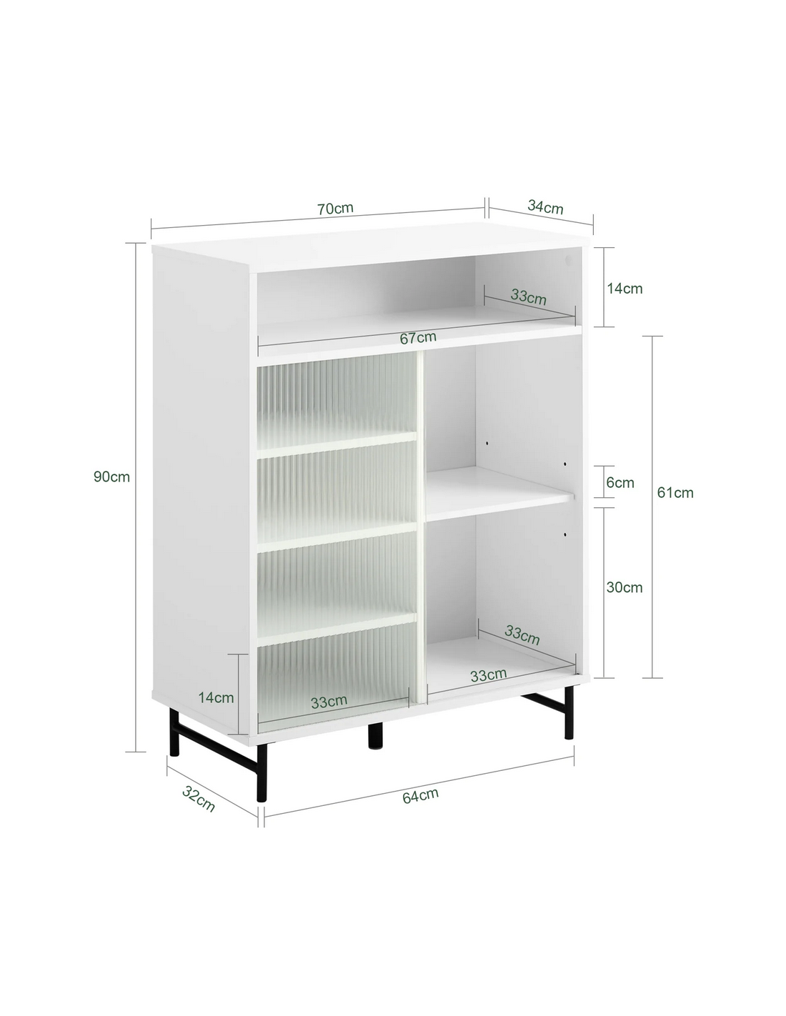 Reol med skydelåge, udført i et design af metal og møbelplade. Reolen måler 90 cm i højden og 70 x 34 cm i bredde og dybde.
