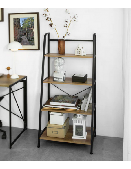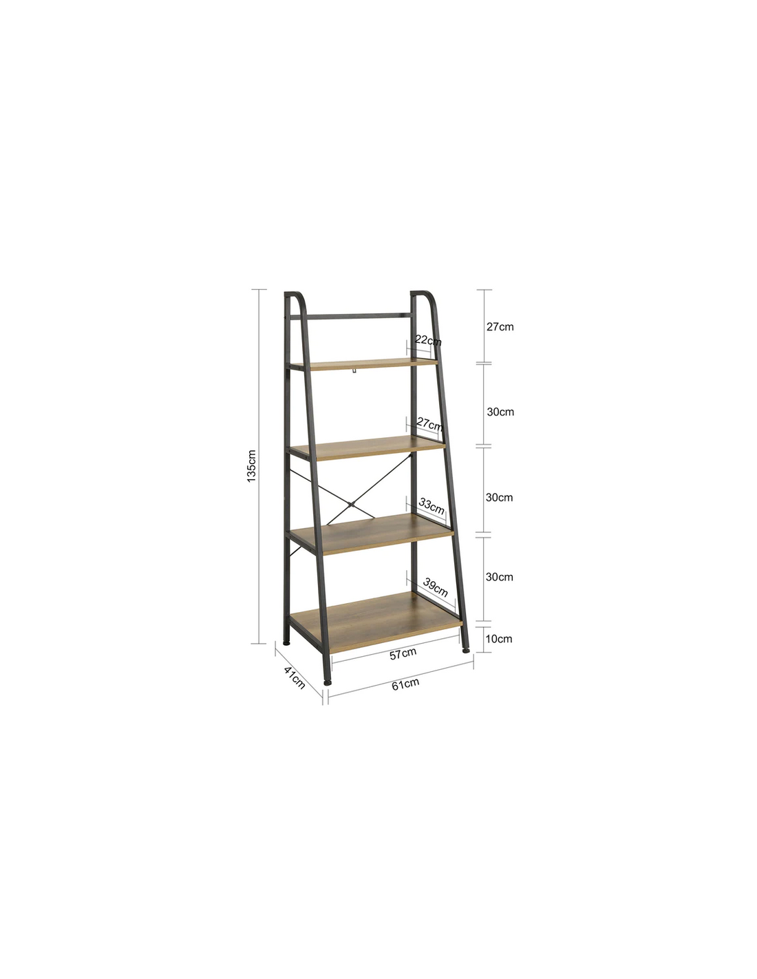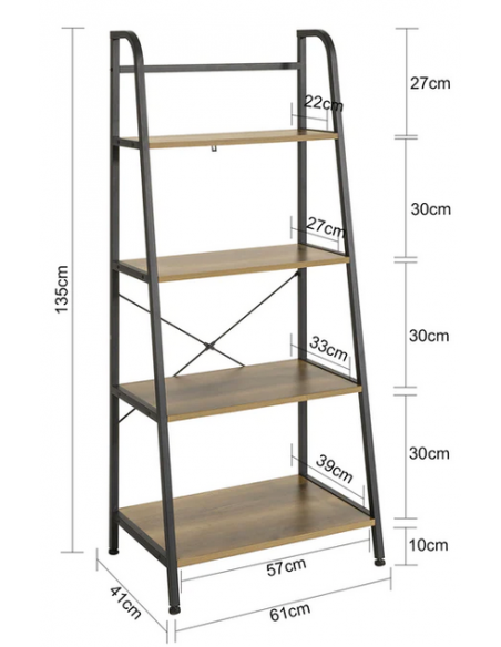 Reol udført i et design af metal og møbelplade. Reolen måler 135 cm i højden og 61 x 41 cm i bredde og dybde.