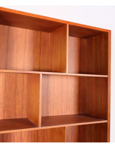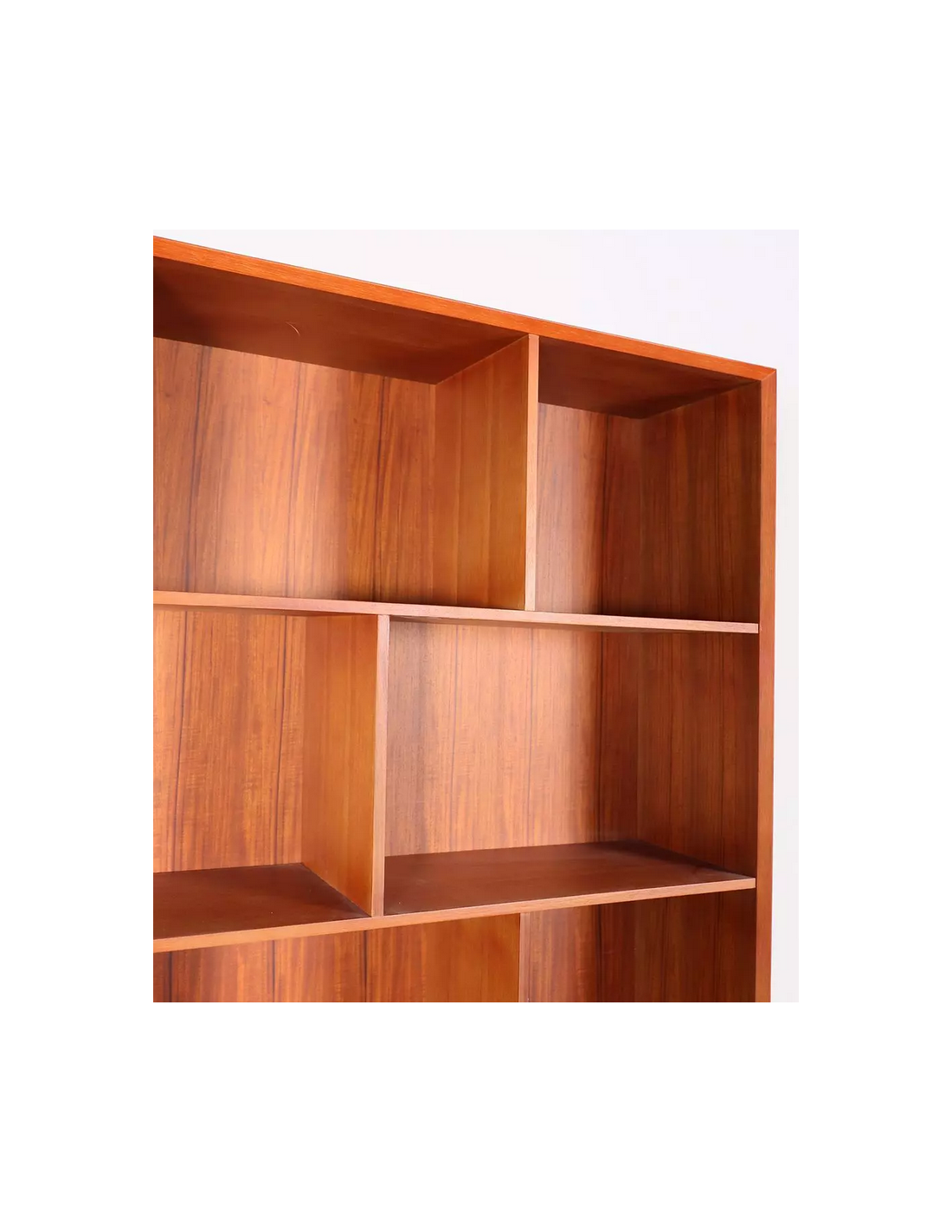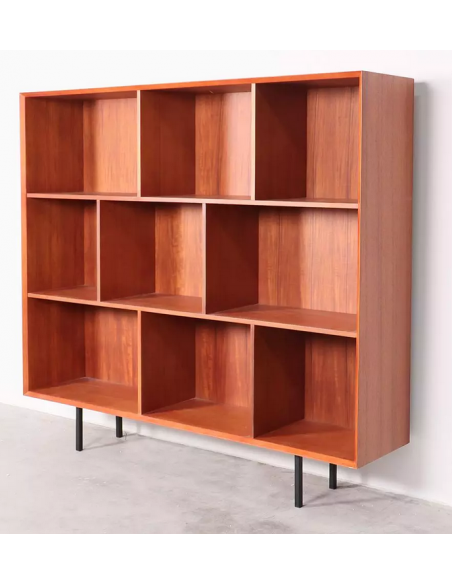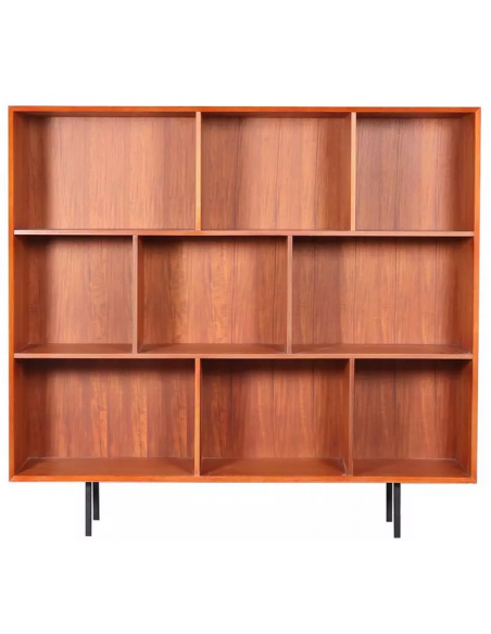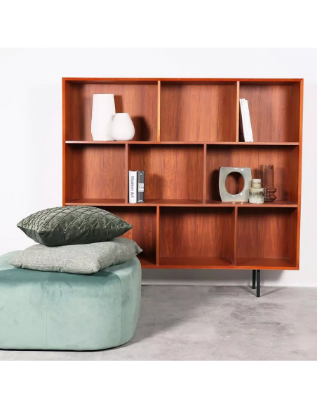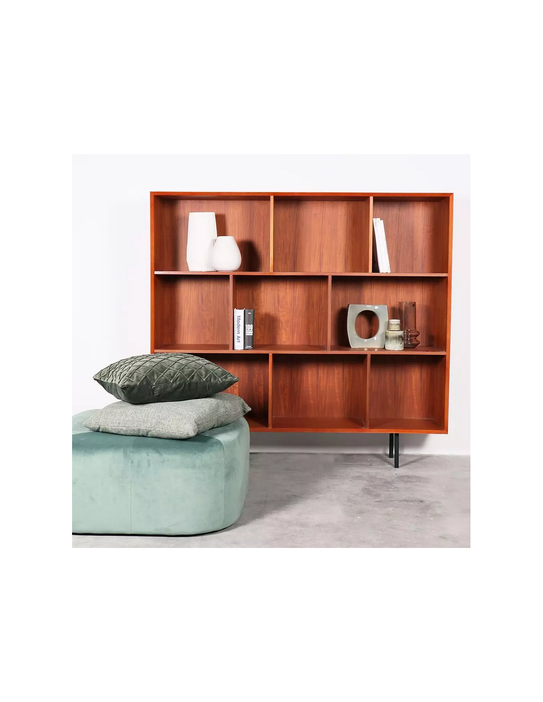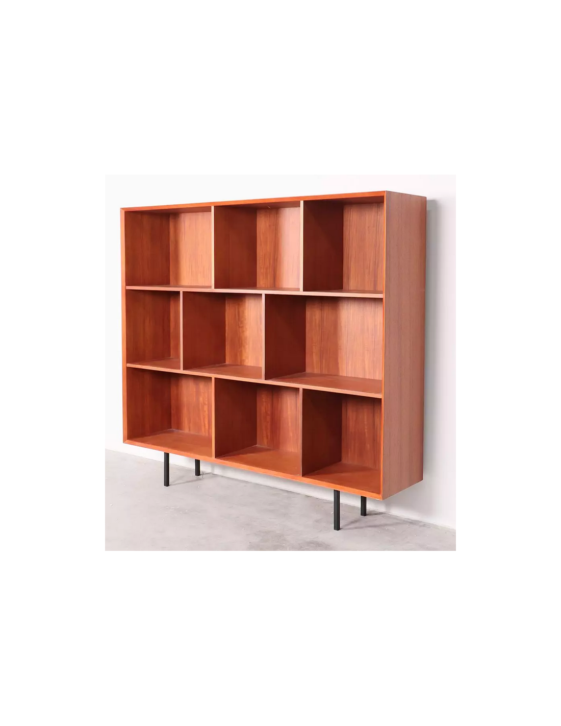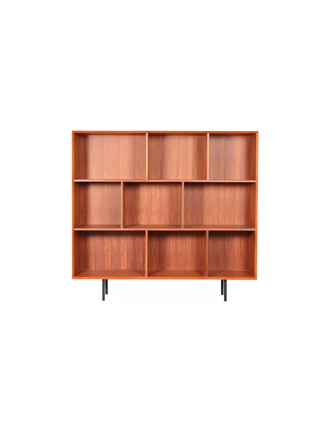 Reol udført i et design af sortlakeret metal og teaktræsfinér. Reolen måler 120 cm i højden og 150 x 35 cm i bredde og dybde.