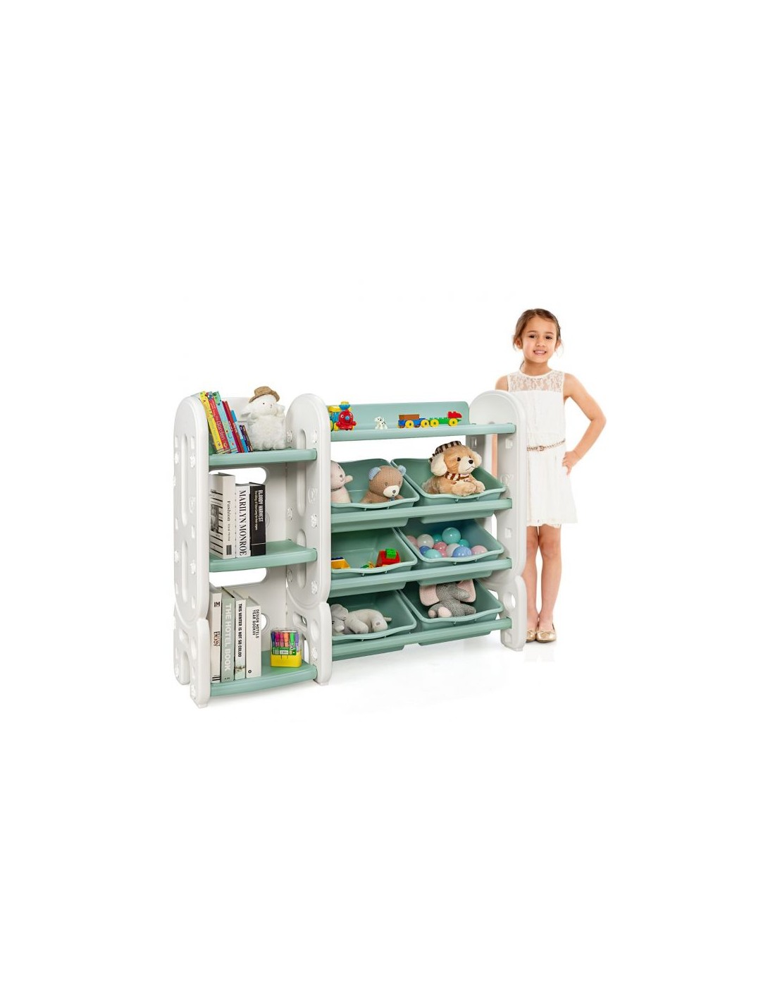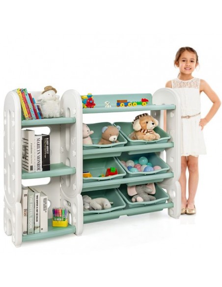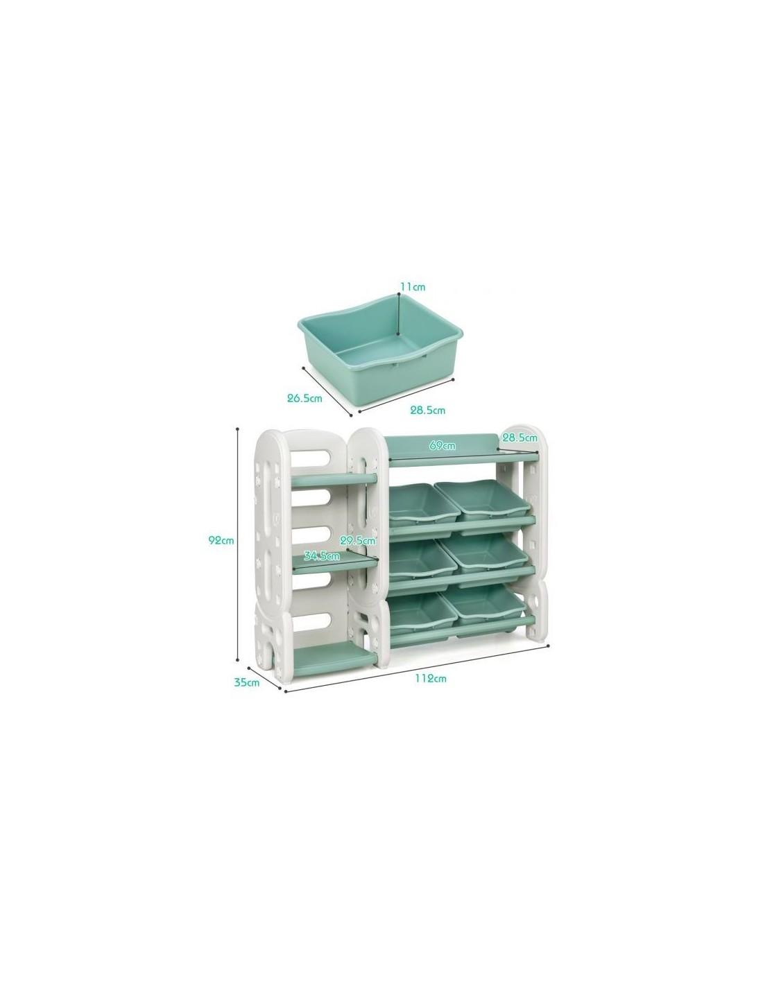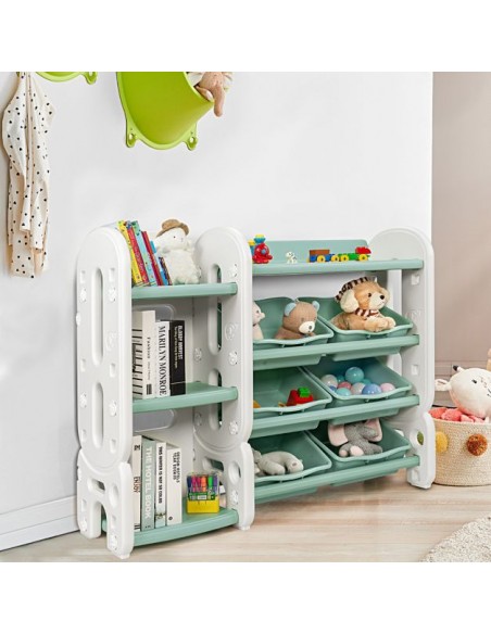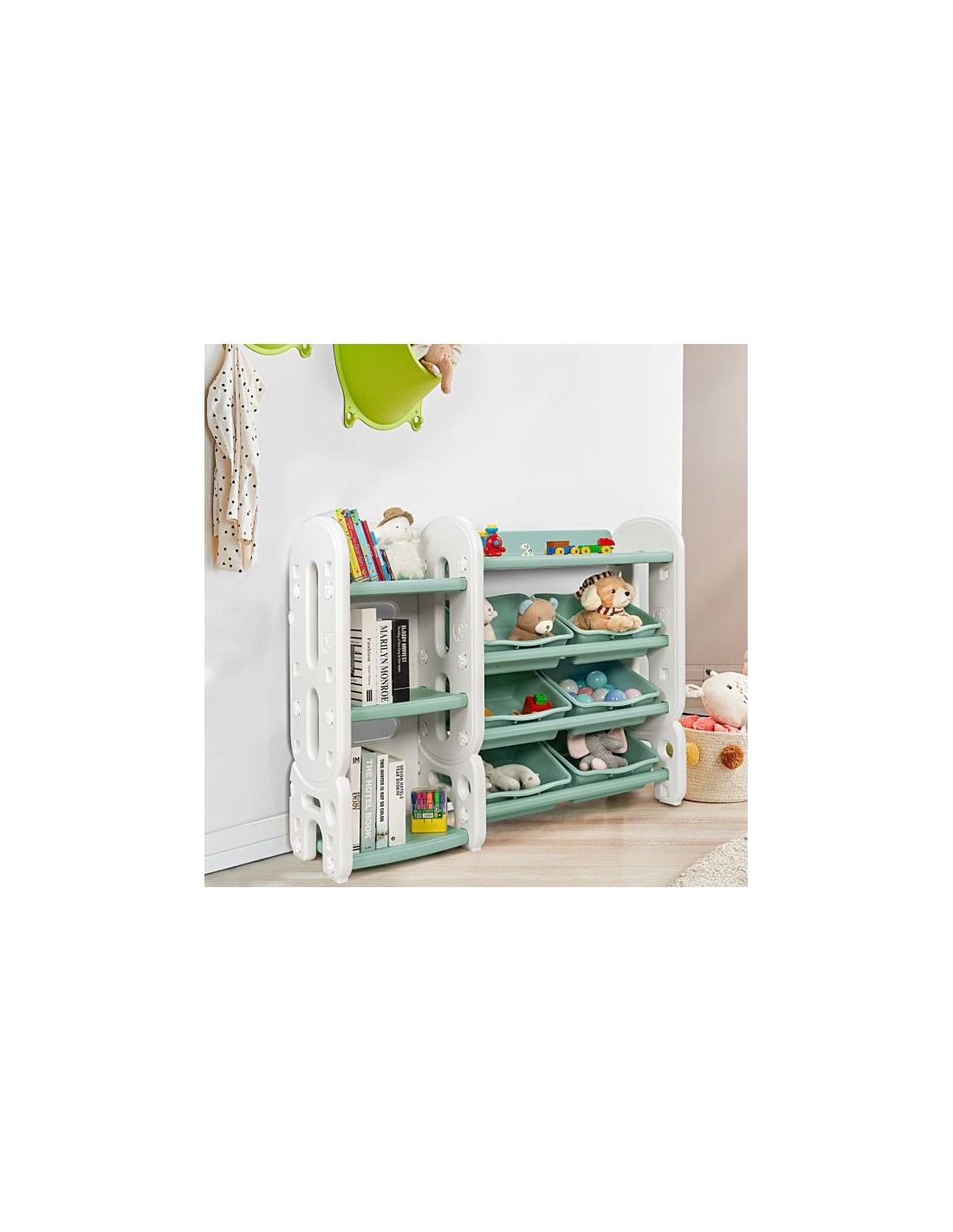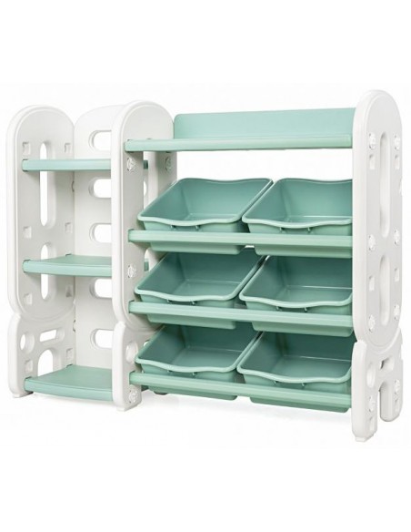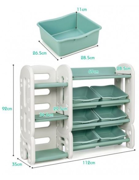 Reol med kasser, udført i et design af hvid og grøn kunststof. Reolen måler 92 cm i højden og 112 cm i bredden.