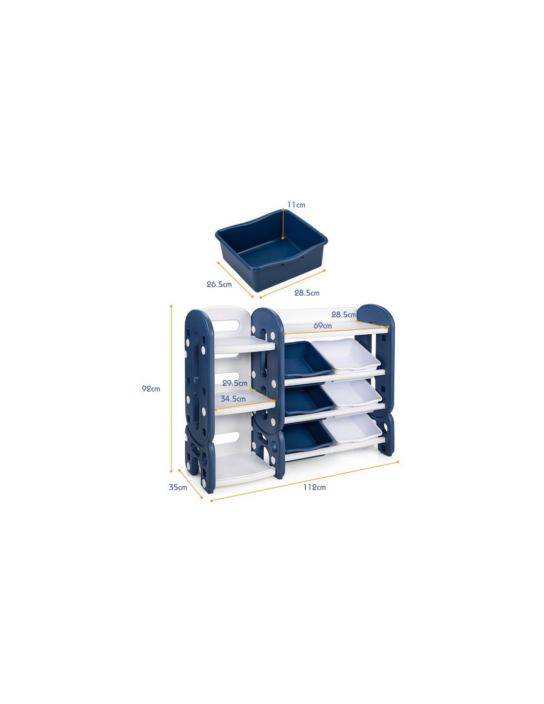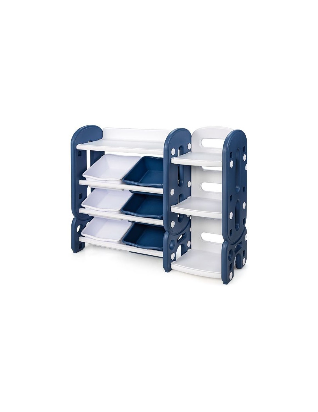 Reol med kasser, udført i et design af hvid og blå kunststof. Reolen måler 92 cm i højden og 112 cm i bredden.