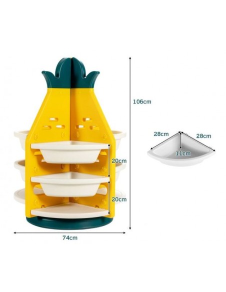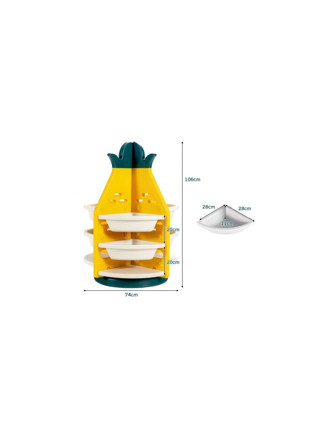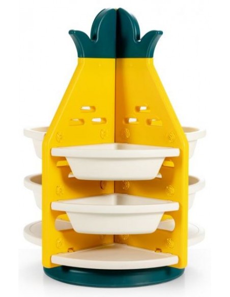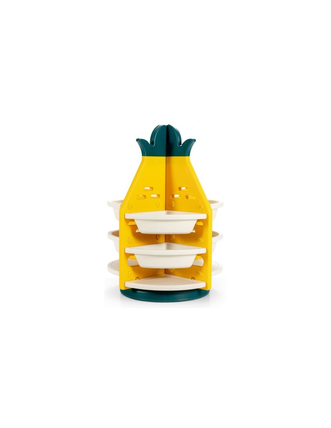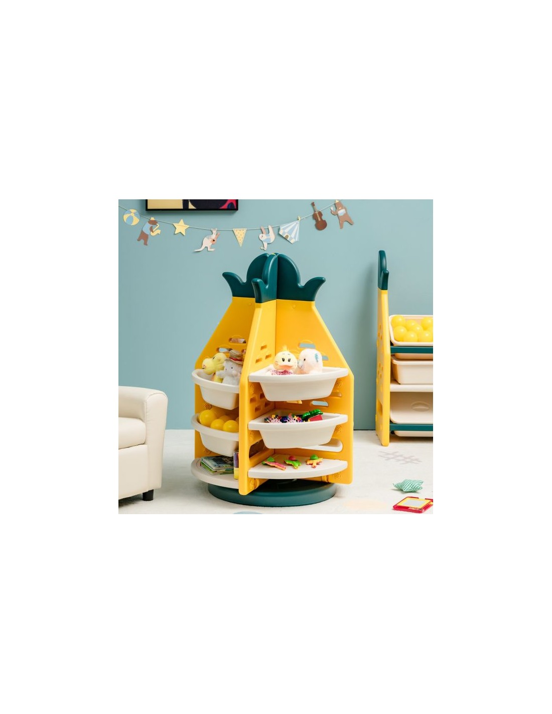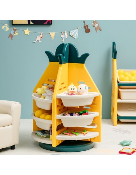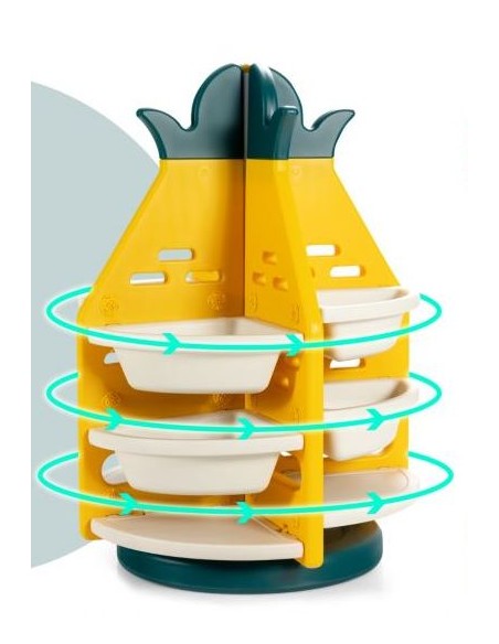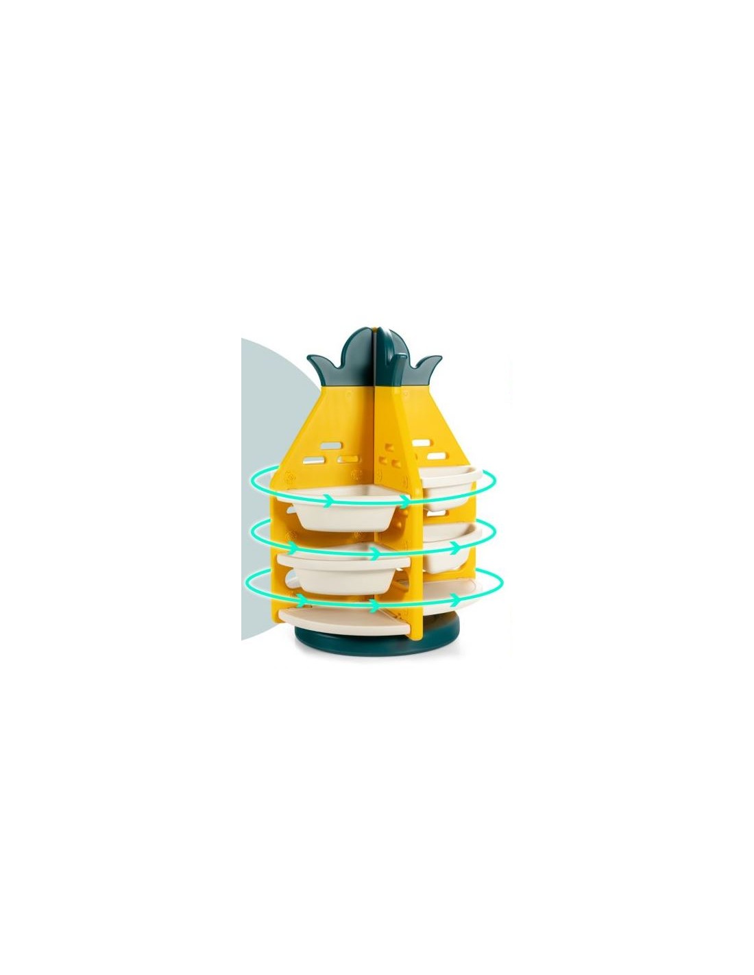 Rotérbar reol med kasser, udført i et design af gul og grøn kunststof. Reolen måler 106 cm i højden og 74 cm i diameter.