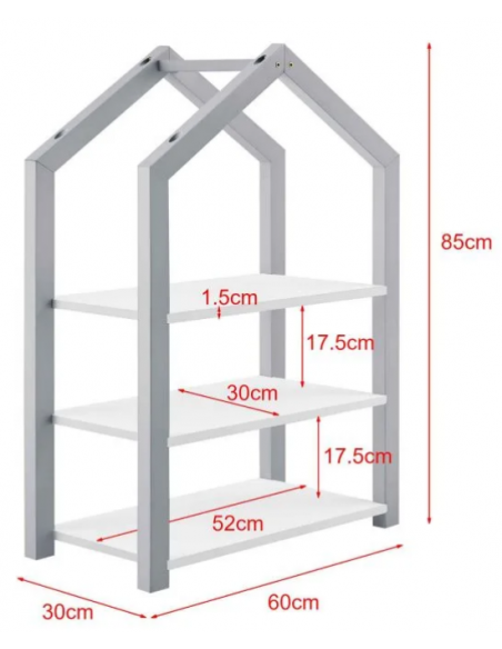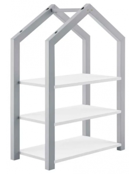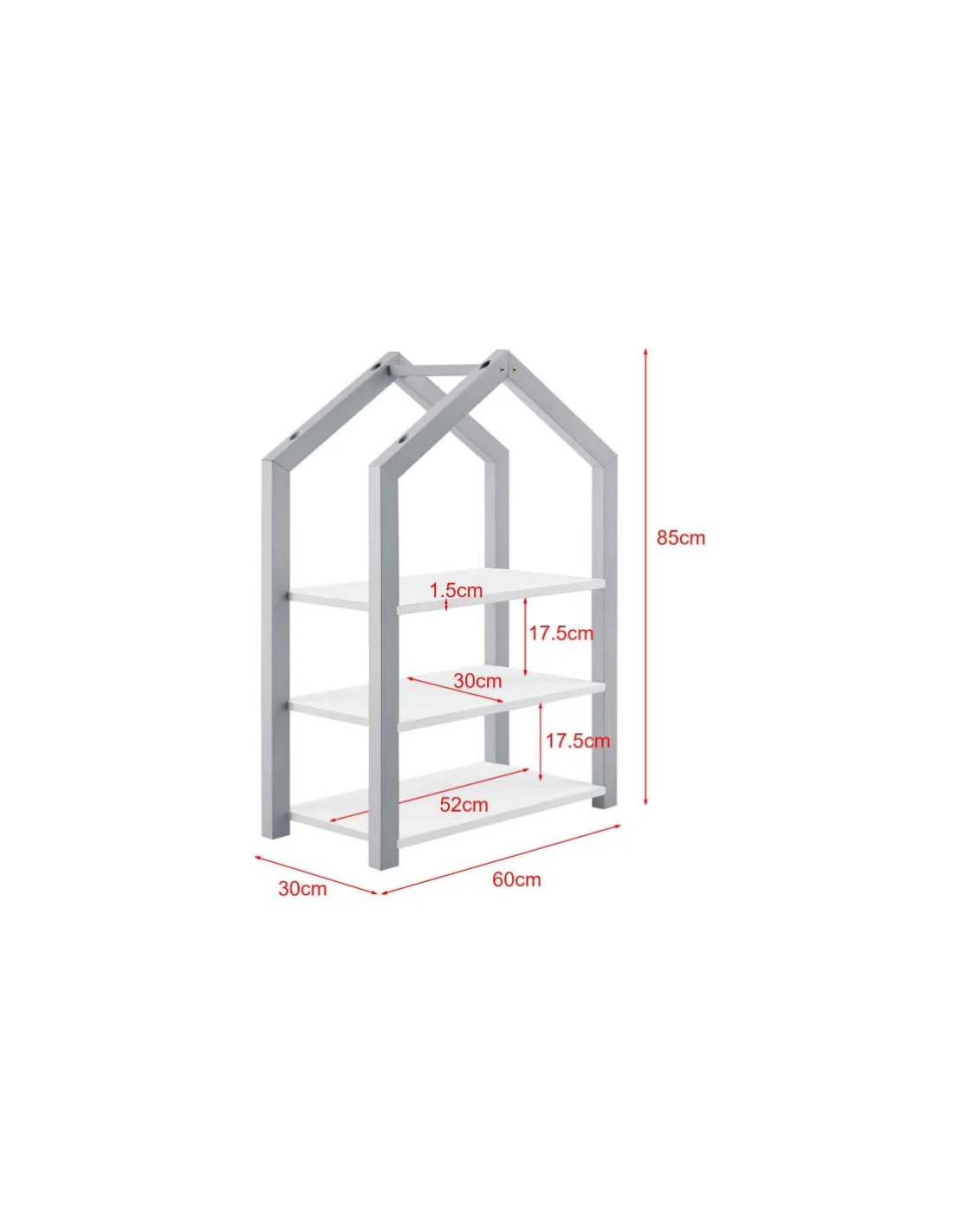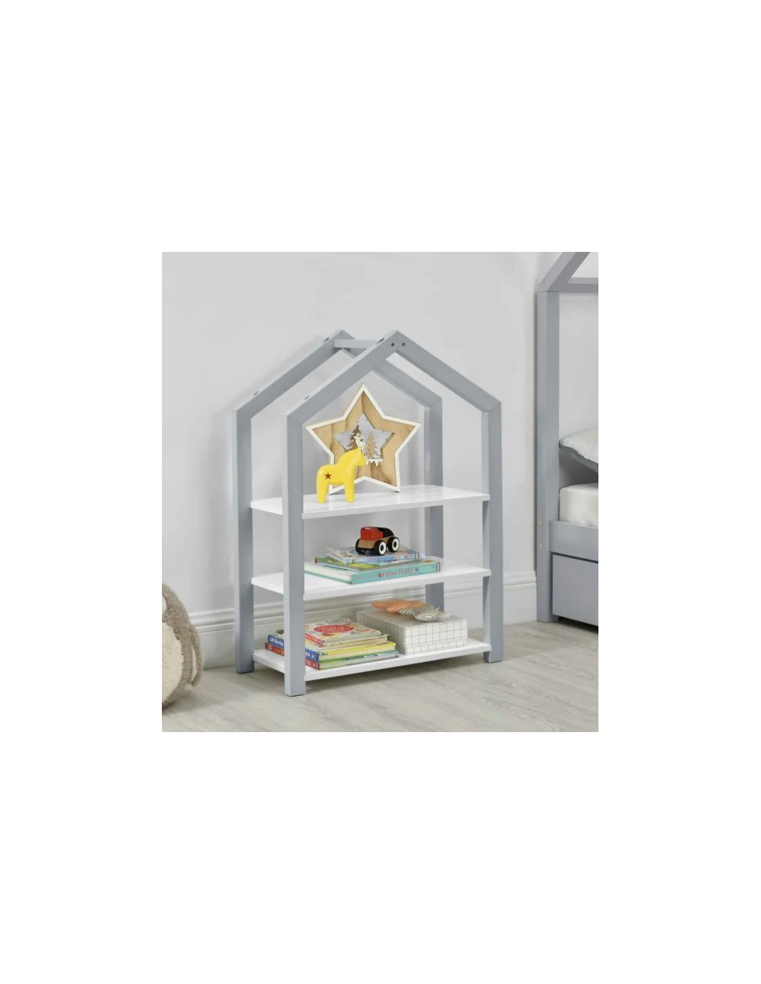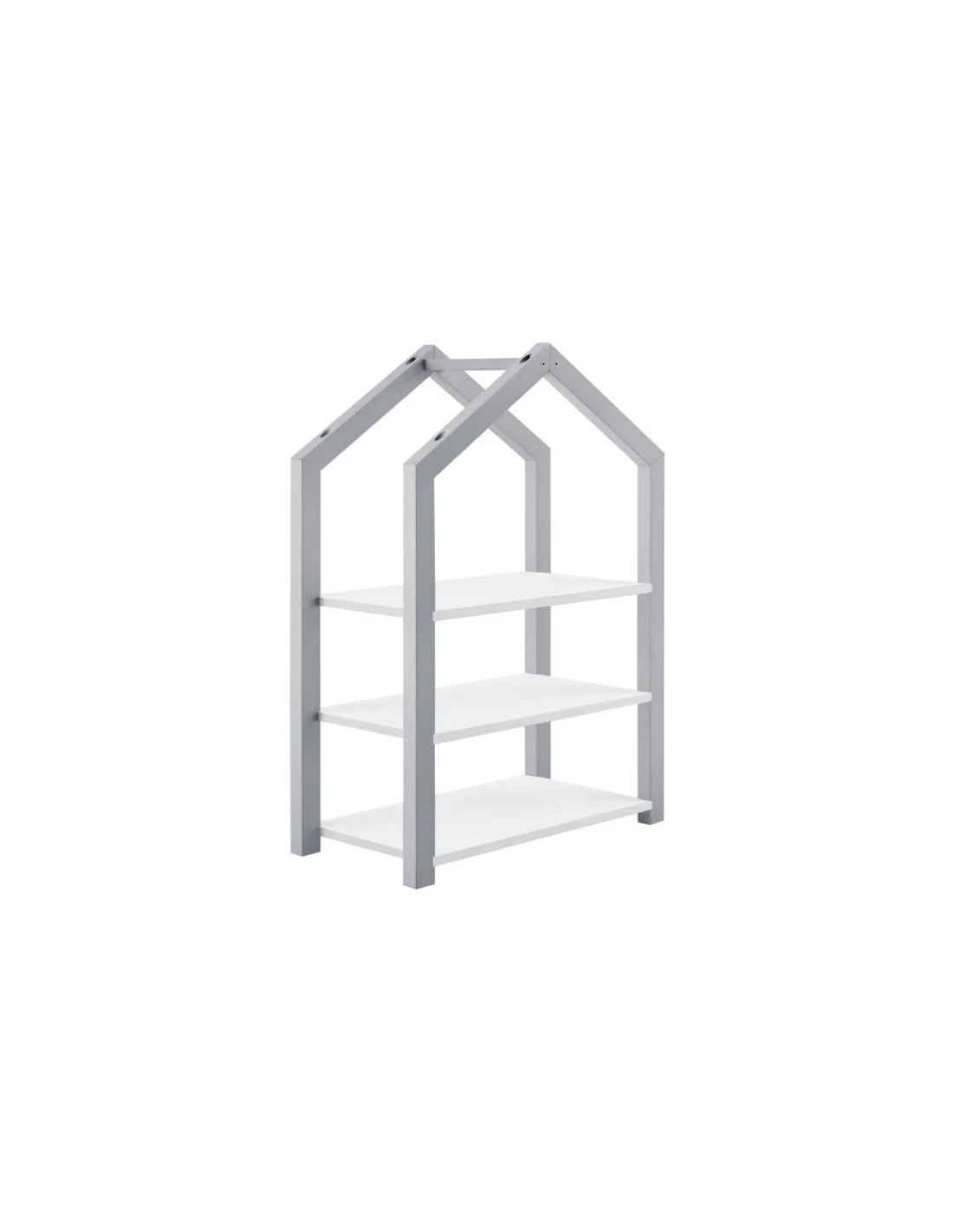 Bogreol til børneværelset, udført i et design af grålakeret fyrretræ og hvid mdf. Reolen måler 85 cm i højden og 60 x 30 cm i bredde og dybde.