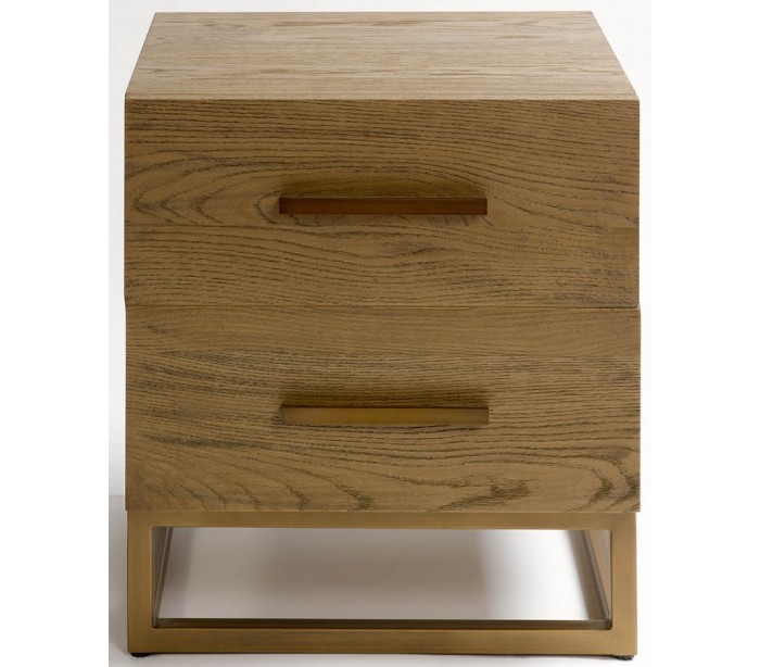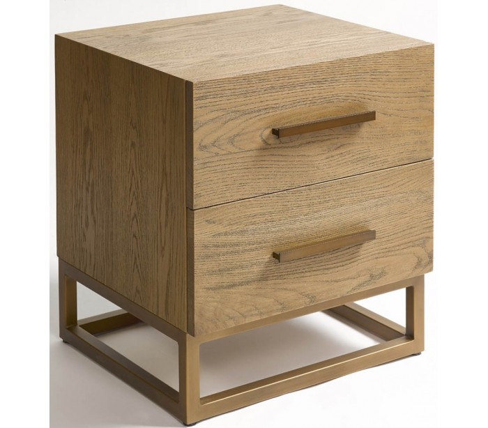 Sengebord udført i et rustikt design i børstet egetræ og antik guldfarvet metal. Sengebordet er med 2 skuffer og måler 56 cm i højden og 50 cm i bredden.