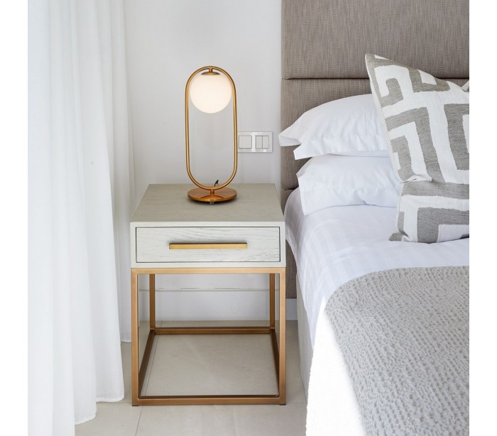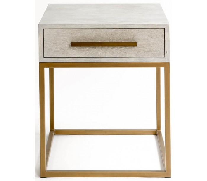 Sengebord udført i et rustikt design i gråhvid bejset egetræ og antik guldfarvet metal. Sengebordet er med 1 skuffe og måler 60 cm i højden og 50 cm i bredden.