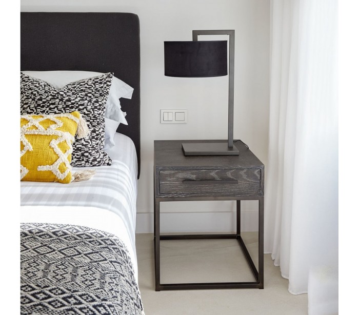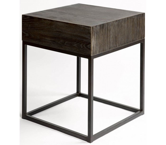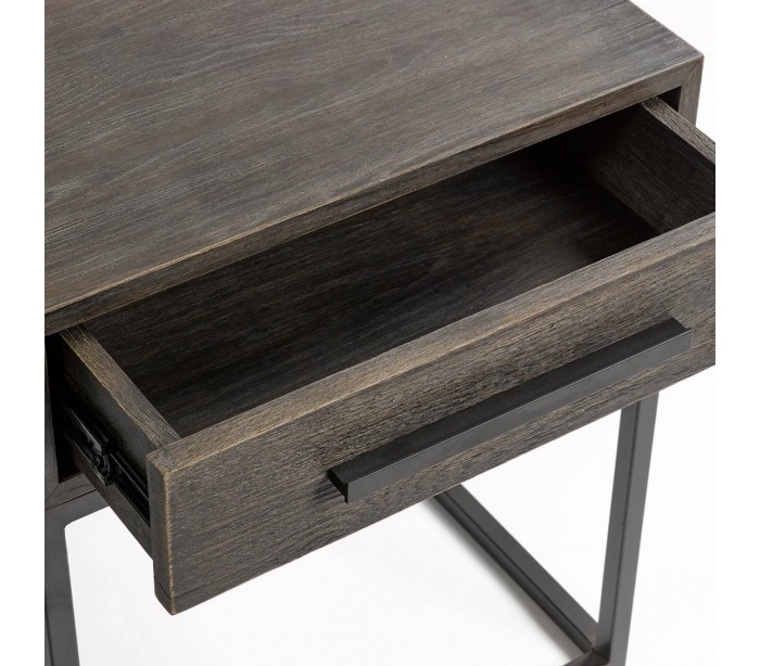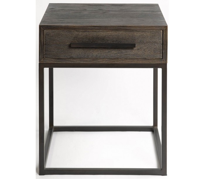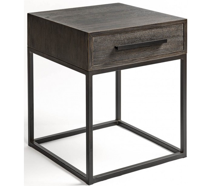 Sengebord udført i et rustikt design i gråbejset egetræ og sortlakeret metal. Sengebordet er med 1 skuffe og måler 60 cm i højden og 50 cm i bredden.