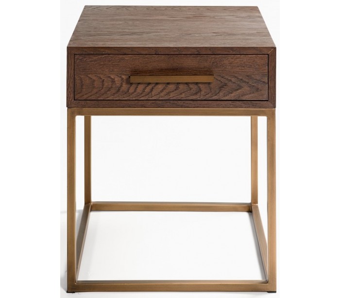 Sengebord udført i et rustikt design i brunbejset egetræ og antik guldfarvet metal. Sengebordet er med 1 skuffe og måler 60 cm i højden og 50 cm i bredden.