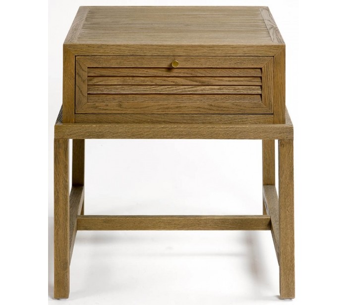 Sengebord udført i et rustikt design i børstet egetræ og antik guldfarvet metal. Sengebordet er med 1 skuffe og måler 55 cm i højden og 50 cm i bredden.