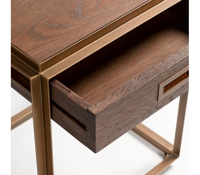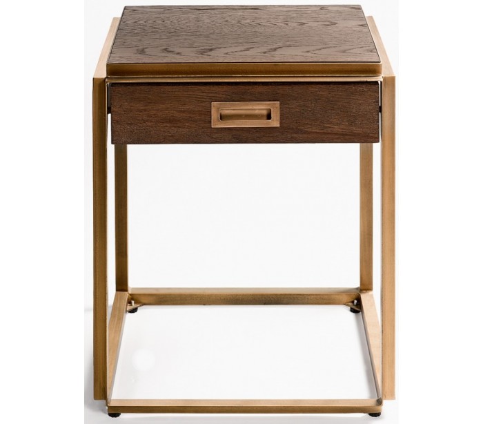 Sengebord udført i et rustikt design i brunbejset egetræ og antik guldfarvet metal. Sengebordet er med 1 skuffe og måler 60 cm i højden og 50 cm i bredden.