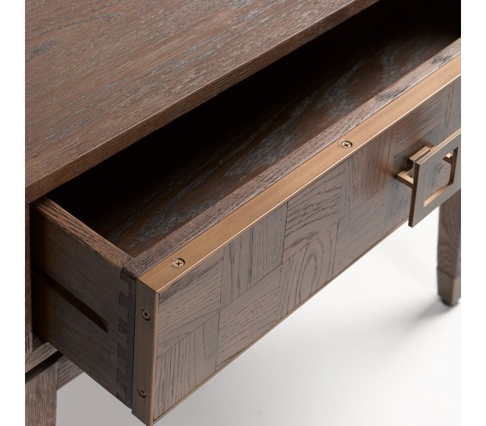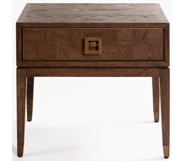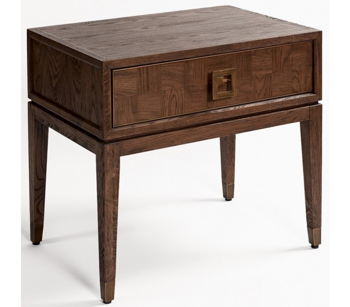 Sengebord udført i et rustikt design i brunbejset egetræ og antik guldfarvet metal. Sengebordet er med 1 skuffe og måler 61 cm i højden og 69 cm i bredden.