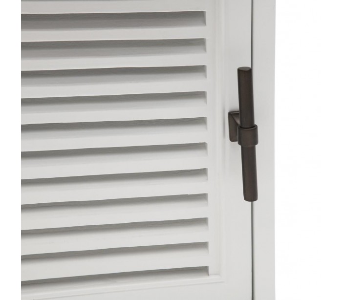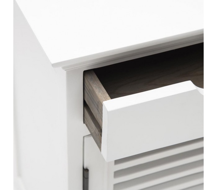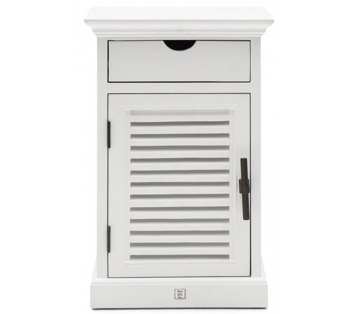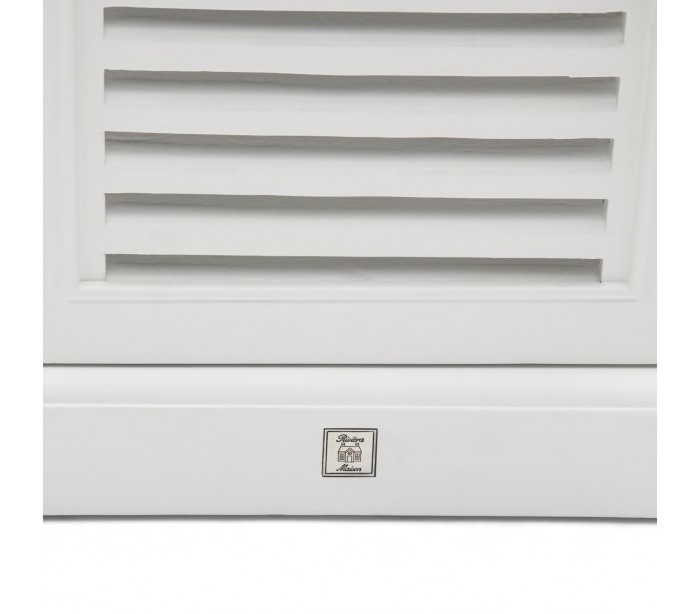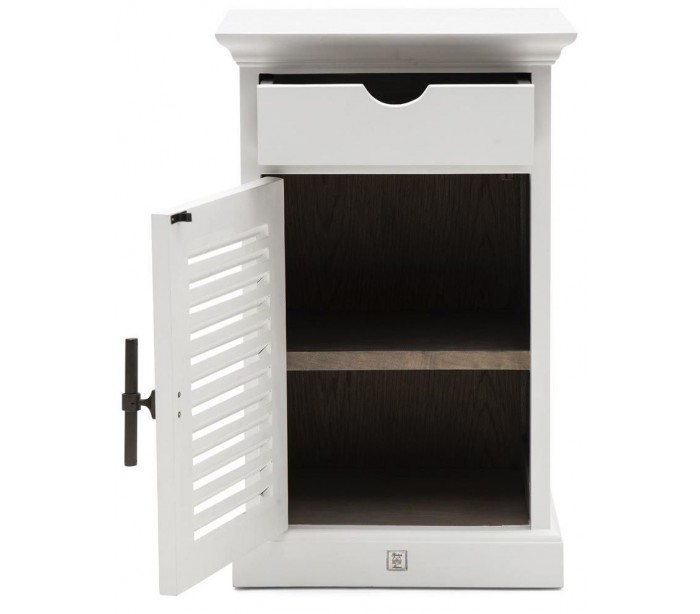Riviera Maison sengebord, udført i bedste New England stil, fremstillet i hvidlakeret poplartræ og antik sortlakeret metal. Sengebordet måler 70 cm i højden og 45 cm i bredden. Hylde er ikke justérbar.