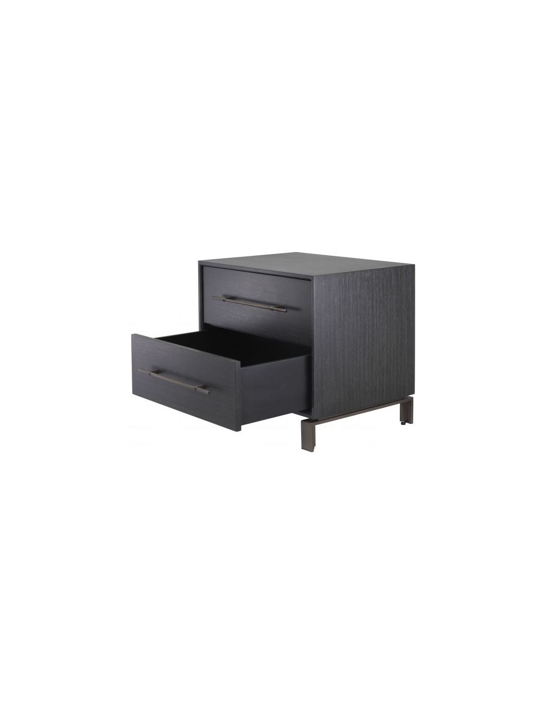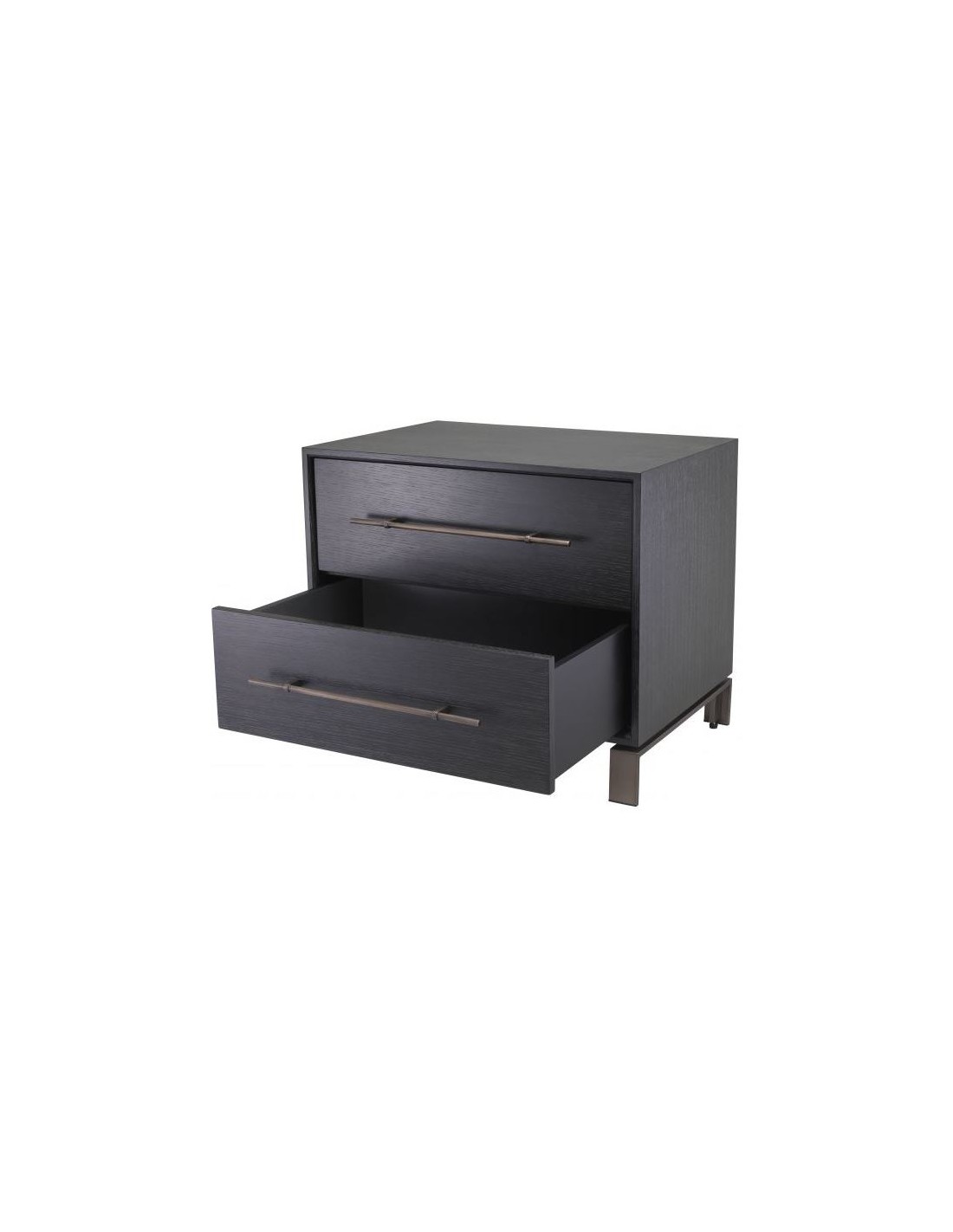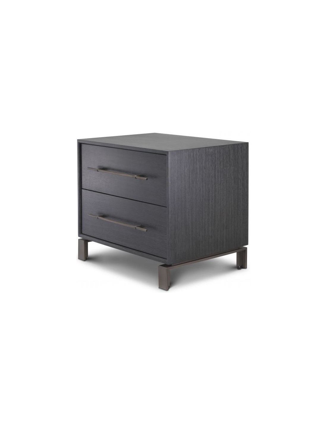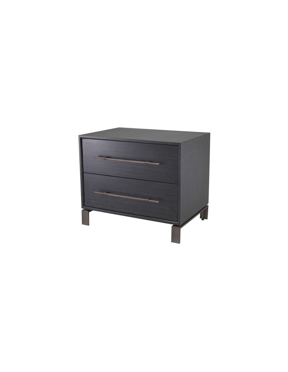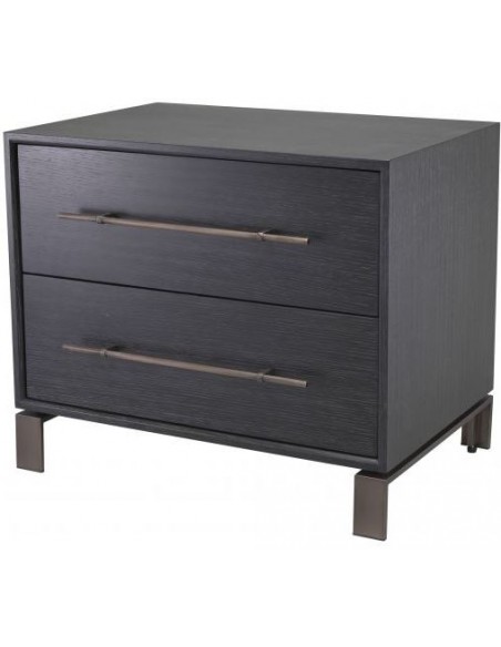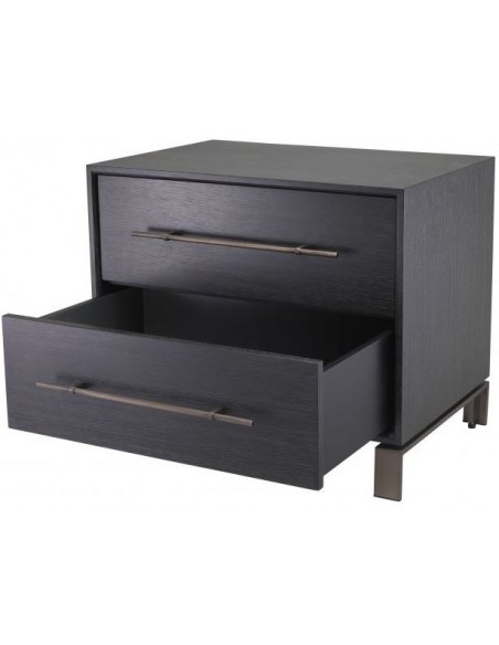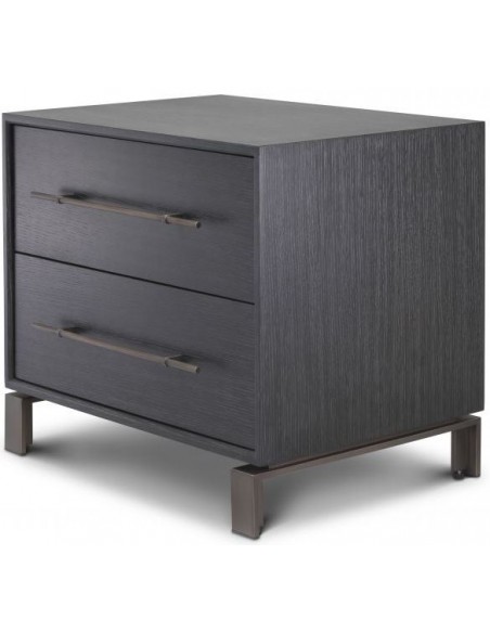 Eichholtz Canova sengebord i et moderne design af antik bronzelakeret stål og med kabinet i kulgrå lakeret egetræsfinér. Sengebordet måler 55 cm i højden og 65 x 48 cm i bredde og dybde. Sengebordet indeholder 2 skuffer.