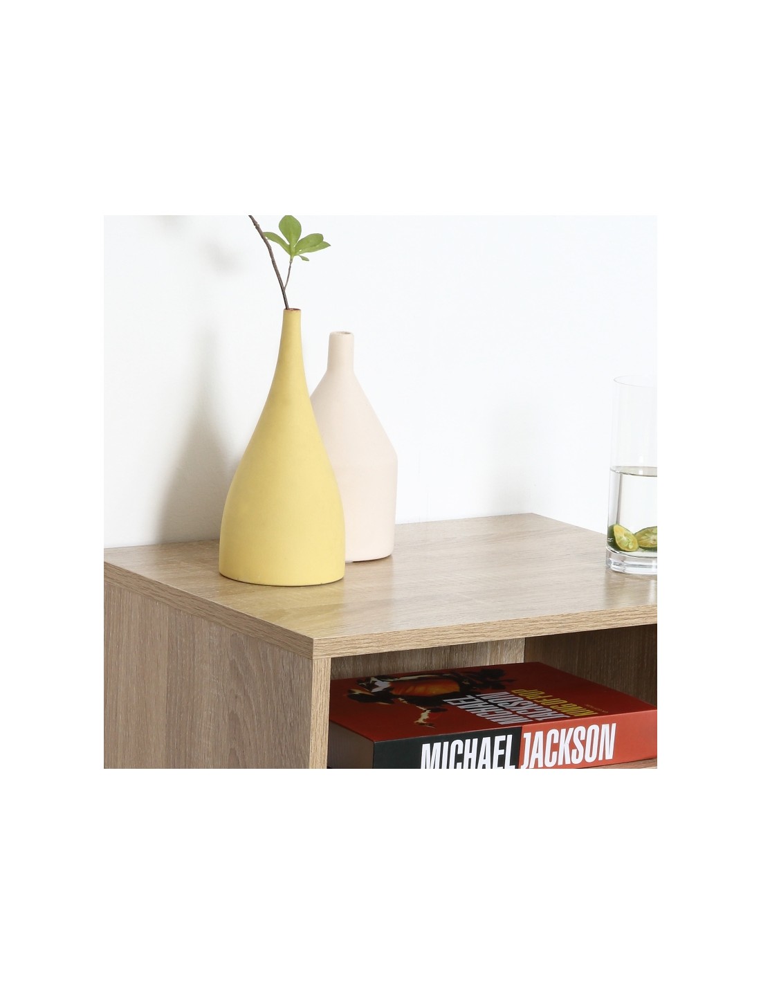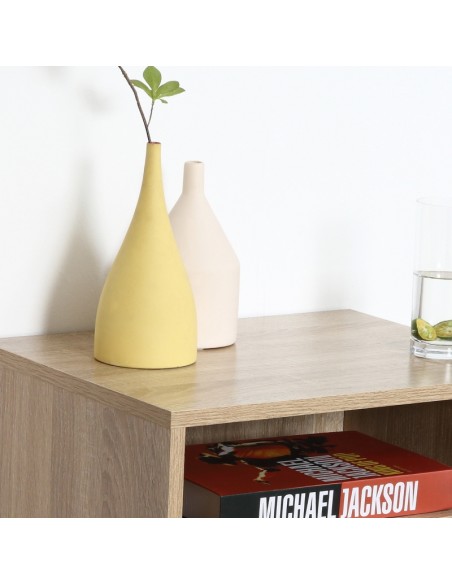 Sæt med 2 sengeborde udført i et design af møbelplade. Sengebordene indeholder 1 åbent hylderum samt 1 skuffe. Bordet måler 45 x 35 cm i bredde og dybde og 27,5 cm i højden.