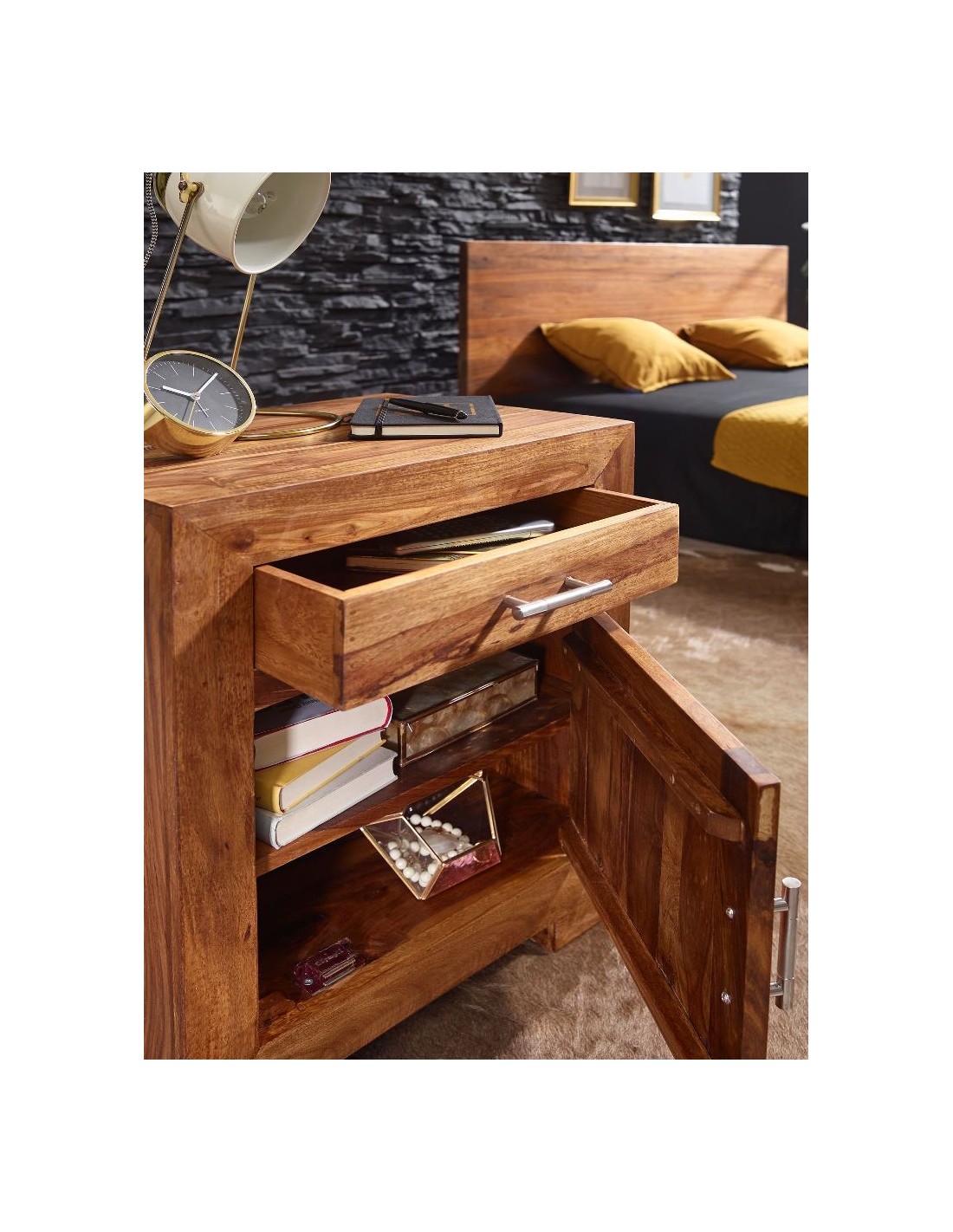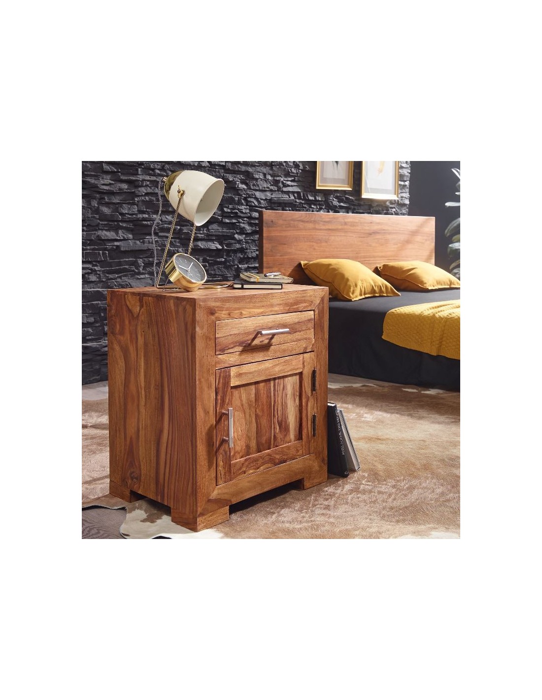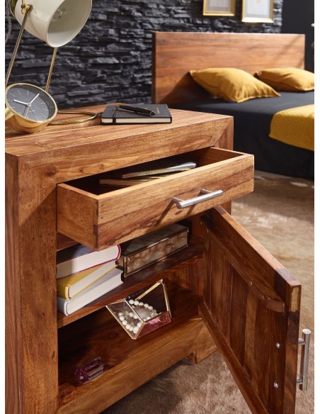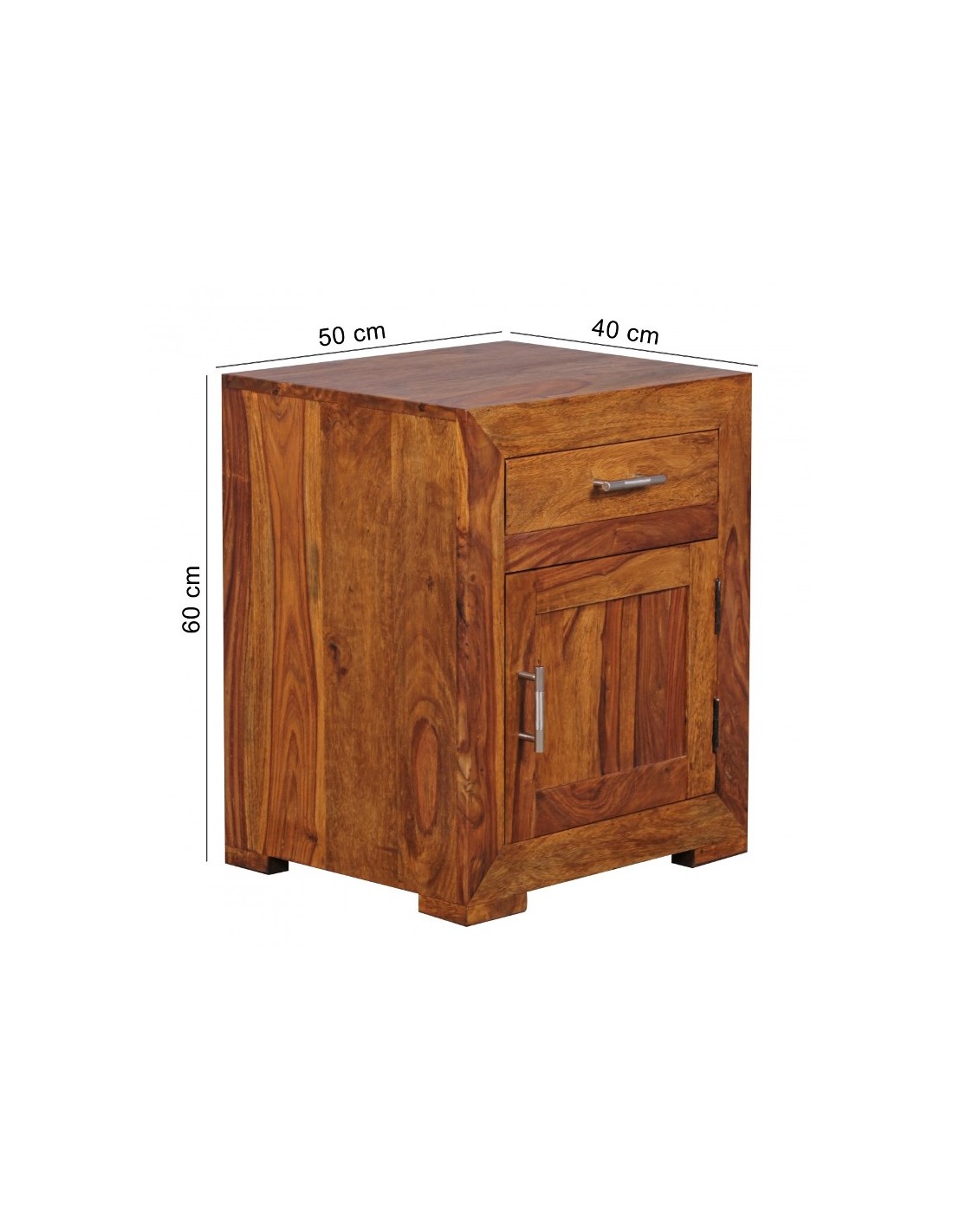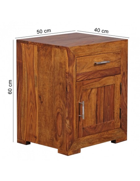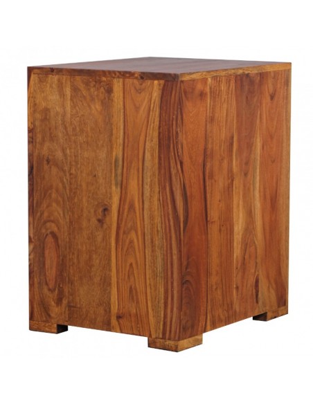 Sengebord fremstillet i et design af brun sheeshamtræ. Sengebordet måler 60 cm i højden og 50 x 40 cm i bredde og dybde.