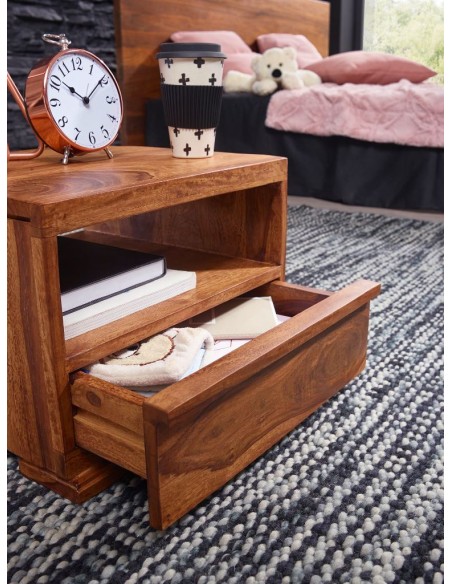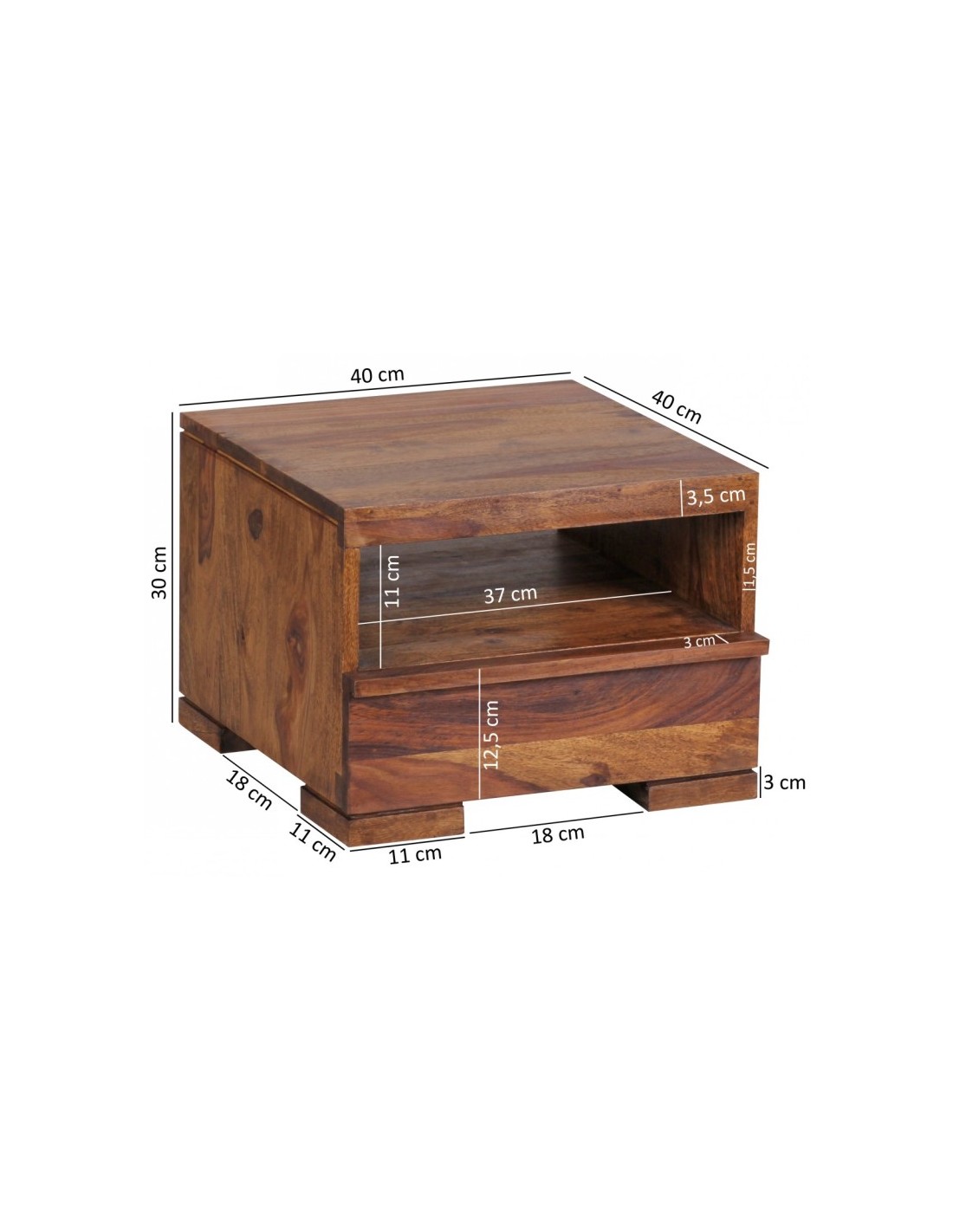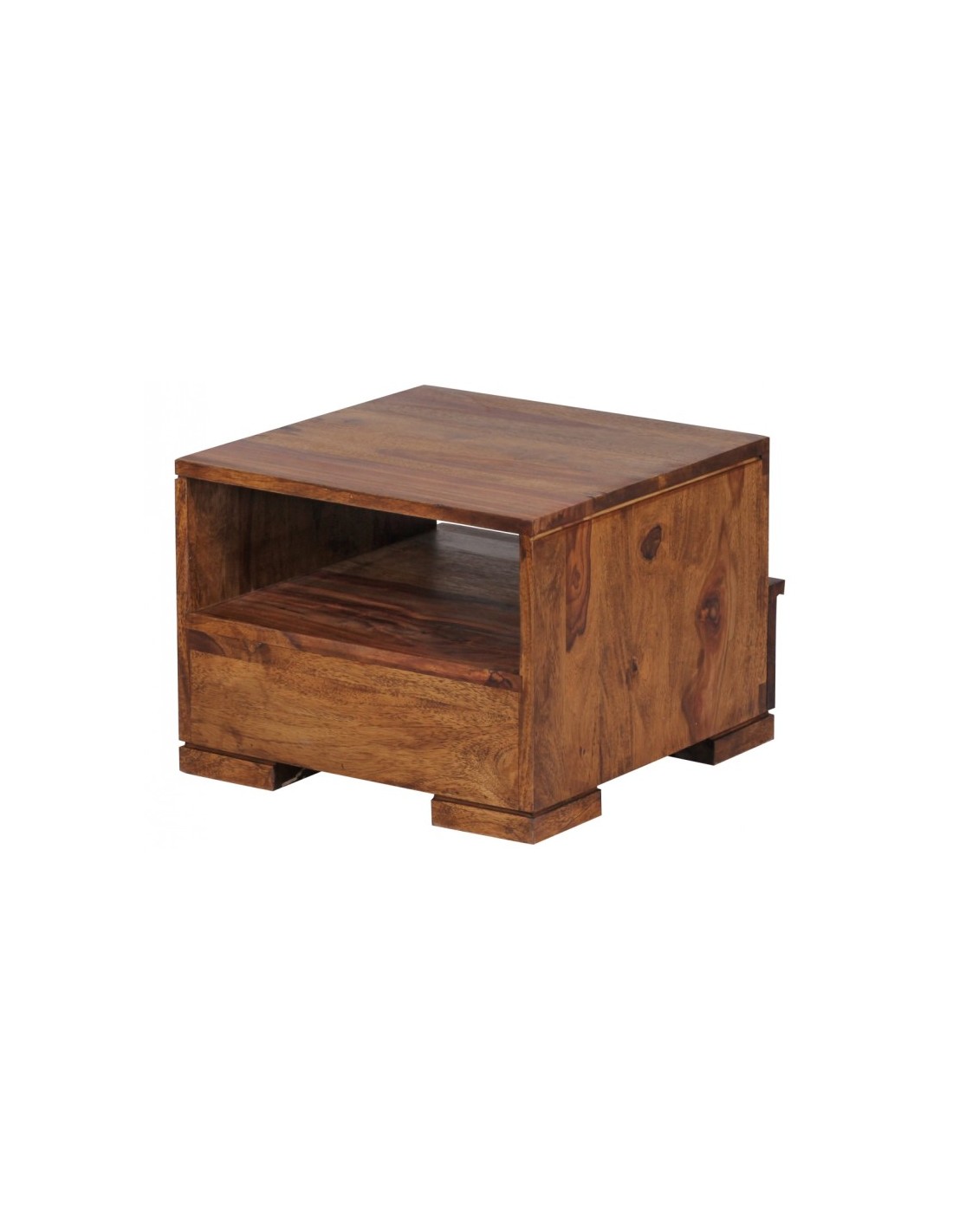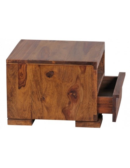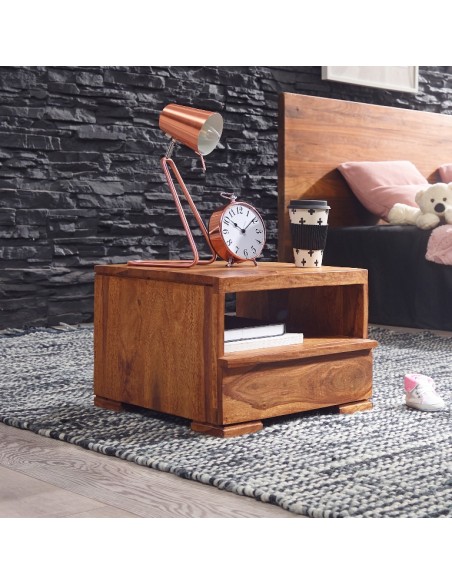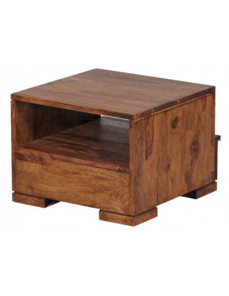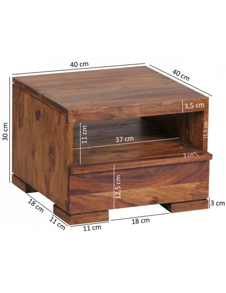 Sengebord fremstillet i et design af brun sheeshamtræ. Sengebordet måler 30 cm i højden og 40 x 40 cm i bredde og dybde.