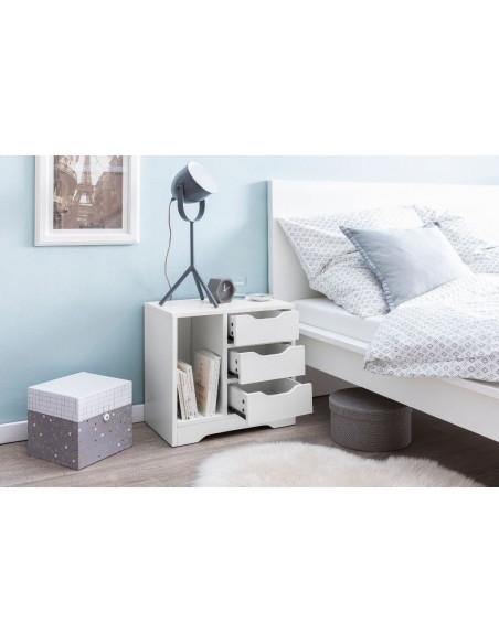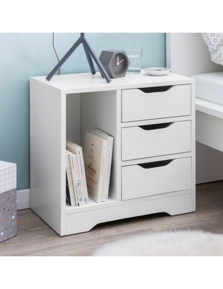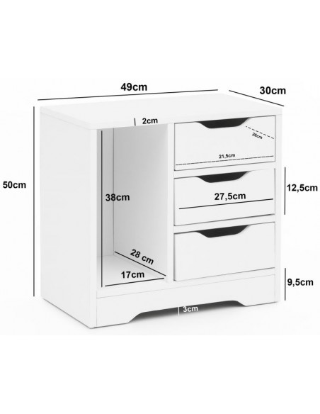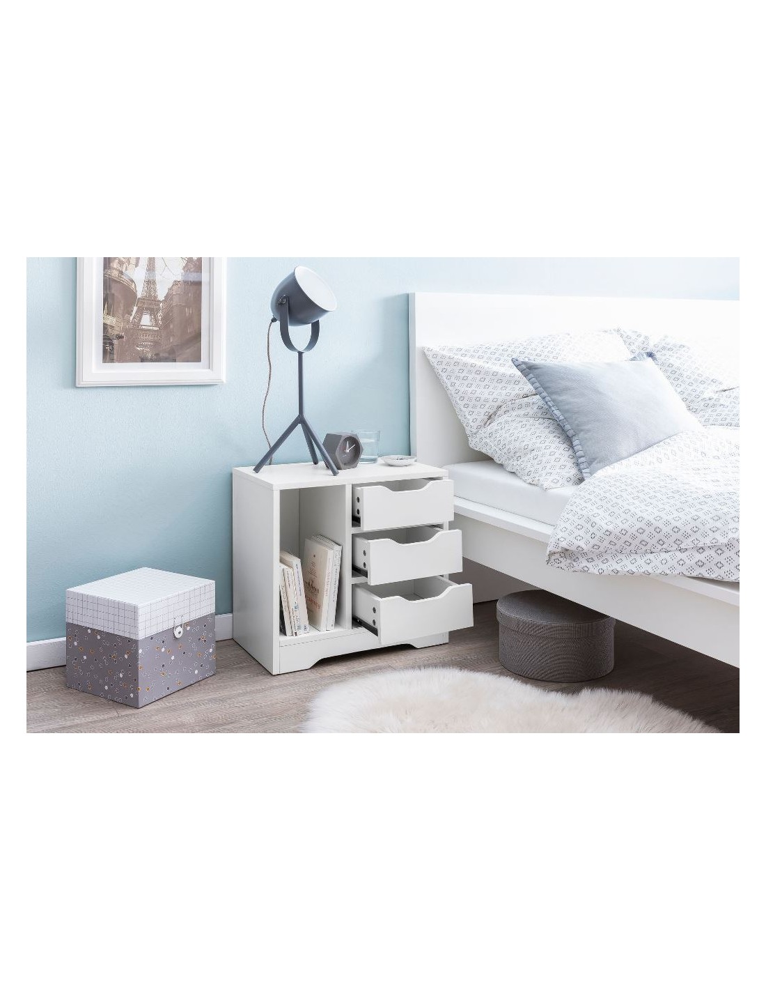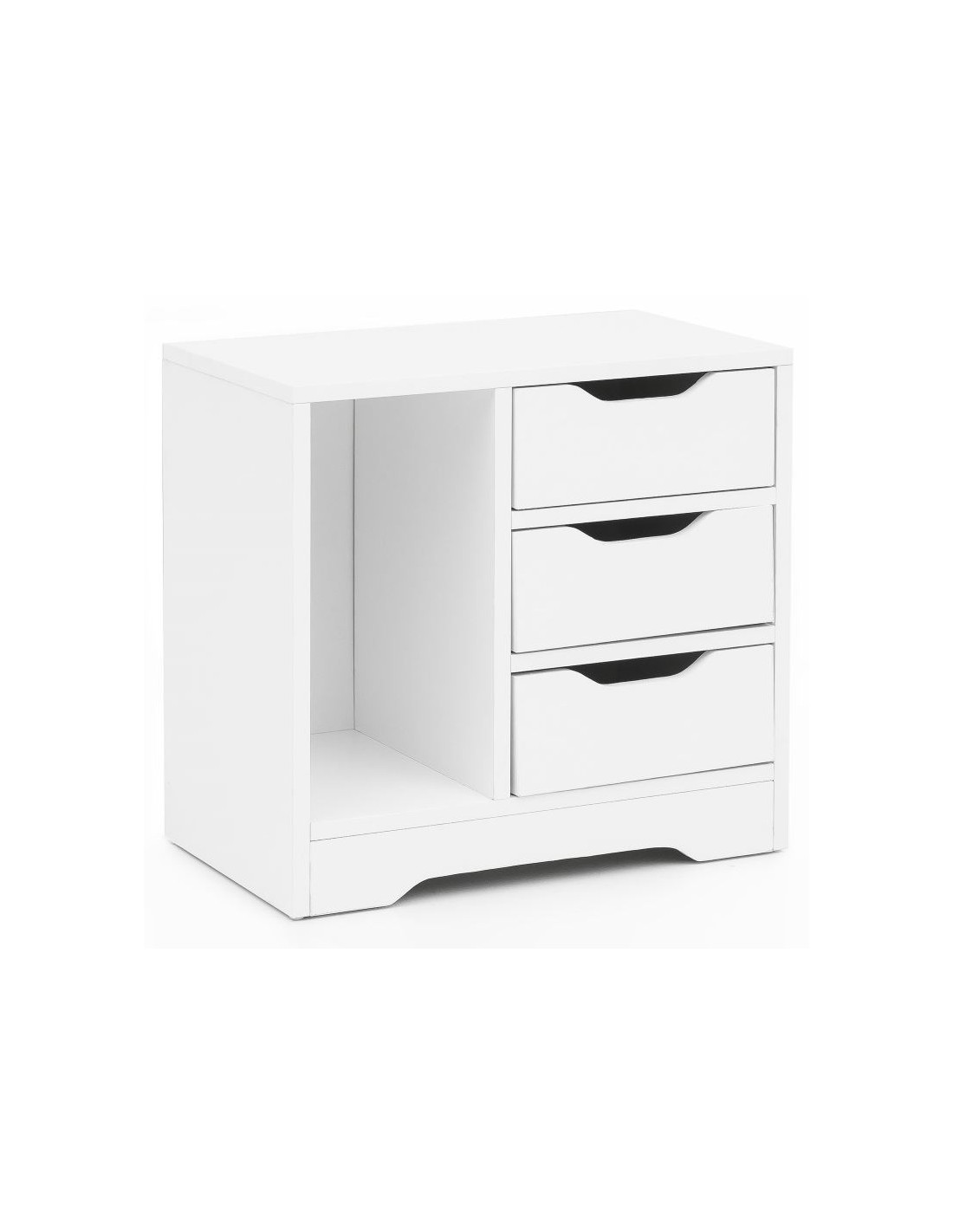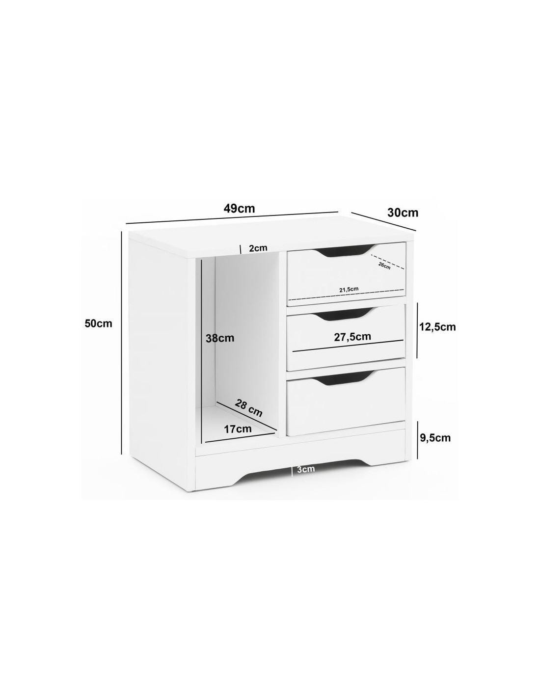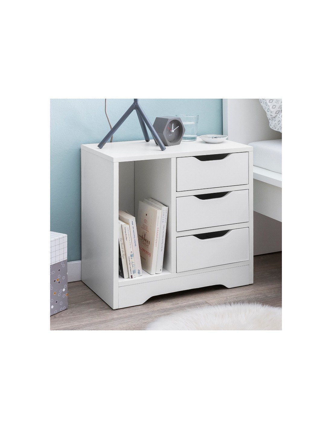 Sengebord fremstillet i et design af hvid møbelplade. Sengebordet måler 50 cm i højden og 49 x 30 cm i bredde og dybde.