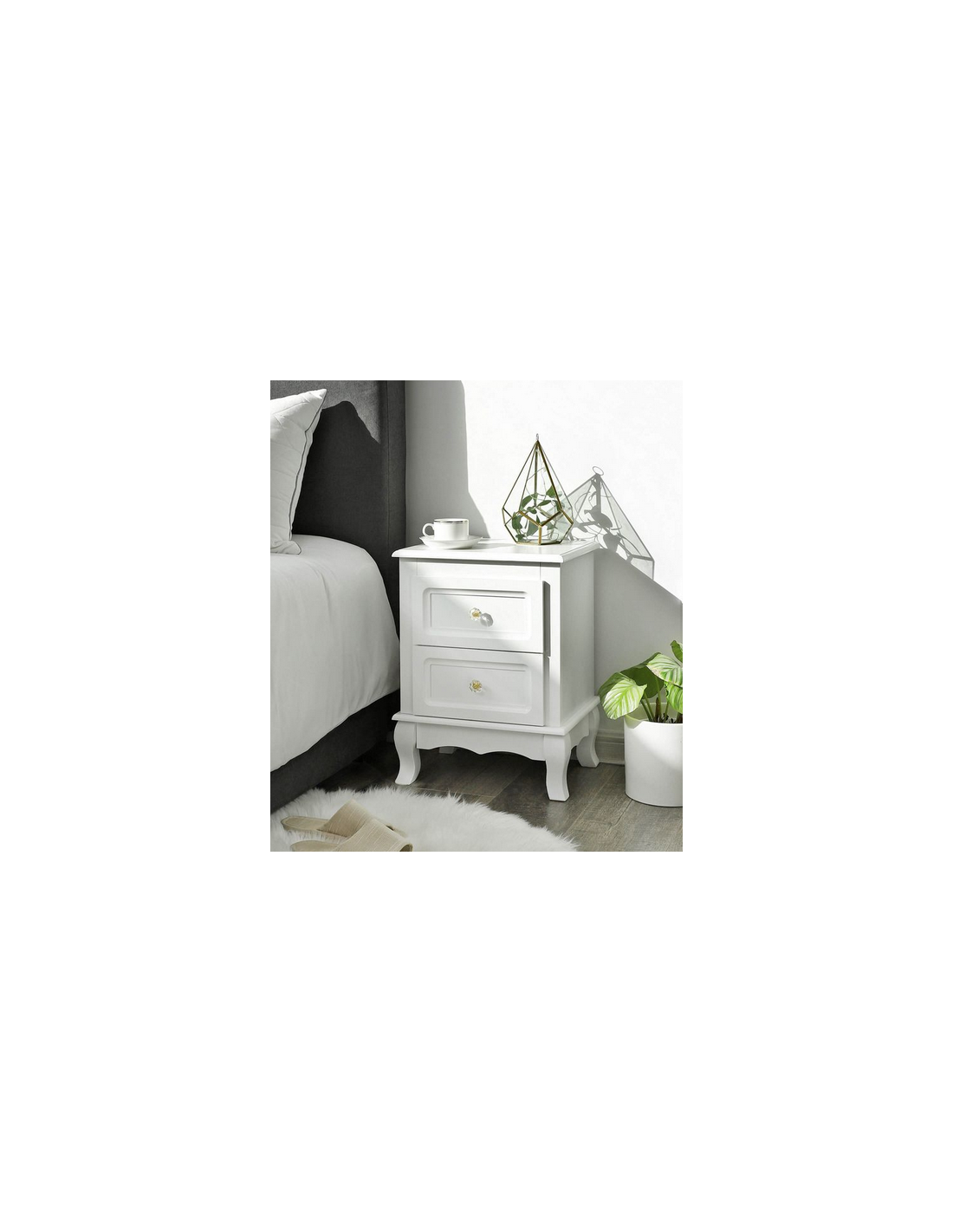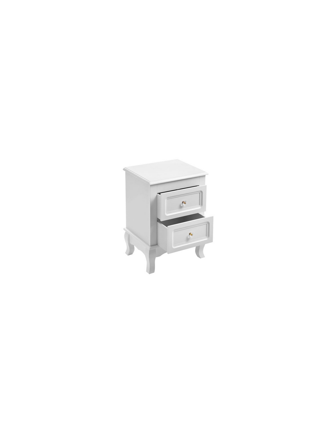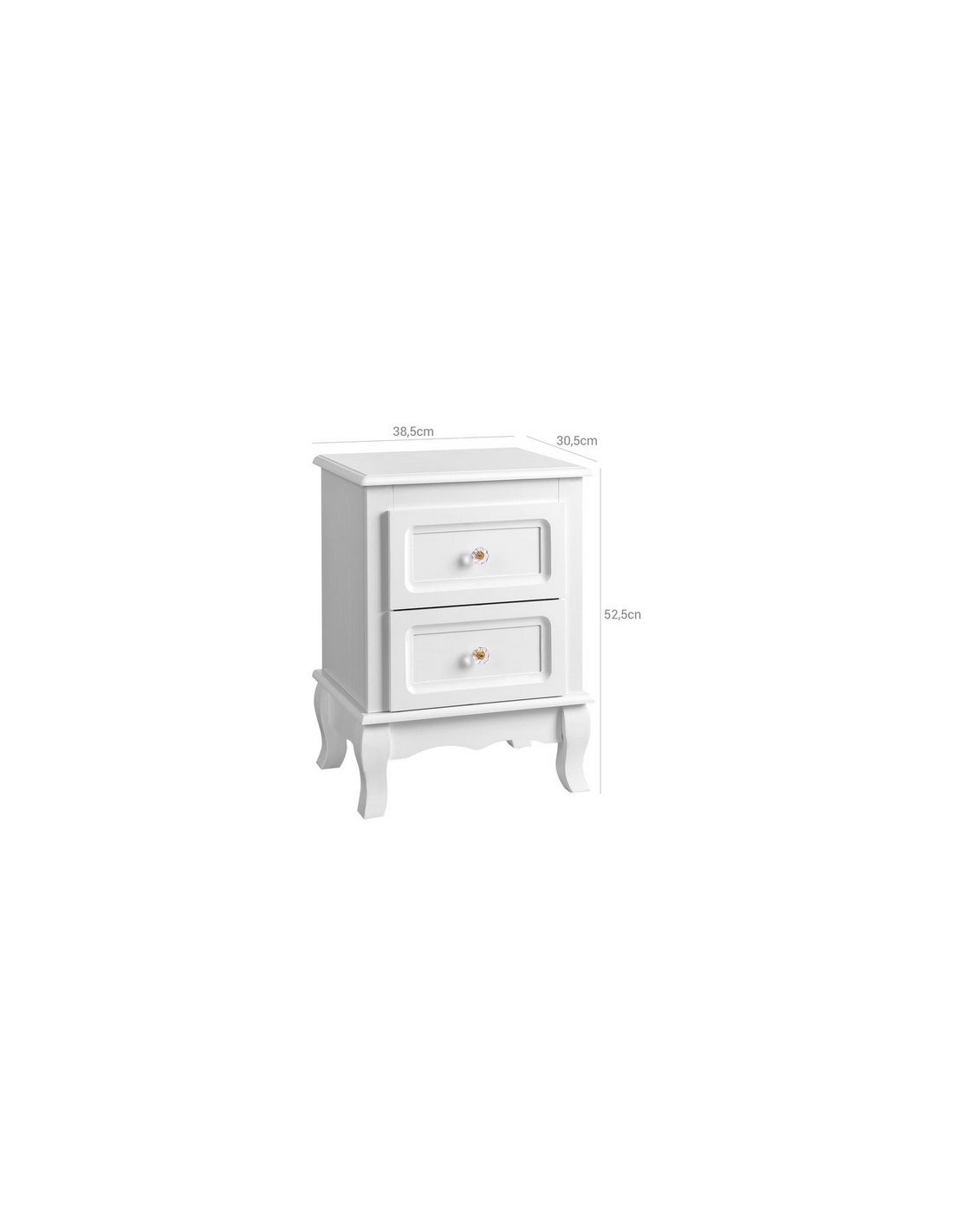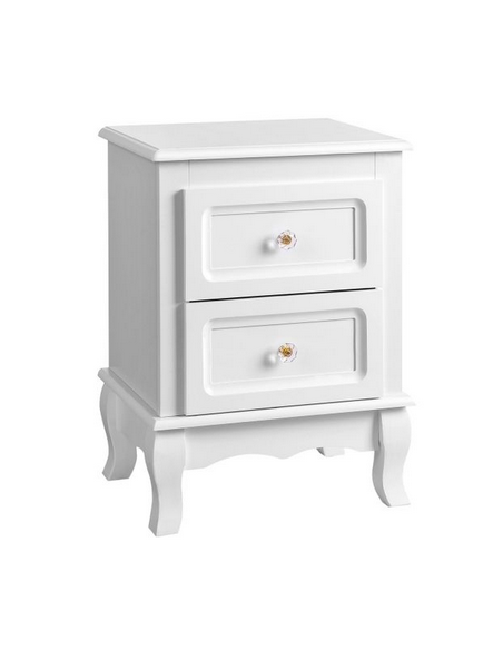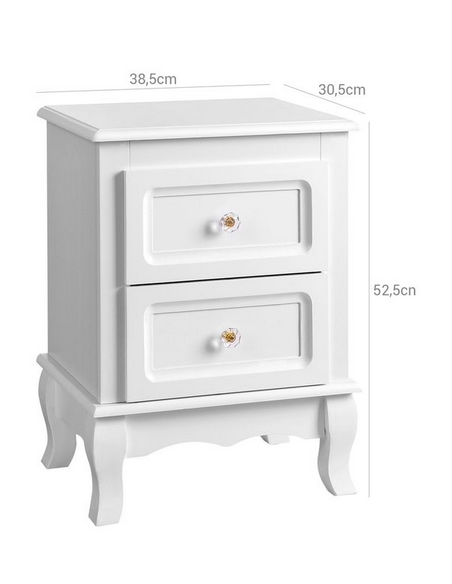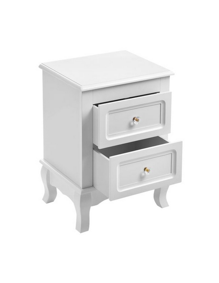 Sæt med 2 sengeborde, udført i et design af hvid mdf og træ. Sengebordene måler 52,5 cm i højden og 38,5 x 30,5 cm i bredde og dybde.
