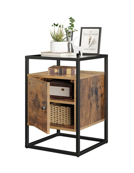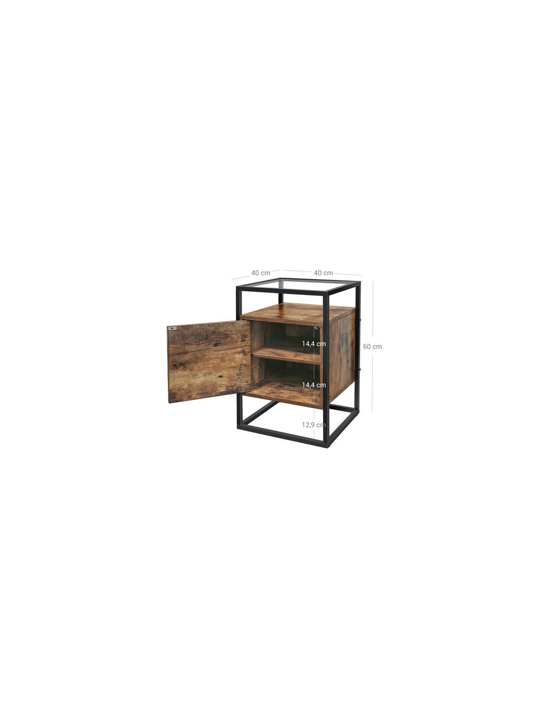 Sengebord udført i et design af sortlakeret metal, klart glas og brun møbelplade. Sengebordet måler 60 cm i højden og 40 x 40 cm i bredde og dybde.