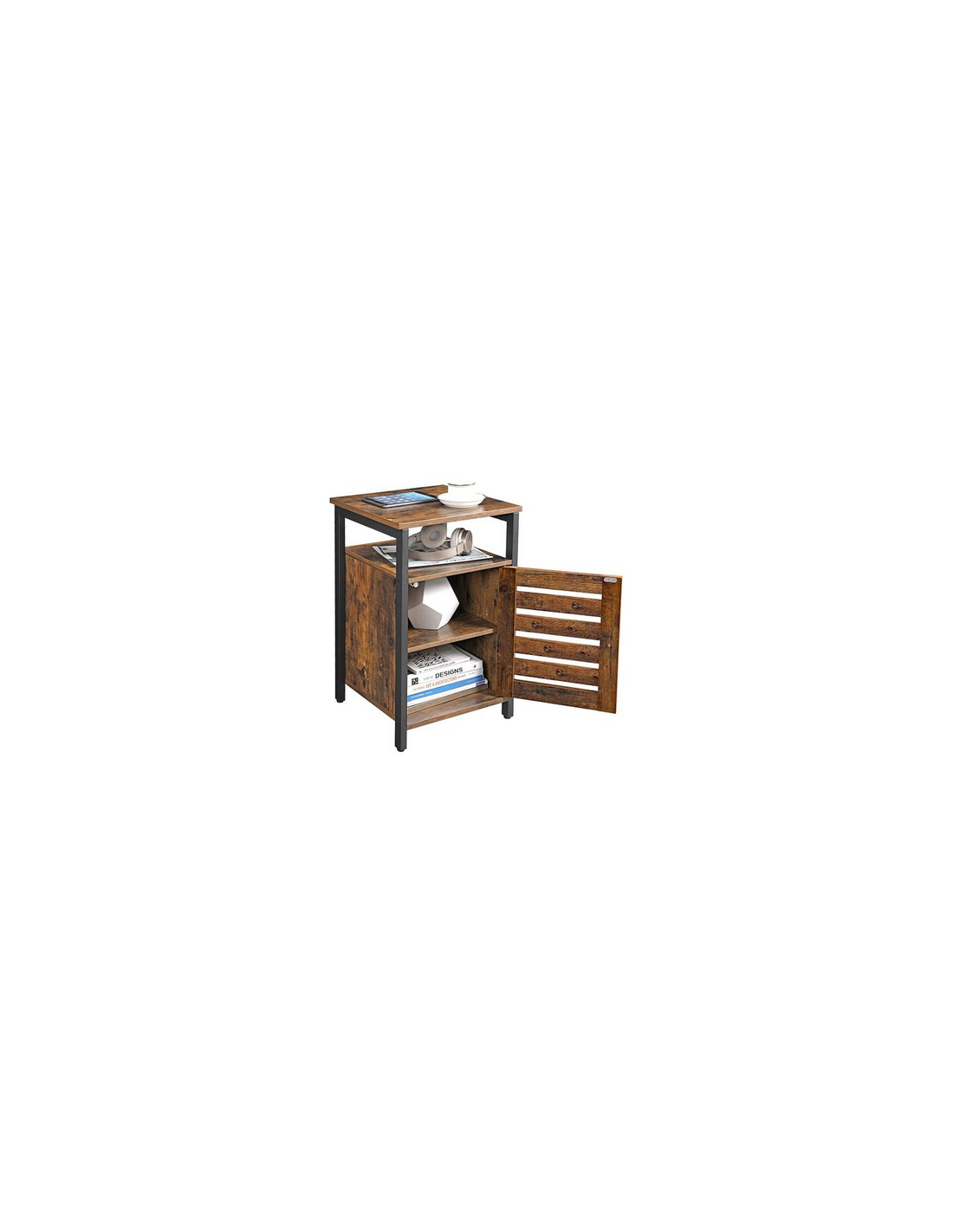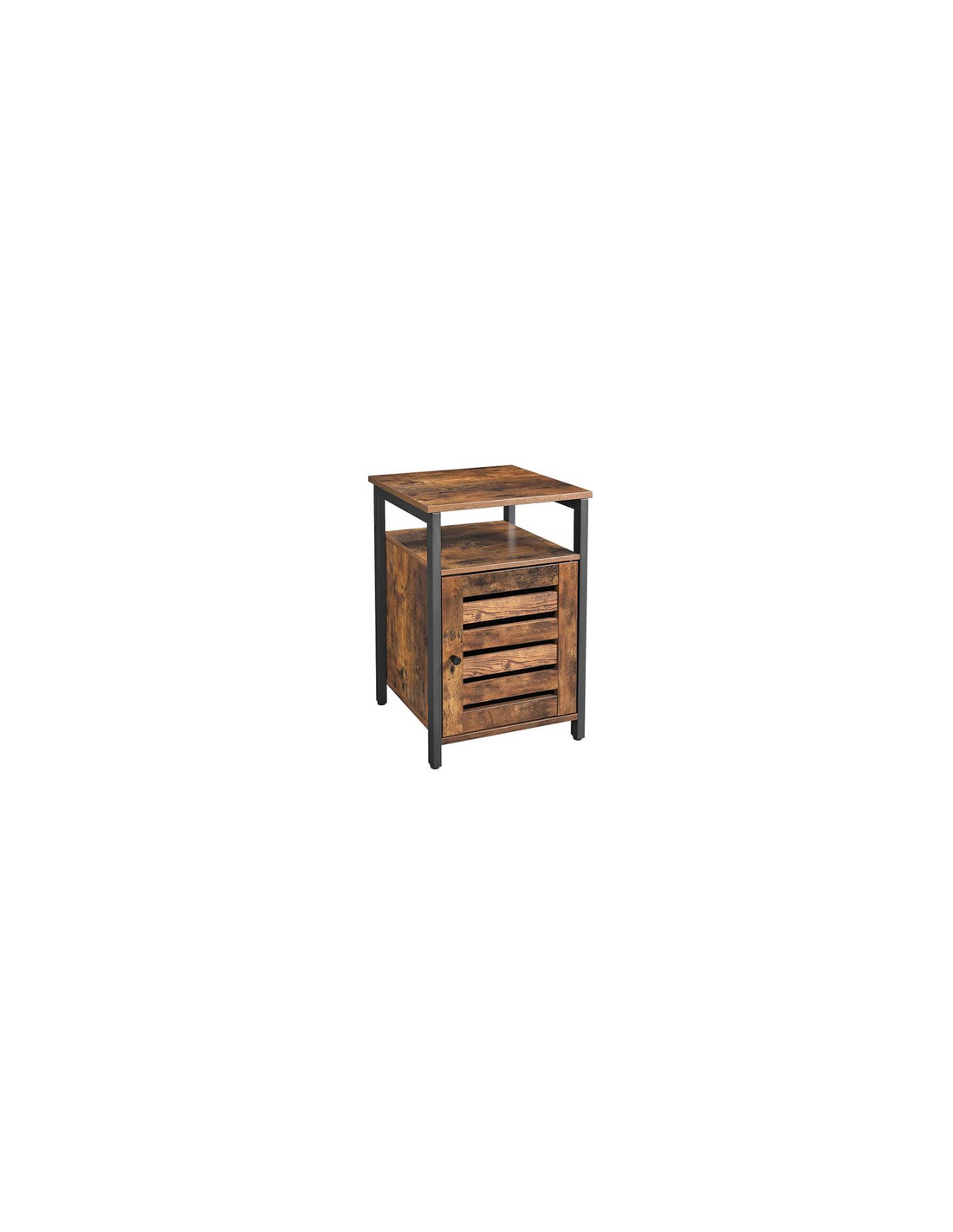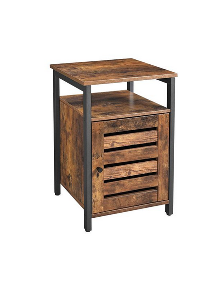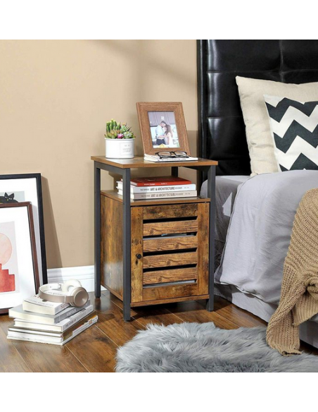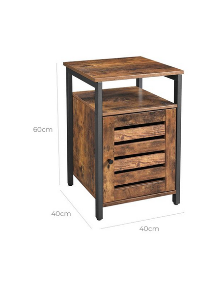 Sengebord udført i et design af sortlakeret metal og brun møbelplade. Sengebordet måler 60 cm i højden og 40 x 40 cm i bredde og dybde.