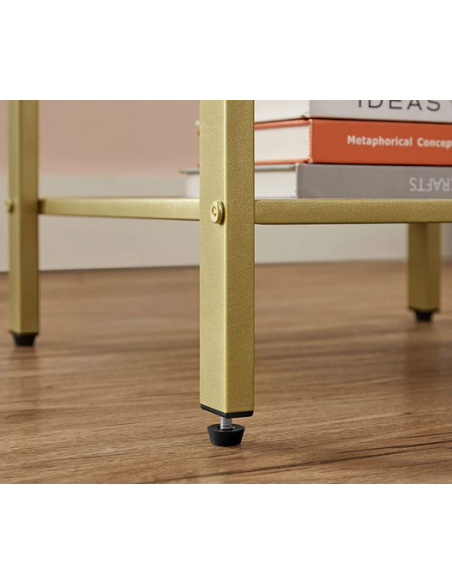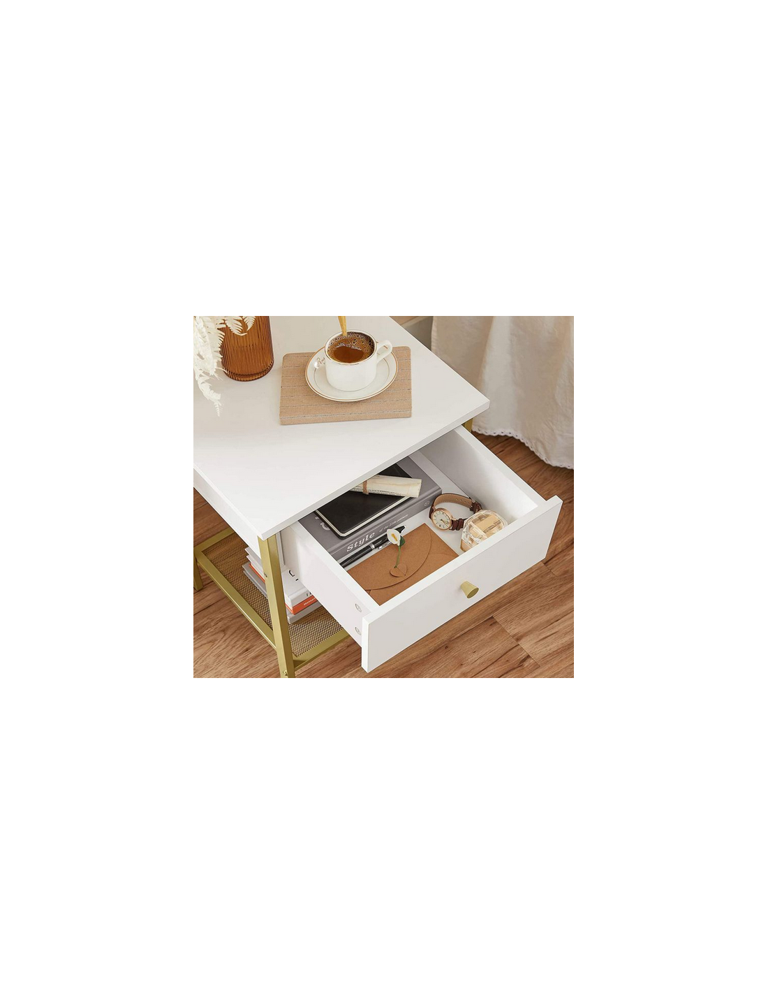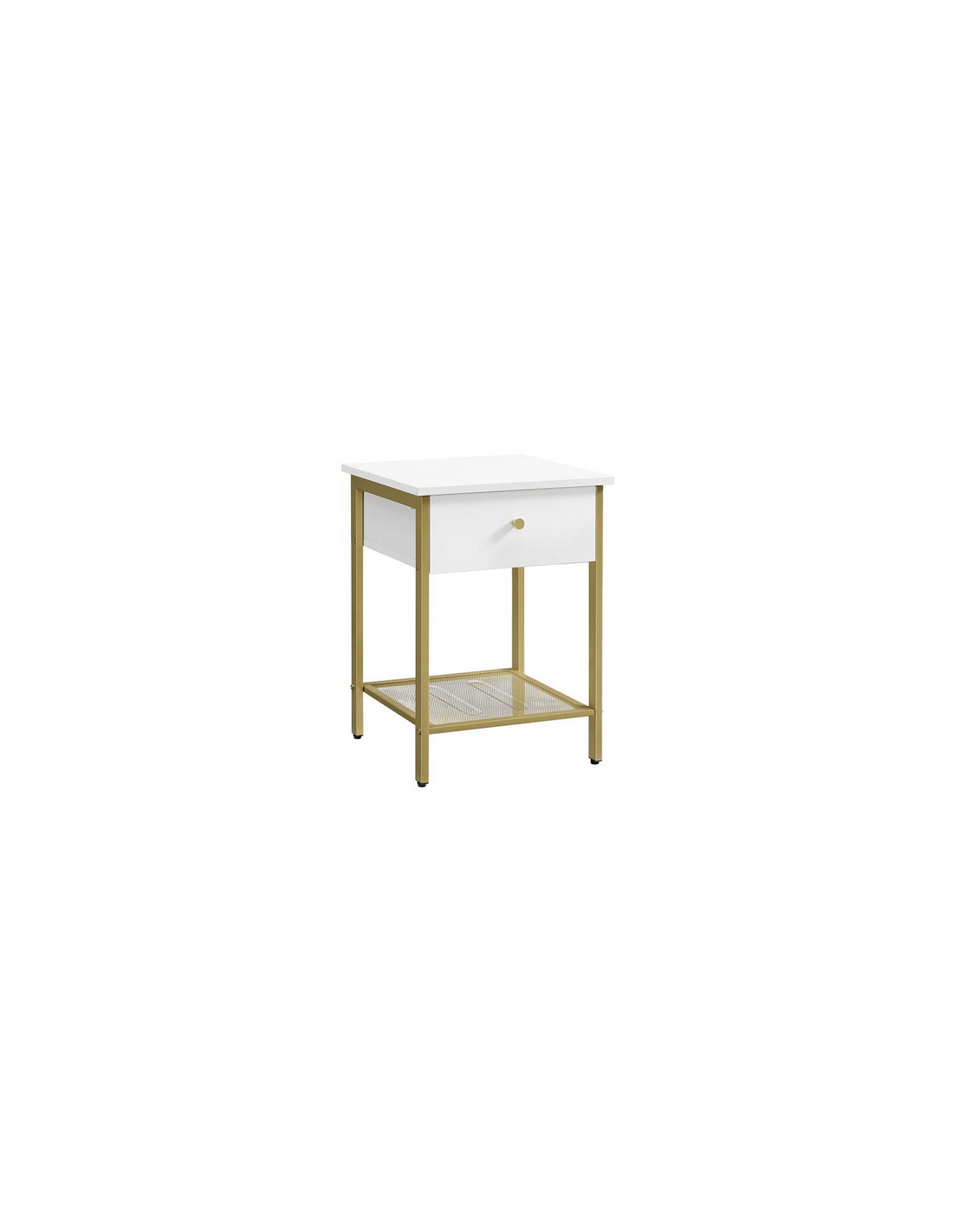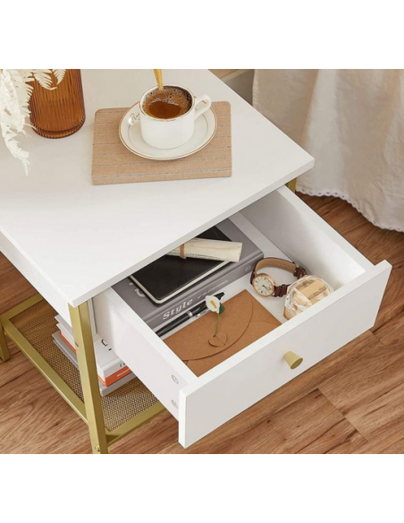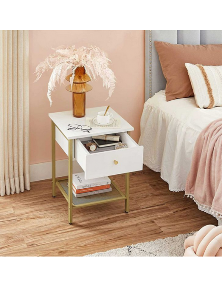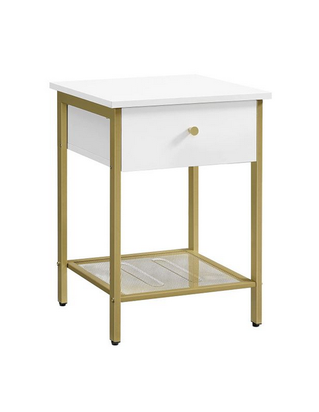 Sengebord udført i et design af guldfarvet metal og hvid møbelplade. Sengebordet måler 55 cm i højden og 40 x 40 cm i bredde og dybde.