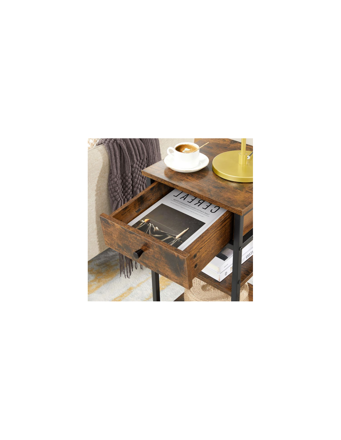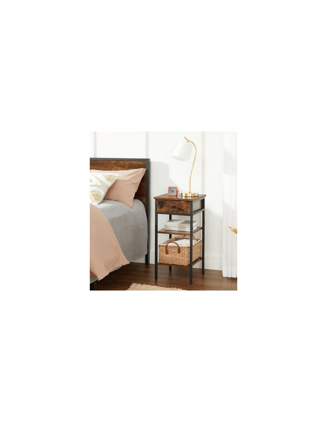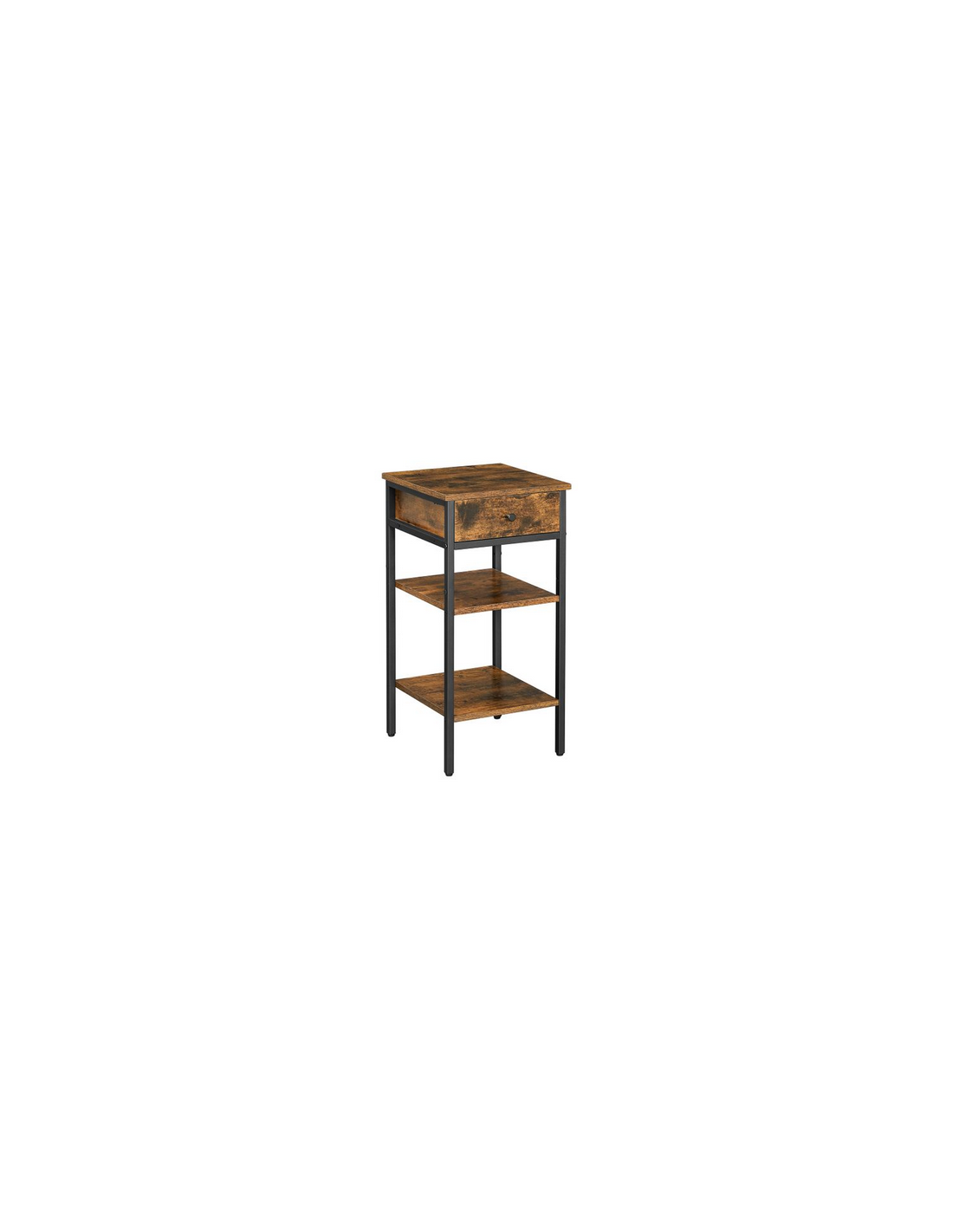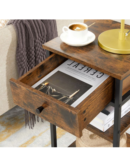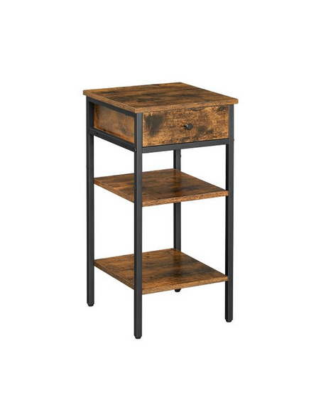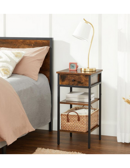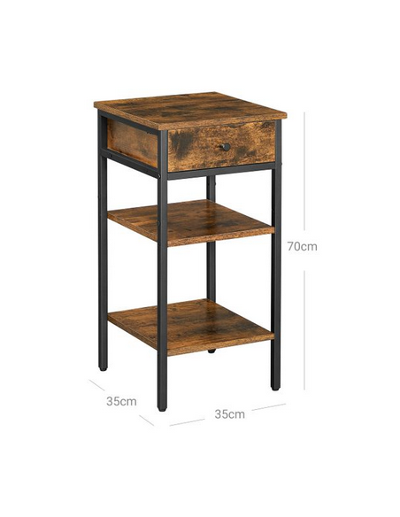 Sengebord udført i et design af sortlakeret metal og brun møbelplade. Sengebordet måler 70 cm i højden og 35 x 35 cm i bredde og dybde.