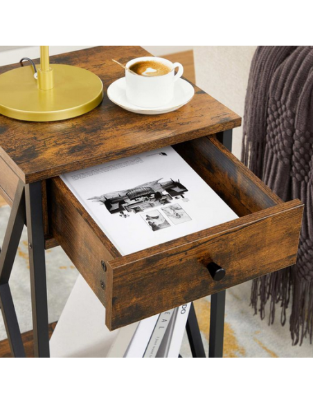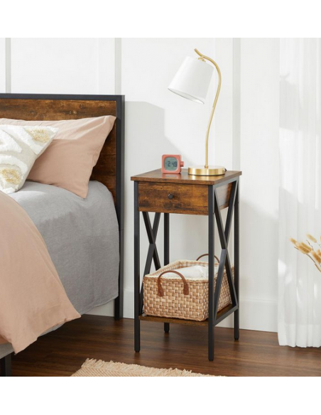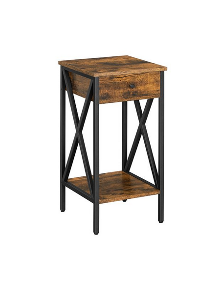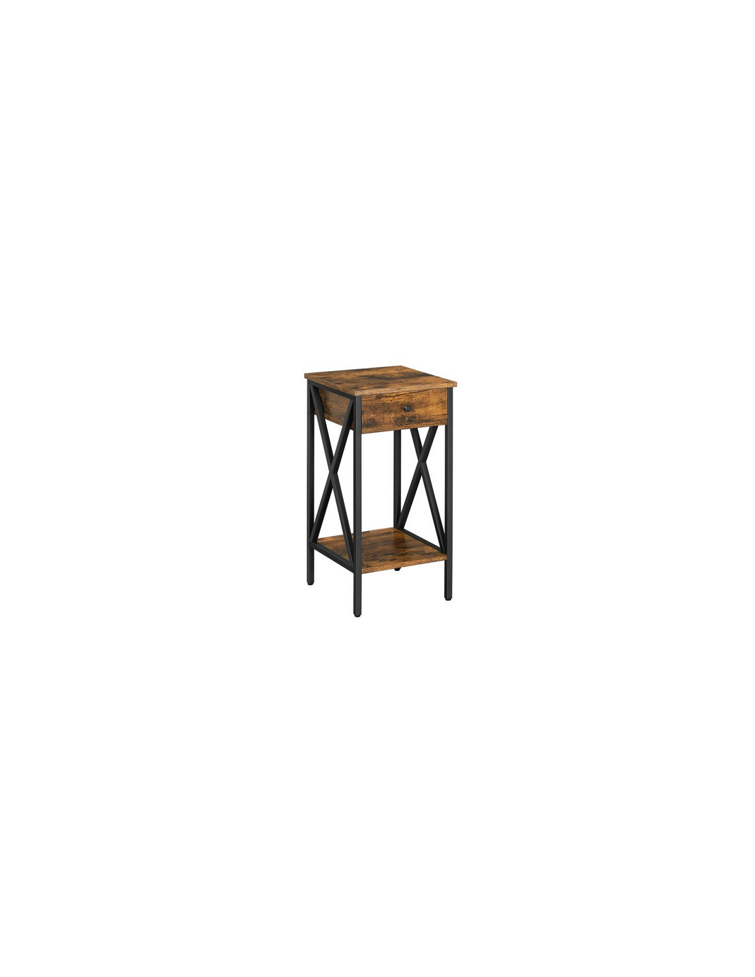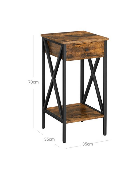 Sengebord udført i et design af sortlakeret metal og brun møbelplade. Sengebordet måler 70 cm i højden og 35 x 35 cm i bredde og dybde.