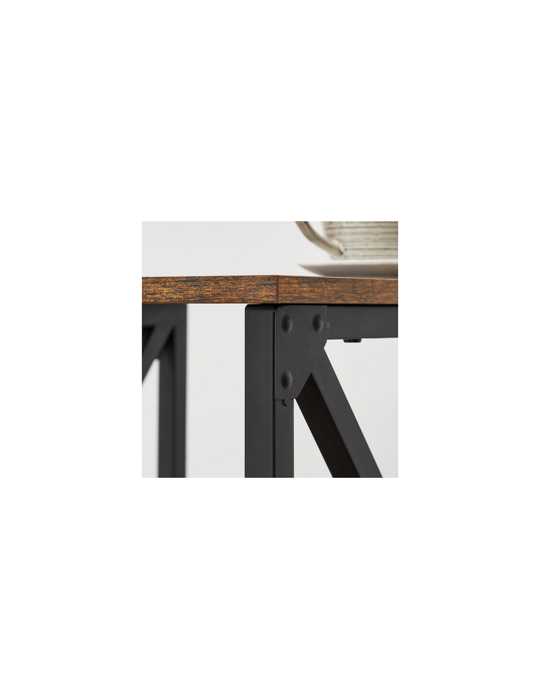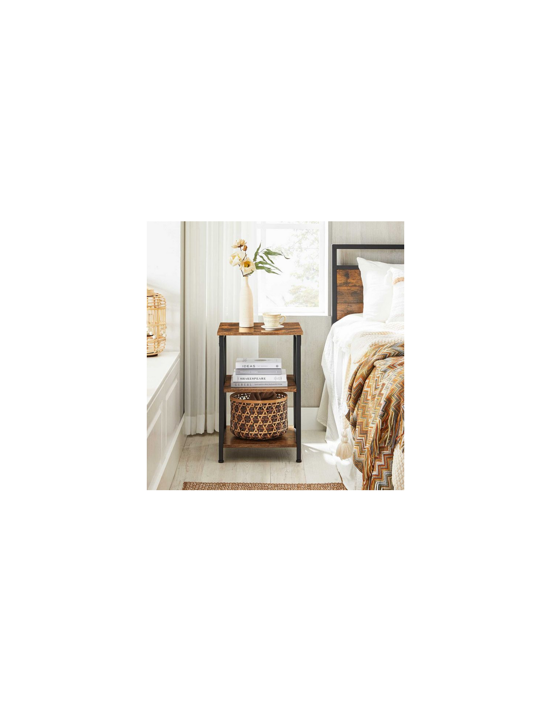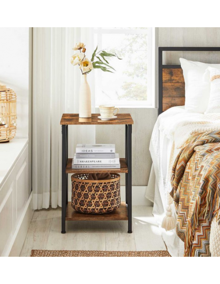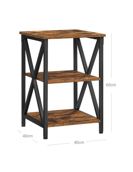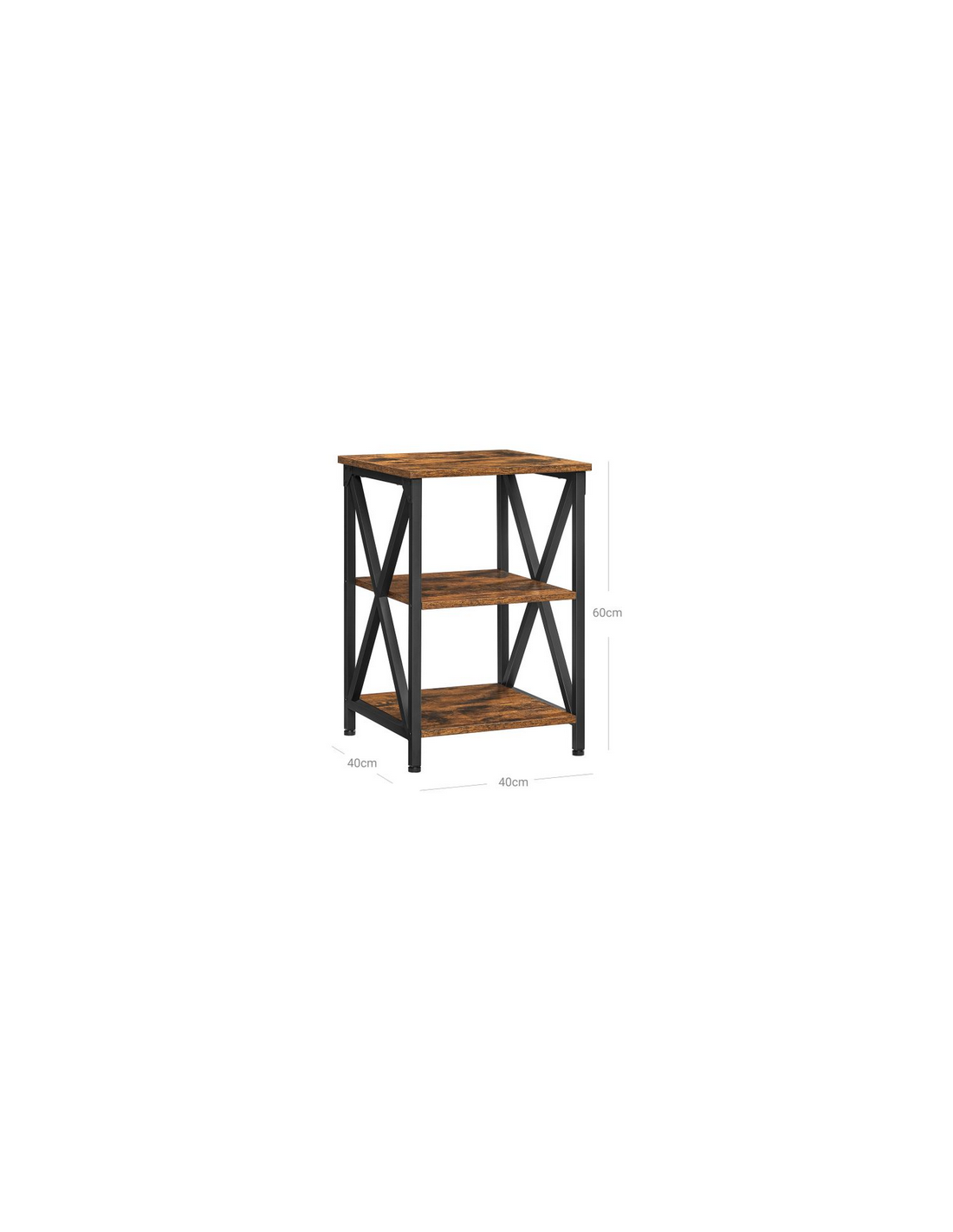 Sengebord udført i et design af sortlakeret metal og brun møbelplade. Sengebordet måler 60 cm i højden og 40 x 40 cm i bredde og dybde.