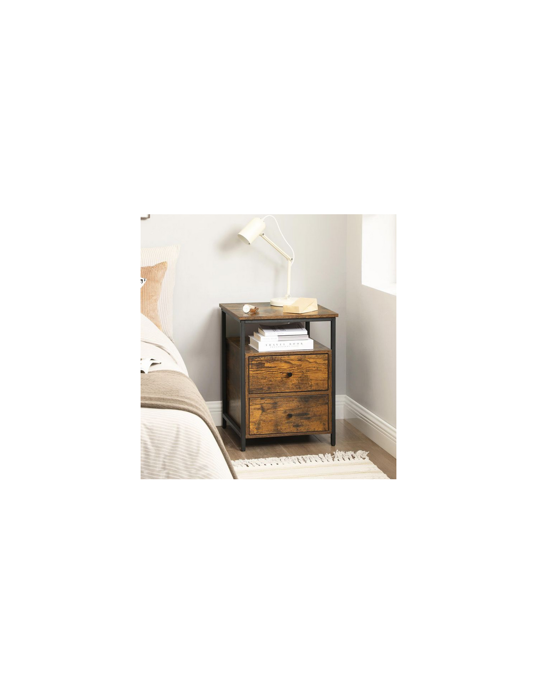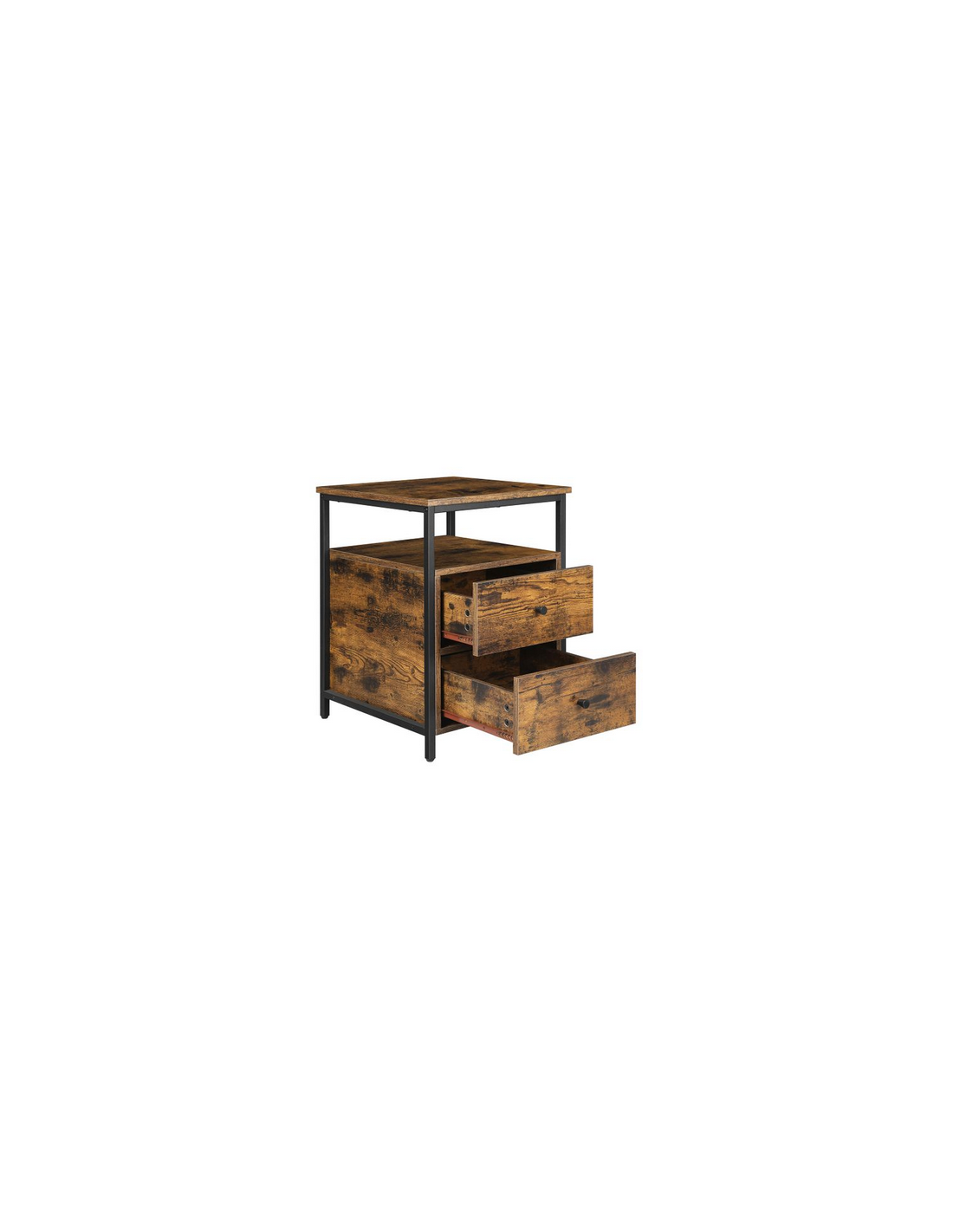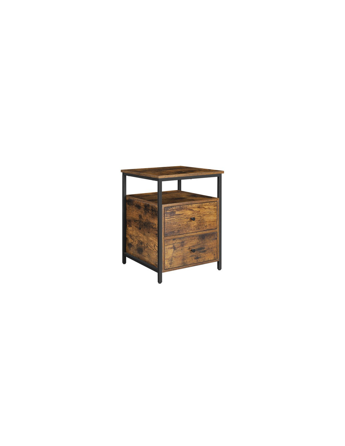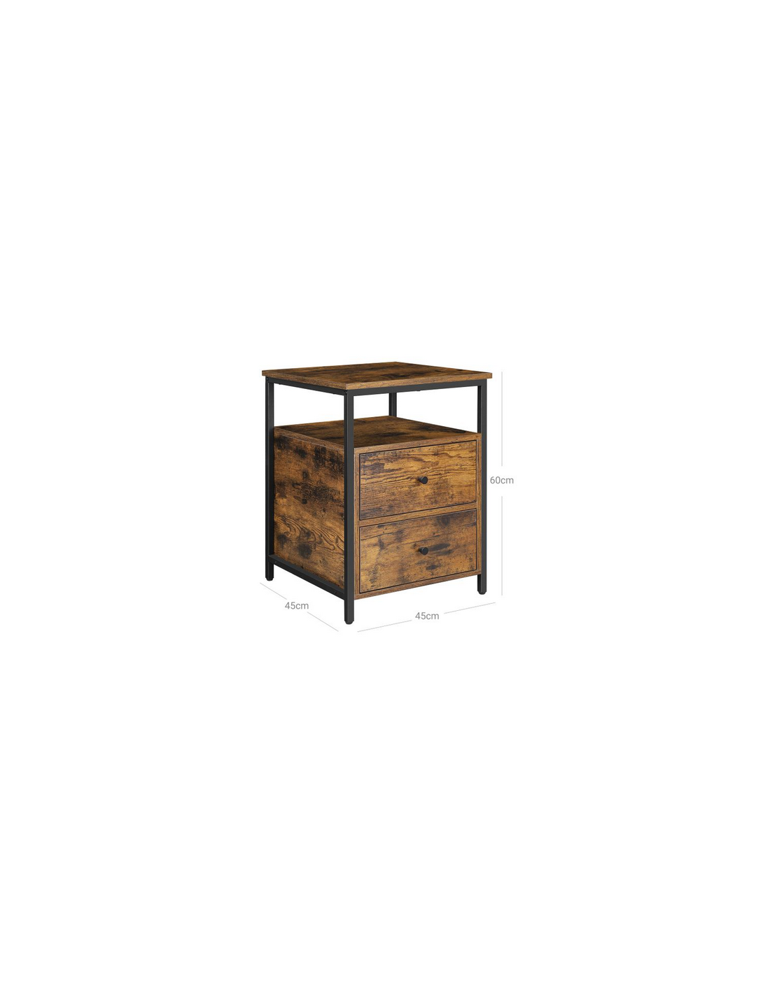 Sengebord udført i et design af sortlakeret metal og brun møbelplade. Sengebordet måler 60 cm i højden og 45 x 45 cm i bredde og dybde.