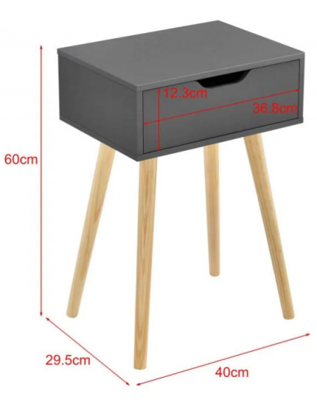 Sengebord udført i et design af træ og møbelplade. Sengebordet måler 60 cm i højden og 40 x 29,5 cm i bredde og dybde.