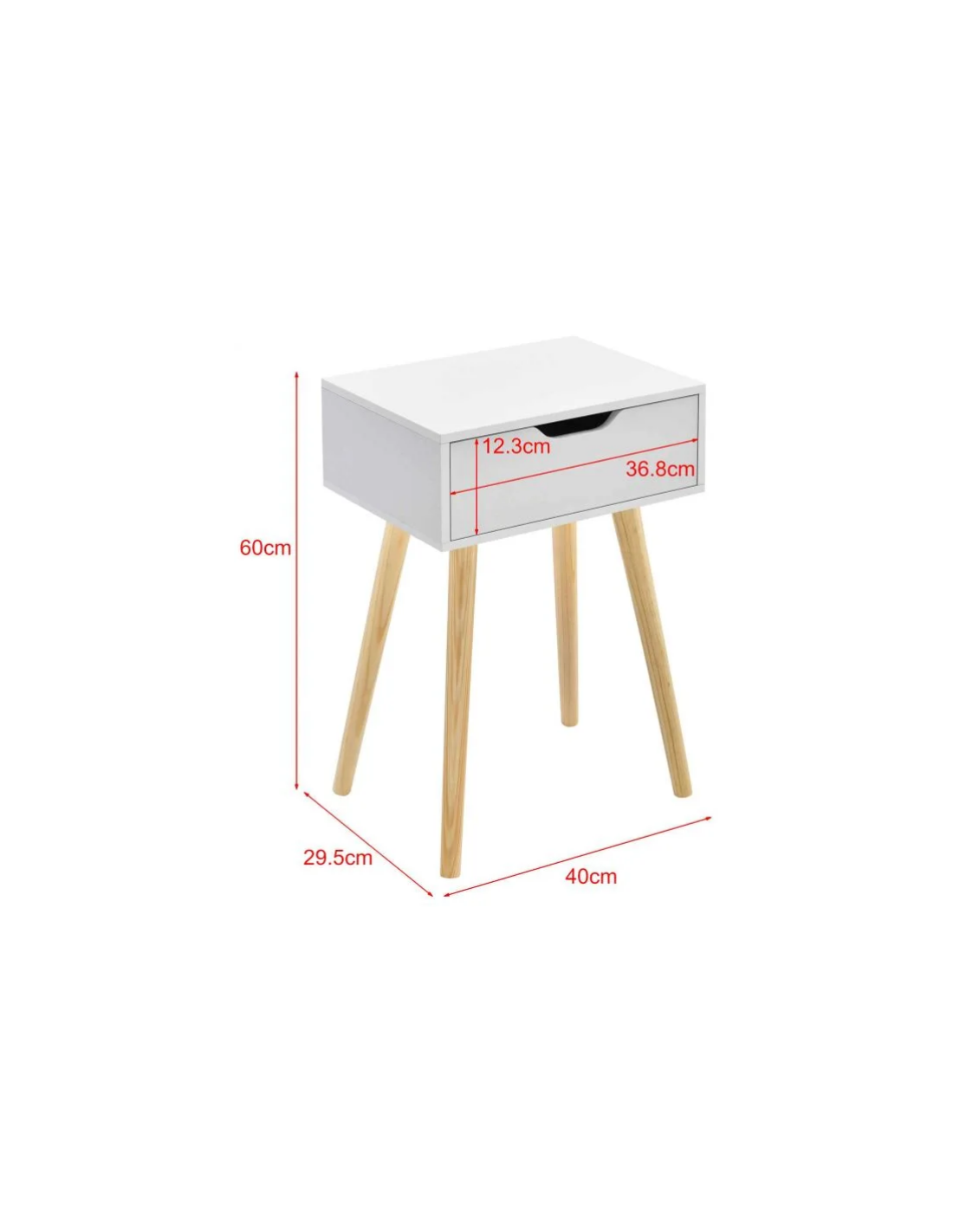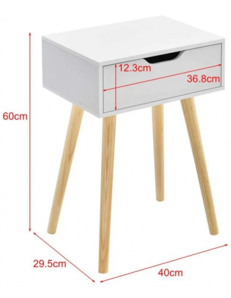 Sengebord udført i et design af træ og møbelplade. Sengebordet måler 60 cm i højden og 40 x 29,5 cm i bredde og dybde.