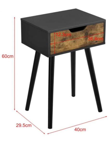 Sengebord udført i et design af træ og møbelplade. Sengebordet måler 60 cm i højden og 40 x 29,5 cm i bredde og dybde.