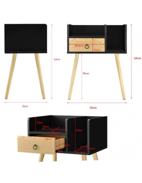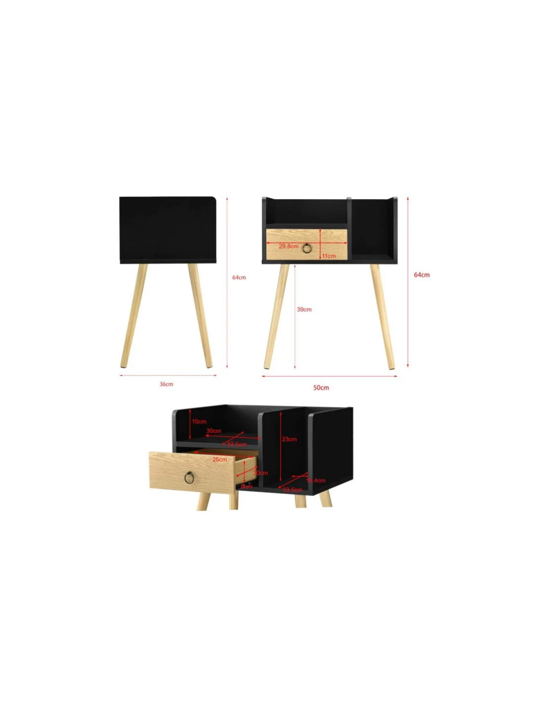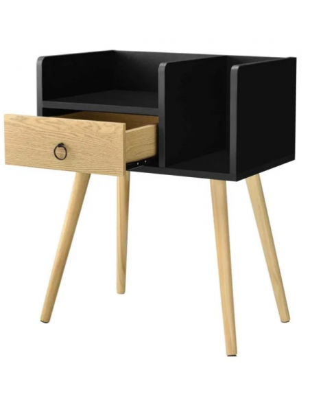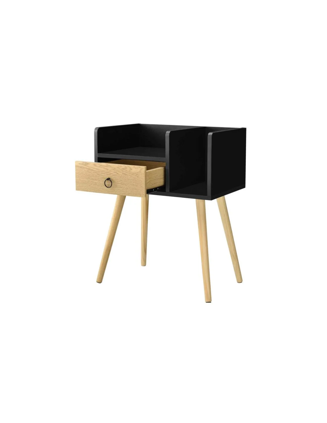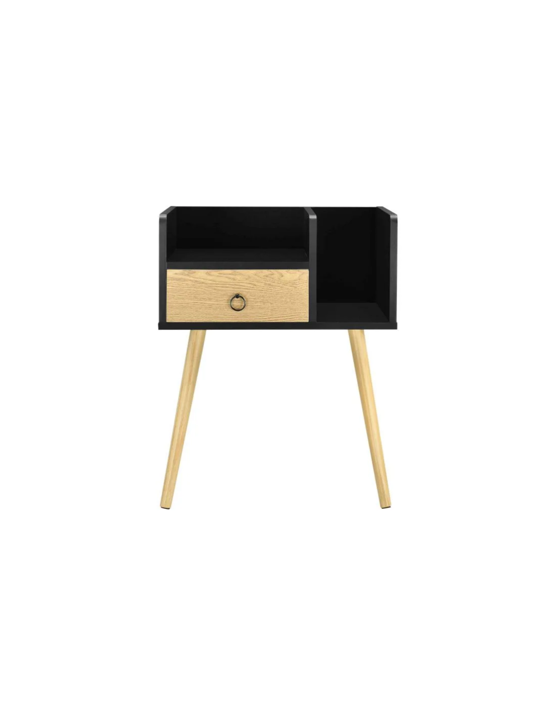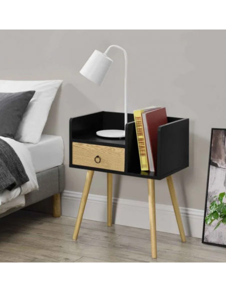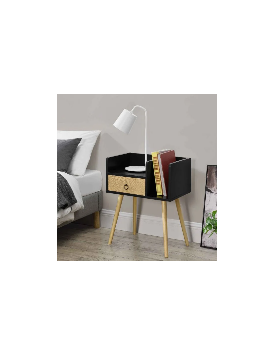 Sengebord udført i et design af naturfarvet træ og sort møbelplade. Sengebordet måler 64 cm i højden og 50 x 36 cm i bredde og dybde.