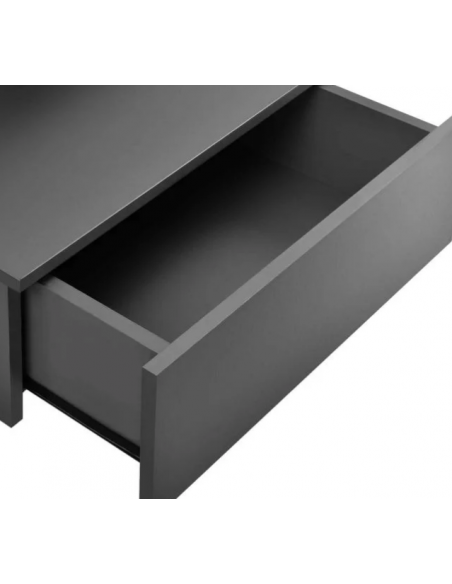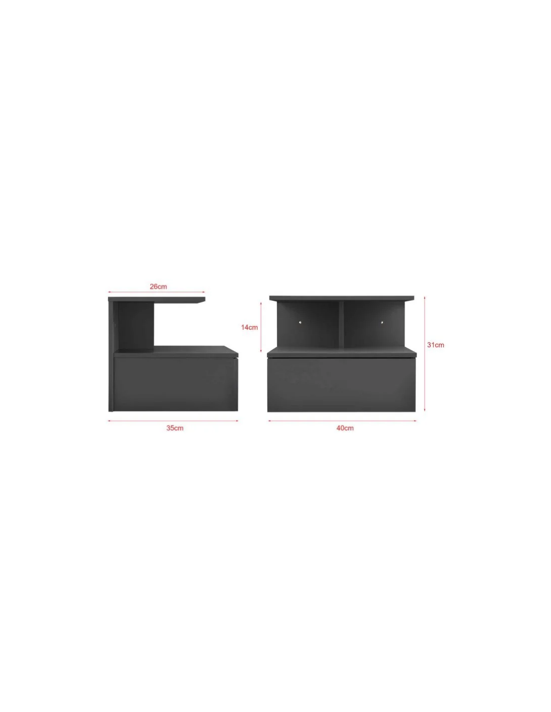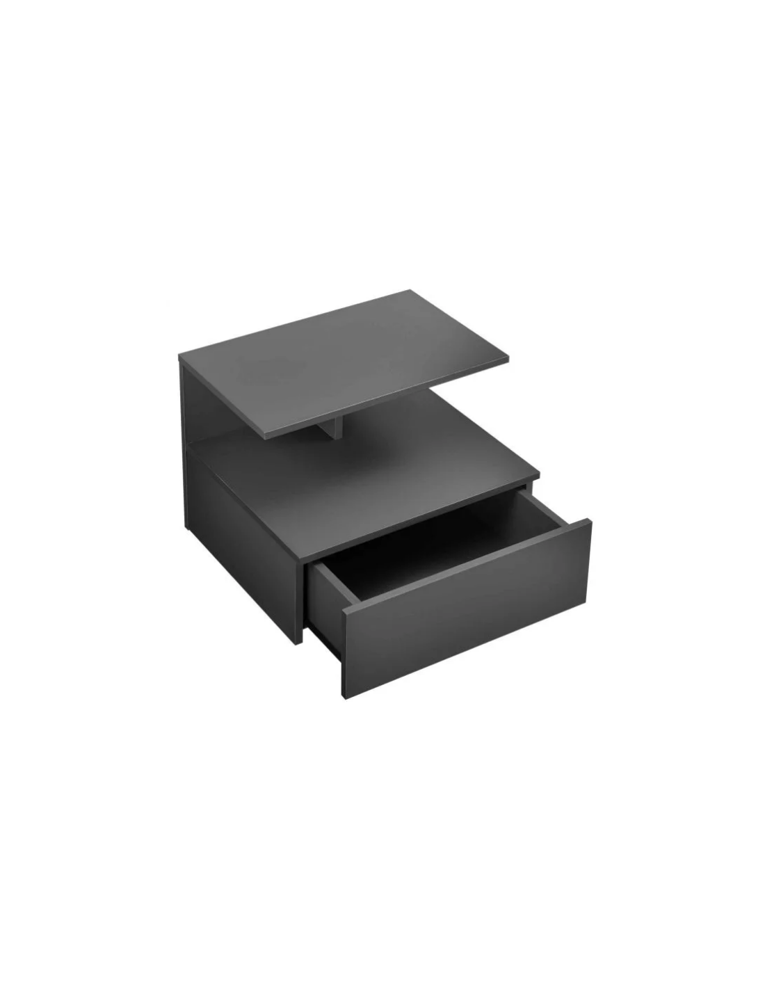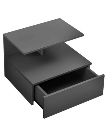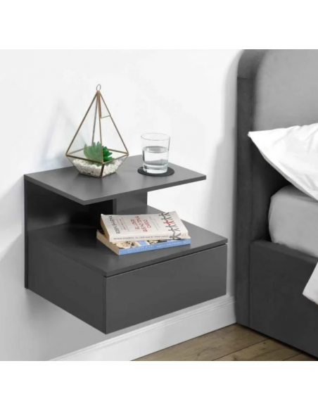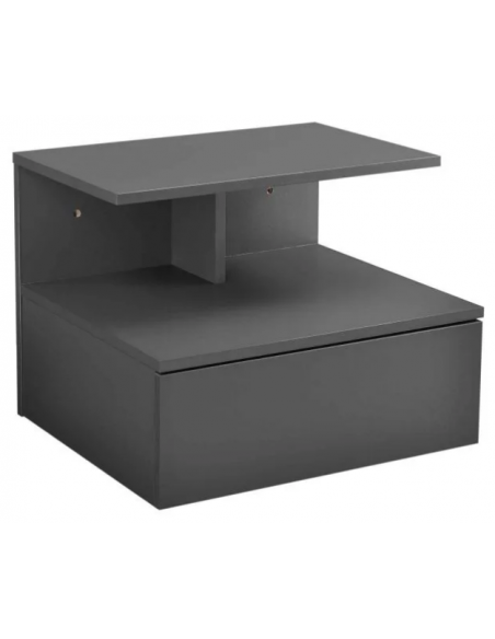 Væghængt sengebord udført i et design af mørkegrå møbelplade. Sengebordet måler 31 cm i højden og 40 x 35 cm i bredde og dybde.