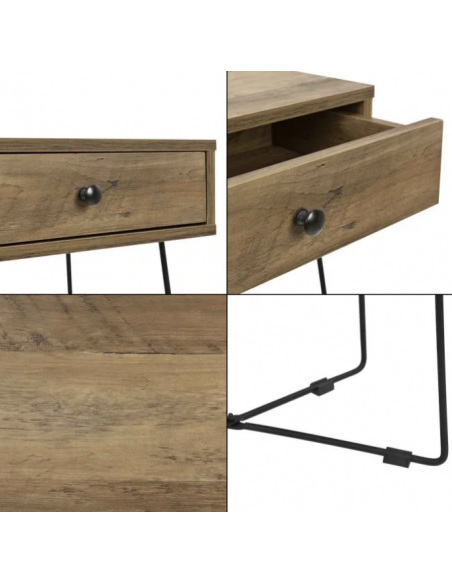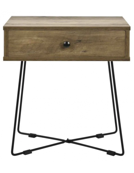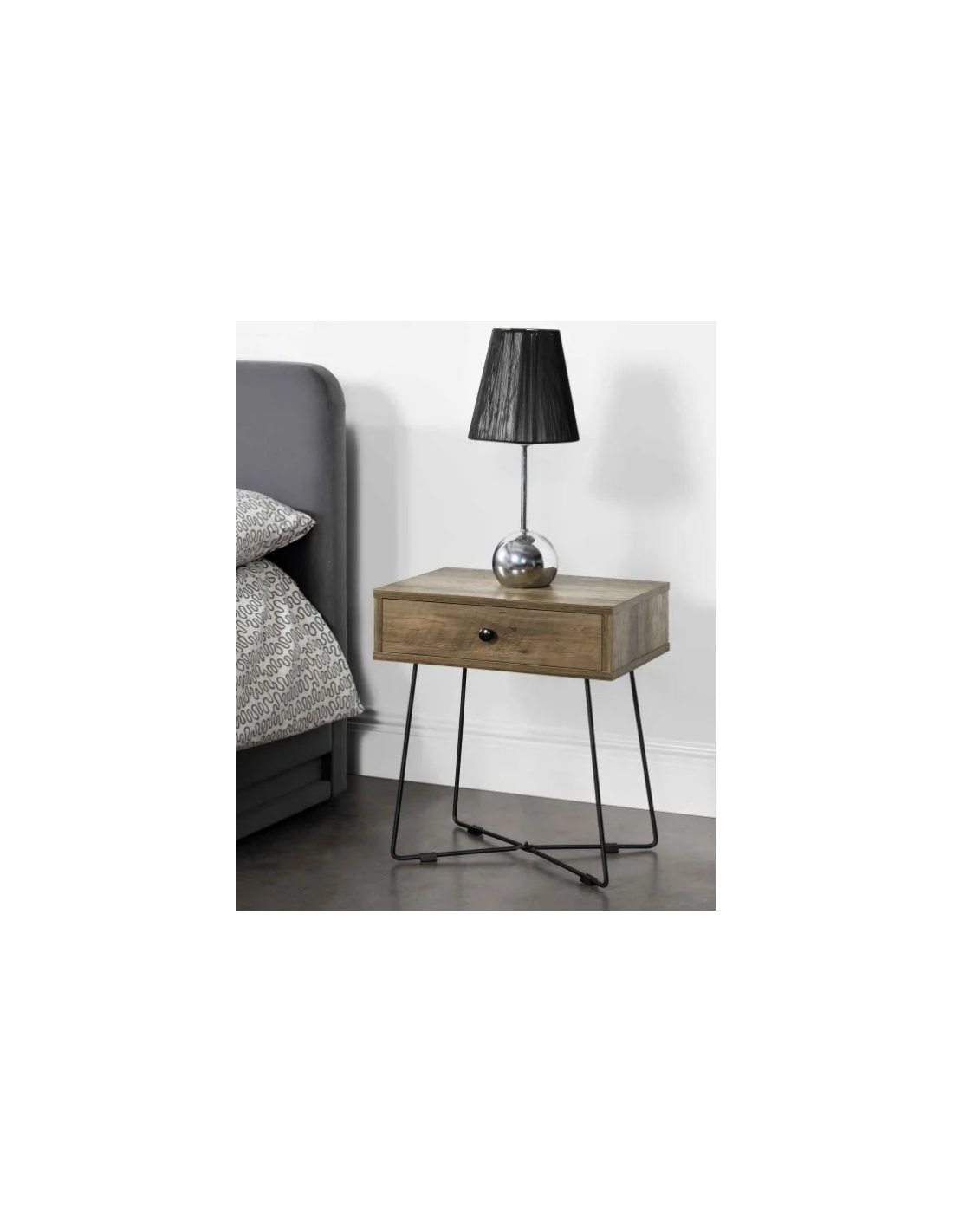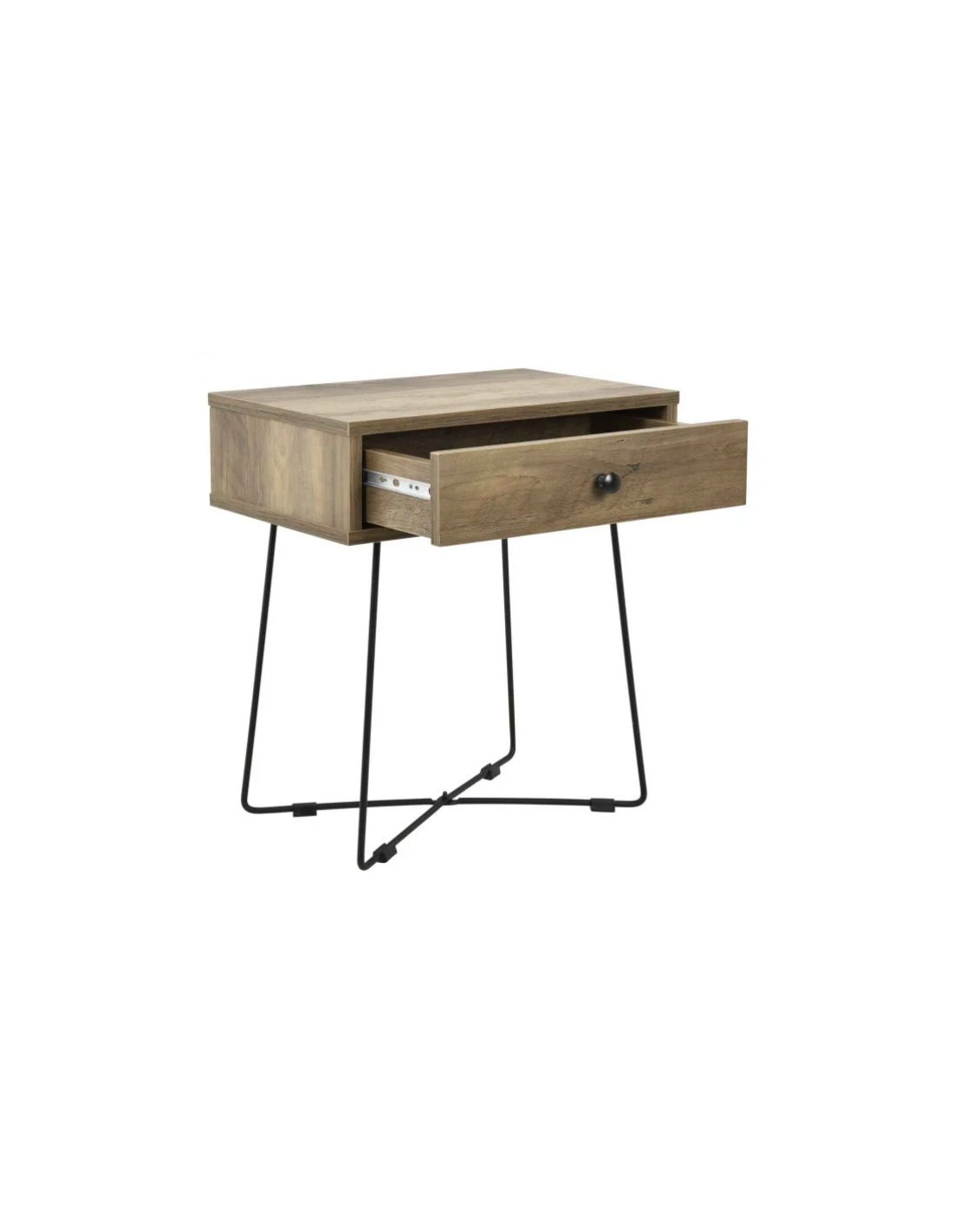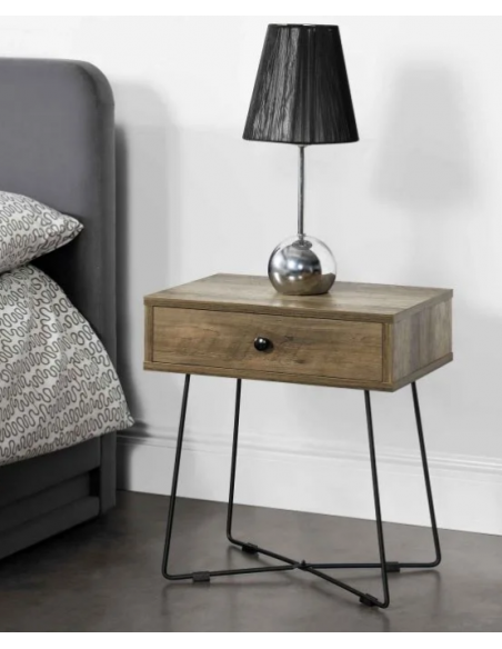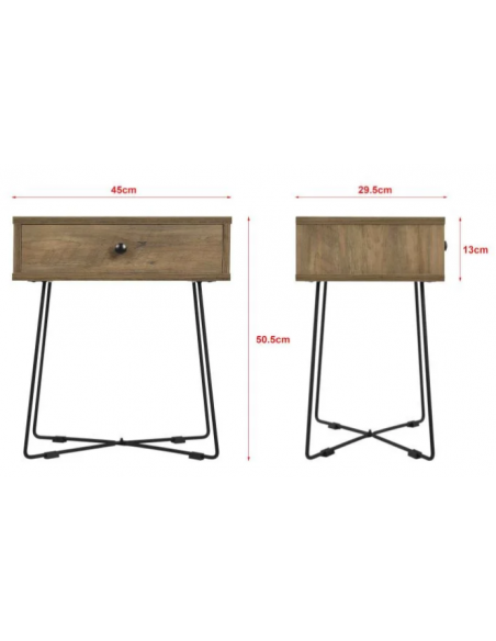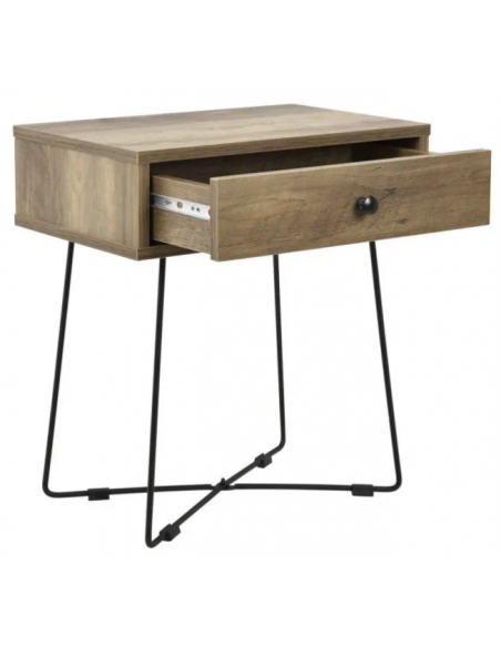 Sengebord udført i et design af sortlakeret metal og naturfarvet møbelplade. Sengebordet måler 50,5 cm i højden og 45 x 29,5 cm i bredde og dybde.