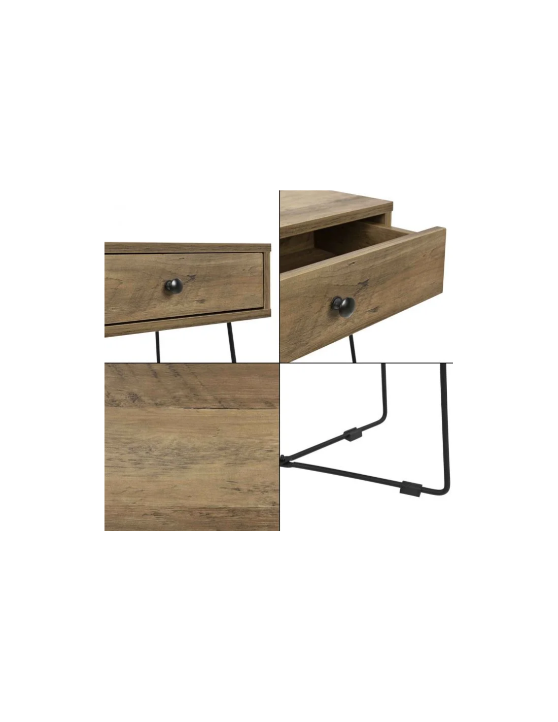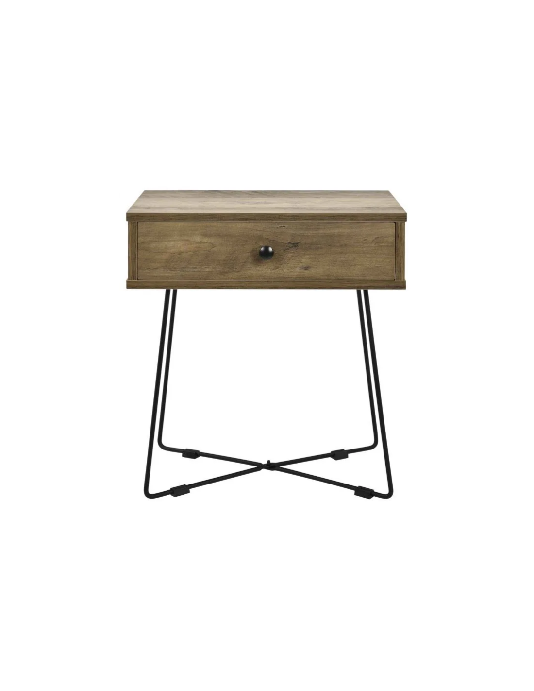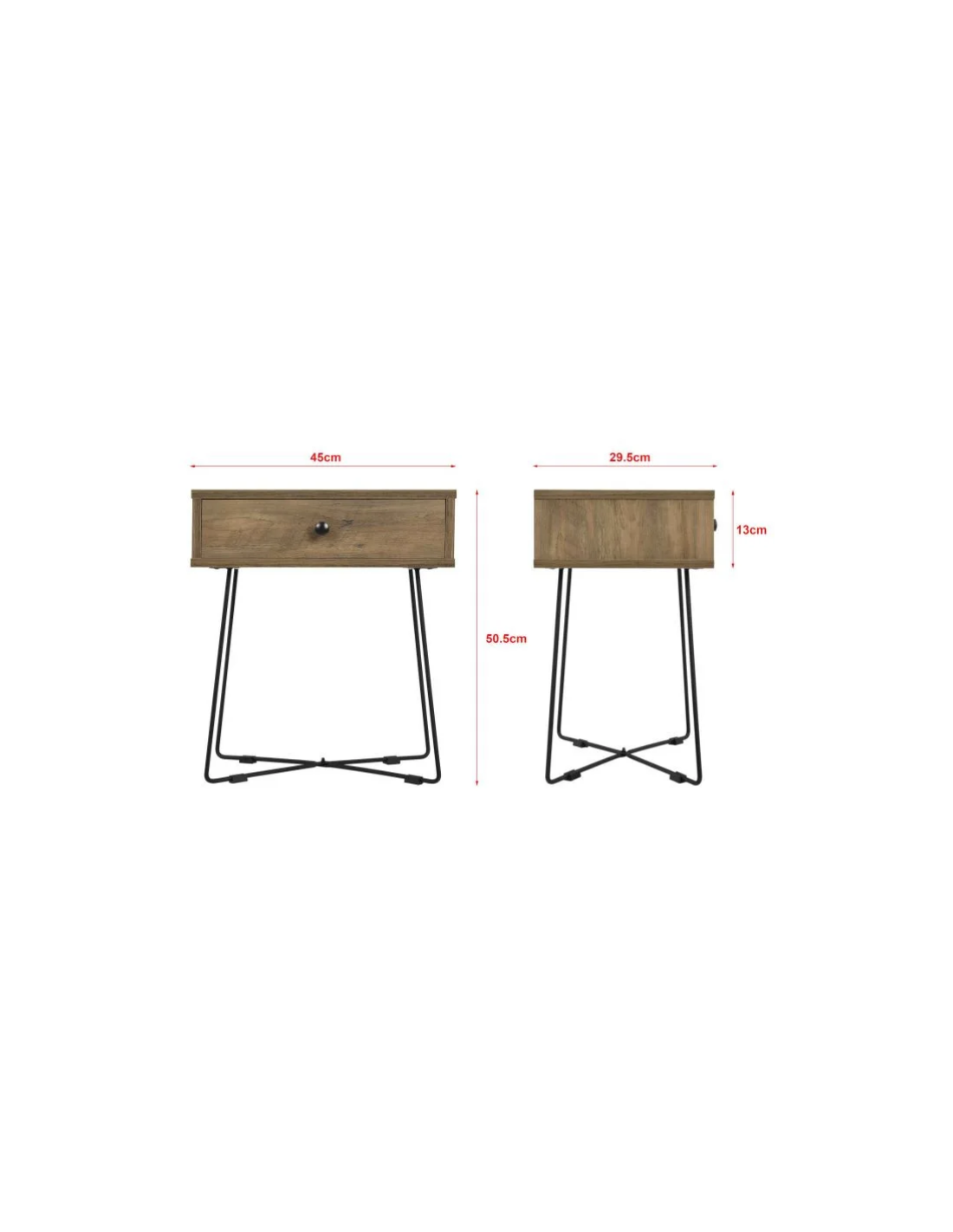Sengebord udført i et design af sortlakeret metal og naturfarvet møbelplade. Sengebordet måler 50,5 cm i højden og 45 x 29,5 cm i bredde og dybde.