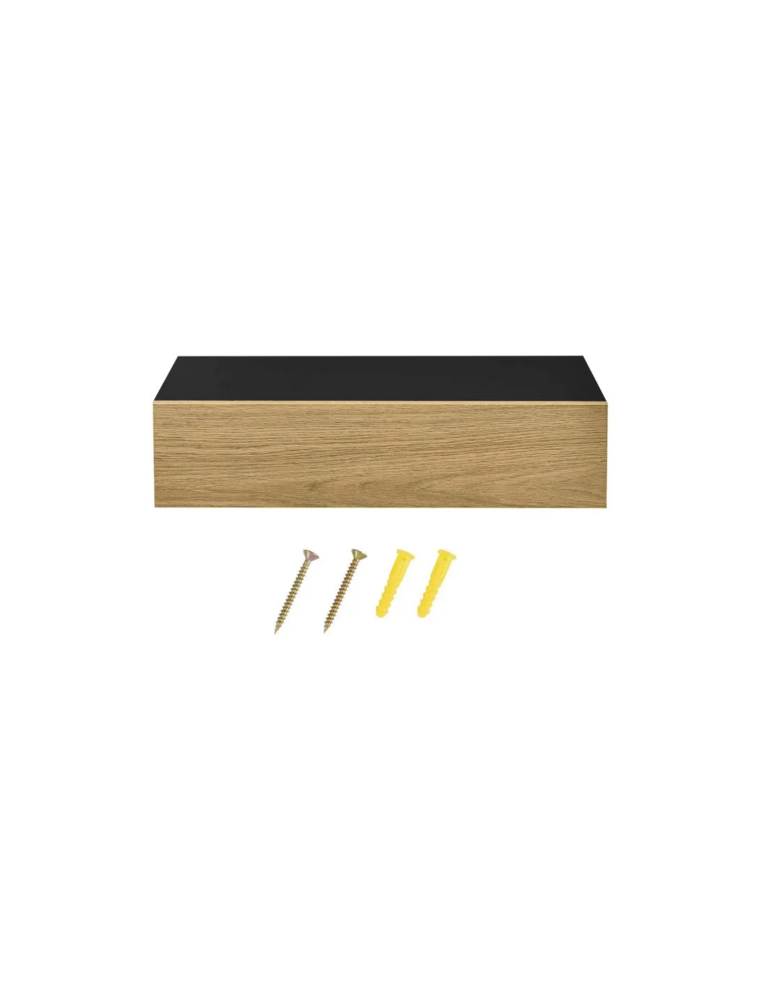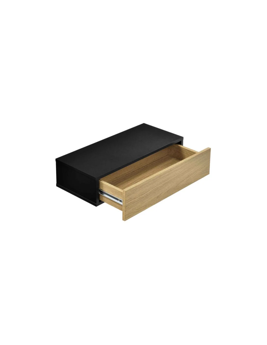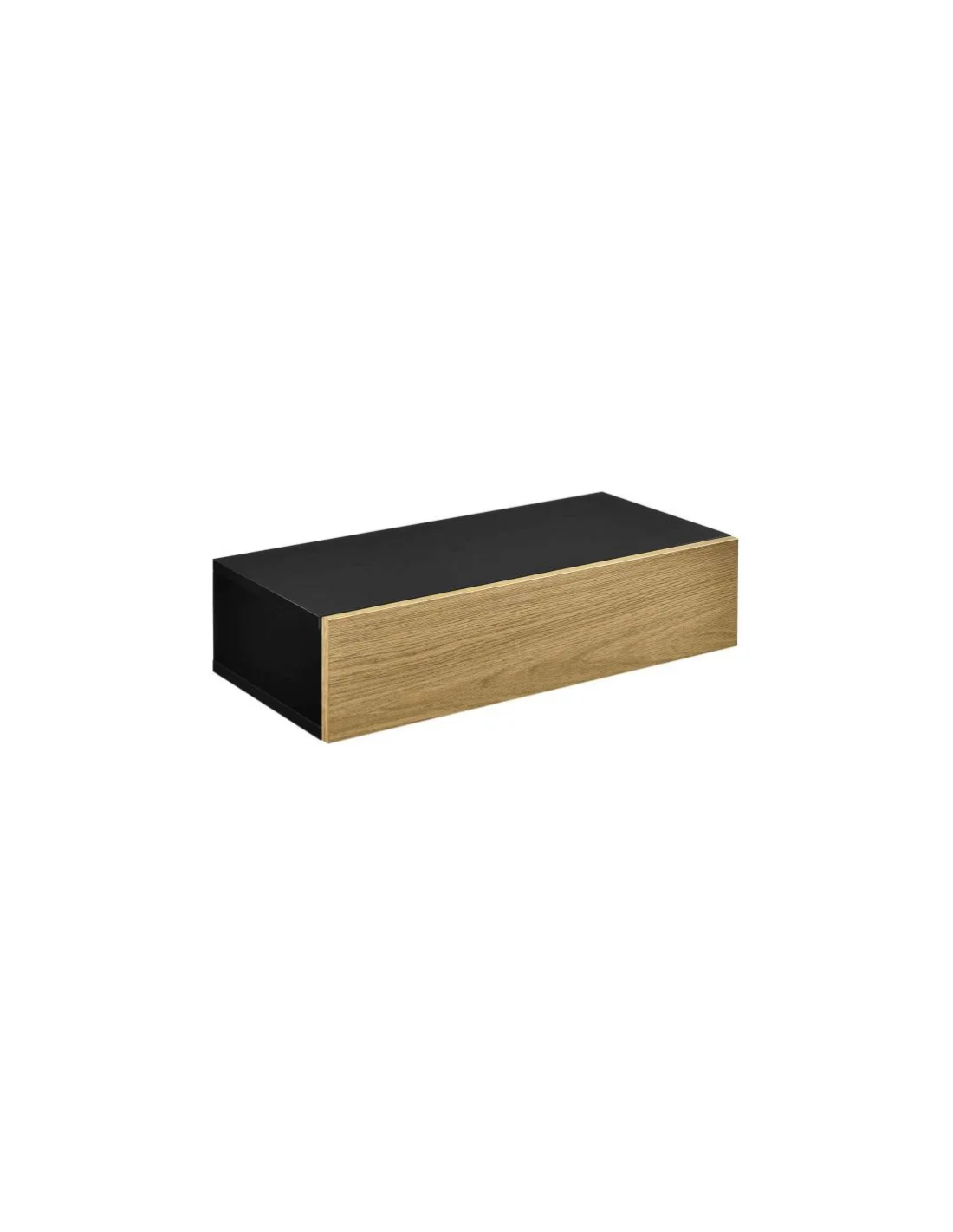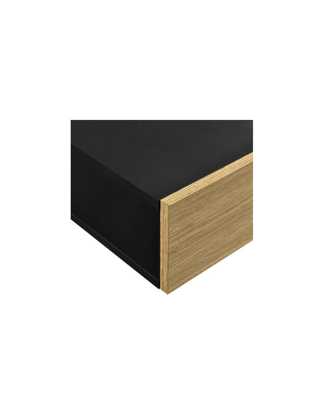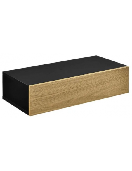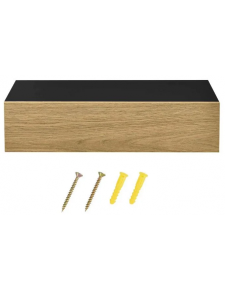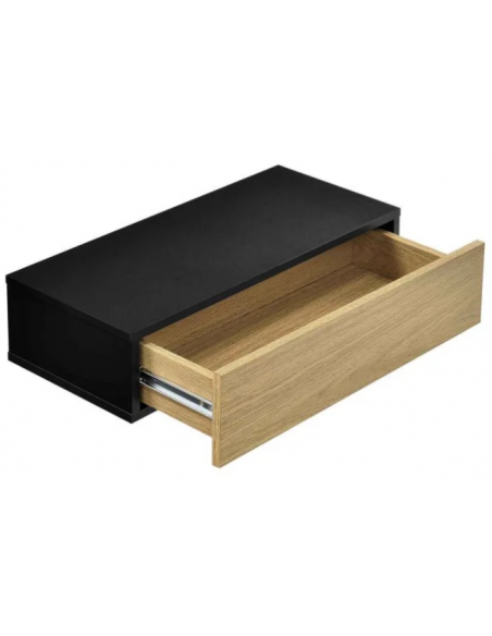 Sæt med 2 væghængte sengeborde, udført i et design af sort og naturfarvet møbelplade. Sengebordet måler 12 cm i højden og 50 x 24 cm i bredde og dybde.